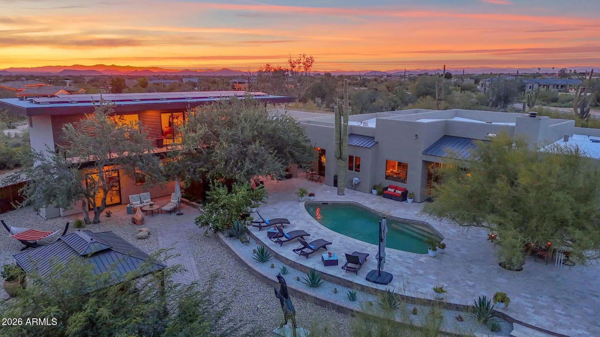 Welcome to De Corazon, a unique opportunity to own a thoughtfully curated desert estate in the heart of North Scottsdale. Set on just under 2 acres, this is truly an Arizona lifestyle home offering authentic Santa Fe style with 2 bedrooms plus office & 2 baths in the main house, and a separate 2-level guest house / studio space recently completed in 2022. For hobby enthusiasts and car lovers, the expansive garages provide a perfect place to work on projects, store your desert toys or create a showroom for your collections. Set back with a private entry courtyard, the main entryway is inviting, highlighted by curated desert landscaping, architectural character, and subtle lighting. Inside, ample living & dining areas with a custom stone fireplace are the focal point of this special property with a warm desert palette and stunning panoramic views to the back yard and mountain backdrop. The gourmet kitchen is truly the heart of the home with artisan tile work, luxurious dining island and top of the line appliances. Throughout the main areas the ceiling detail, quality craftsmanship and organic materials make this property perfect for quiet evenings and entertaining alike. Split floor plan features intimate primary retreat with beautifully appointed bath, additional guest bedroom with walk-in closet, full bath and den with closet which can be considered a 3rd bedroom. There is a 2-car garage serving the main house. A second structure was built in 2022, keeping design continuity with the main house with more contemporary elements. The first floor boasts a fully appointed guest house with large living area, kitchen, bedroom with 2 closets and full bath, all sharing the beautiful back yard views. Steel exterior staircase leads to a perfectly flexible space currently used as a custom design studio, featuring a powder room and kitchenette. This layout can be designed according to how you live - for work, play or additional guest accommodations. Six extended length over-height garage spaces round out the structure's layout, with extensive storage areas and room for lifts. Anchoring the two homes is an extraordinary celebration of outdoor living, completely reimagined to offer multiple entertaining areas including a refreshing pool and custom pergola with fire pit. This desert compound has it all: authentic elements, quality workmanship, modern conveniences and abundant outdoor living, all within minutes from Scottsdale's best shopping, dining and signature events. Welcome Home!
