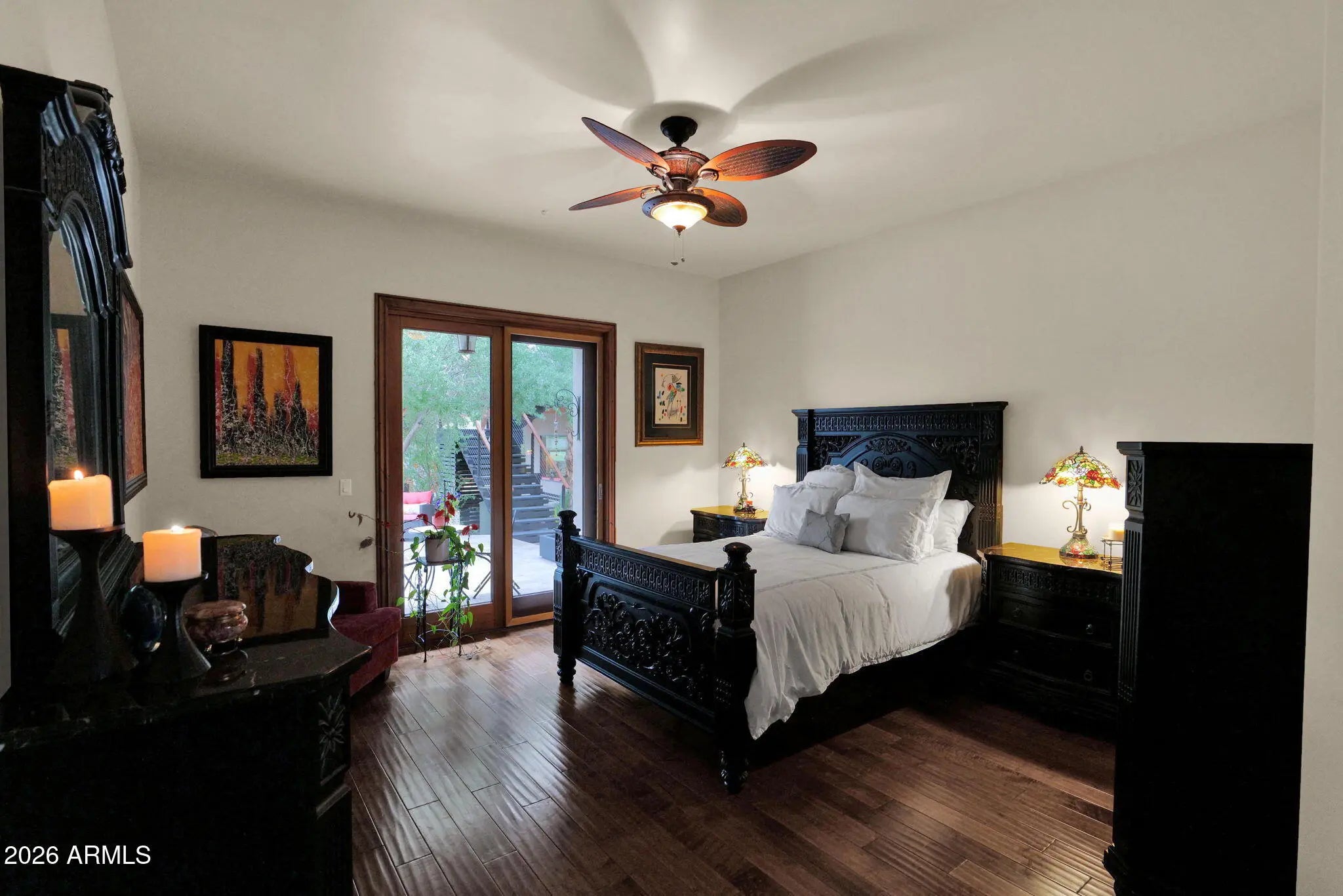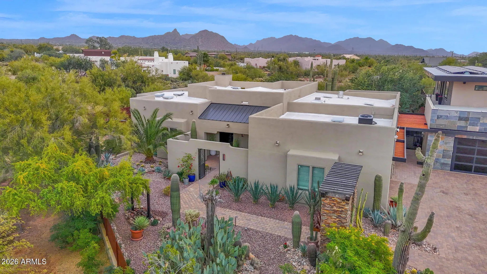 Welcome to De Corazon, a unique opportunity to own a thoughtfully curated desert estate in the heart of North Scottsdale. Set on just under 2 acres, this is truly an Arizona lifestyle home offering authentic Santa Fe style with 2 bedrooms plus office & 2 baths in the main house, and a separate 2-level guest house / studio space recently completed in 2022. For hobby enthusiasts and car lovers, the expansive garages provide a perfect place to work on projects, store your desert toys or create a showroom for your collections. Set back with a private entry courtyard, the main entryway is inviting, highlighted by curated desert landscaping, architectural character, and subtle lighting. Inside, ample living & dining areas with a custom stone fireplace are the focal point of this special property with a warm desert palette and stunning panoramic views to the back yard and mountain backdrop. The gourmet kitchen is truly the heart of the home with artisan tile work, luxurious dining island and top of the line appliances. Throughout the main areas the ceiling detail, quality craftsmanship and organic materials make this property perfect for quiet evenings and entertaining alike. Split floor plan features intimate primary retreat with beautifully appointed bath, additional guest bedroom with walk-in closet, full bath and den with closet which can be considered a 3rd bedroom. There is a 2-car garage serving the main house. A second structure was built in 2022, keeping design continuity with the main house with more contemporary elements. The first floor boasts a fully appointed guest house with large living area, kitchen, bedroom with 2 closets and full bath, all sharing the beautiful back yard views. Steel exterior staircase leads to a perfectly flexible space currently used as a custom design studio, featuring a powder room and kitchenette. This layout can be designed according to how you live - for work, play or additional guest accommodations. Six extended length over-height garage spaces round out the structure's layout, with extensive storage areas and room for lifts. Anchoring the two homes is an extraordinary celebration of outdoor living, completely reimagined to offer multiple entertaining areas including a refreshing pool and custom pergola with fire pit. This desert compound has it all: authentic elements, quality workmanship, modern conveniences and abundant outdoor living, all within minutes from Scottsdale's best shopping, dining and signature events. Welcome Home!