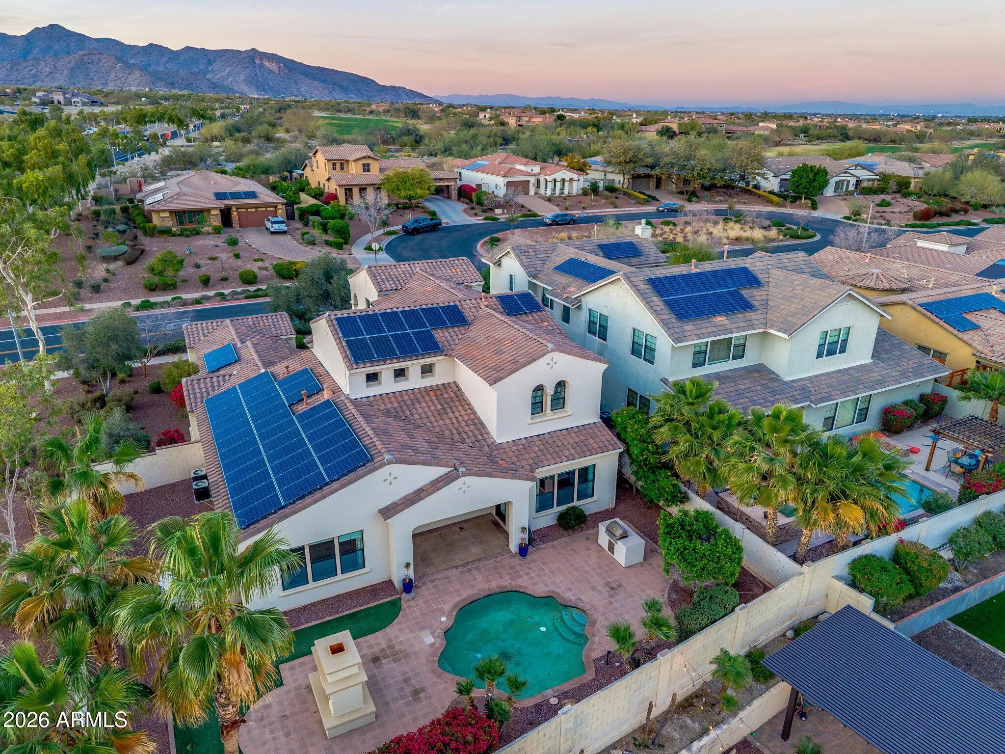 Former model home in Verrado with owned solar, a pool, and thoughtful upgrades throughout. The front entry opens to soaring ceilings and arch architectural details that immediately set the tone. The family room feels warm and inviting with a fireplace, coffered ceiling. The kitchen is designed to be lived in, featuring rich cabinetry, granite countertops, stainless steel appliances, a custom refrigerator becomes the gathering spot. The owner's suite is located on the first floor and offers privacy with a soaking tub, separate shower, and dual vanities. A guest suite and private den complete the main level. Upstairs includes two additional bedrooms, an office nook, and a huge bonus room with a balcony and mountain views. The backyard offers a pool, outdoor fireplace, built in BBQ, and space to enjoy Arizona evenings.