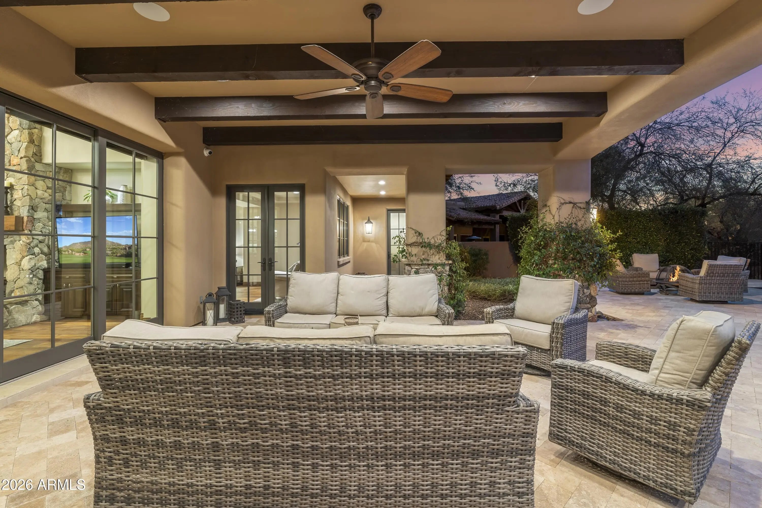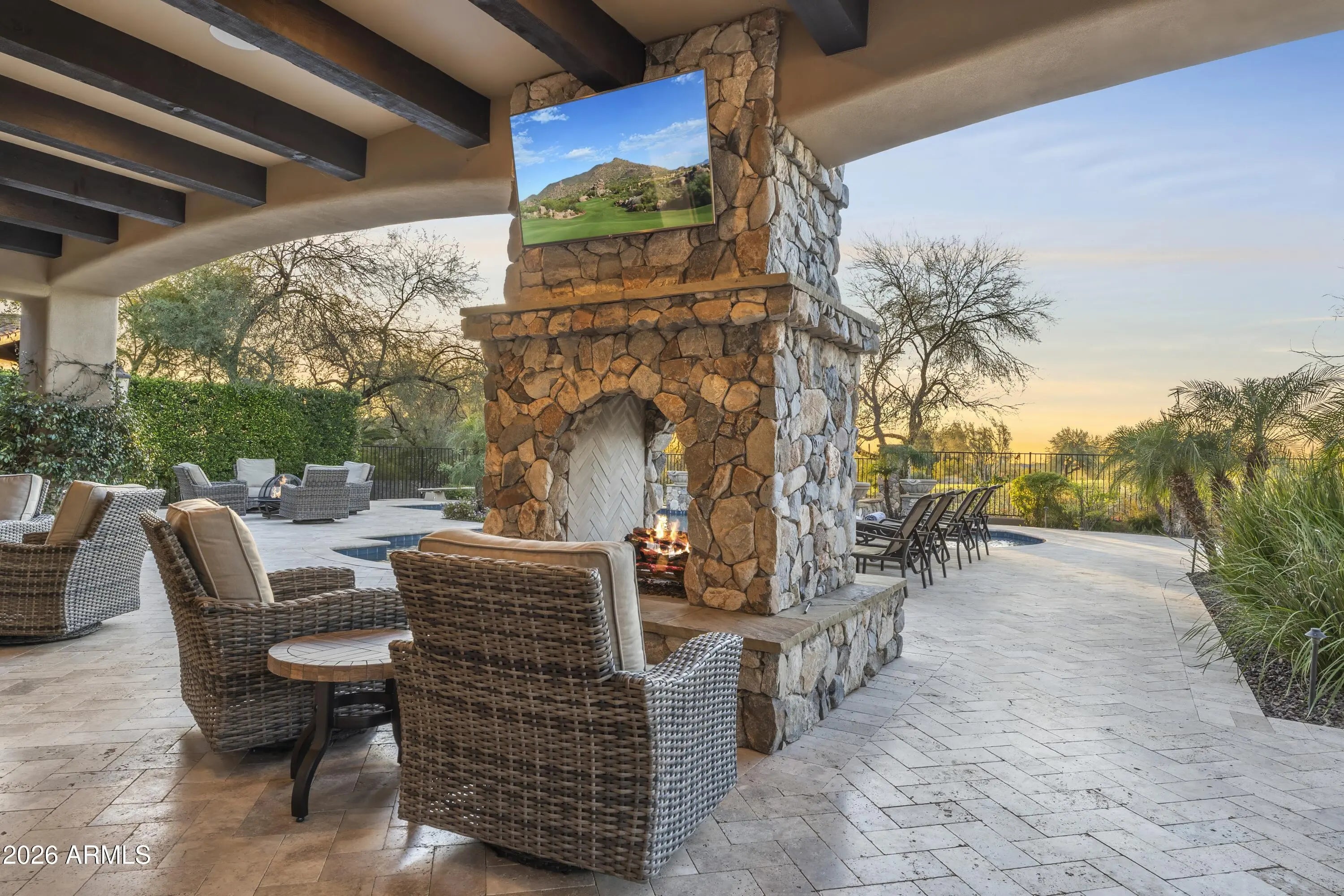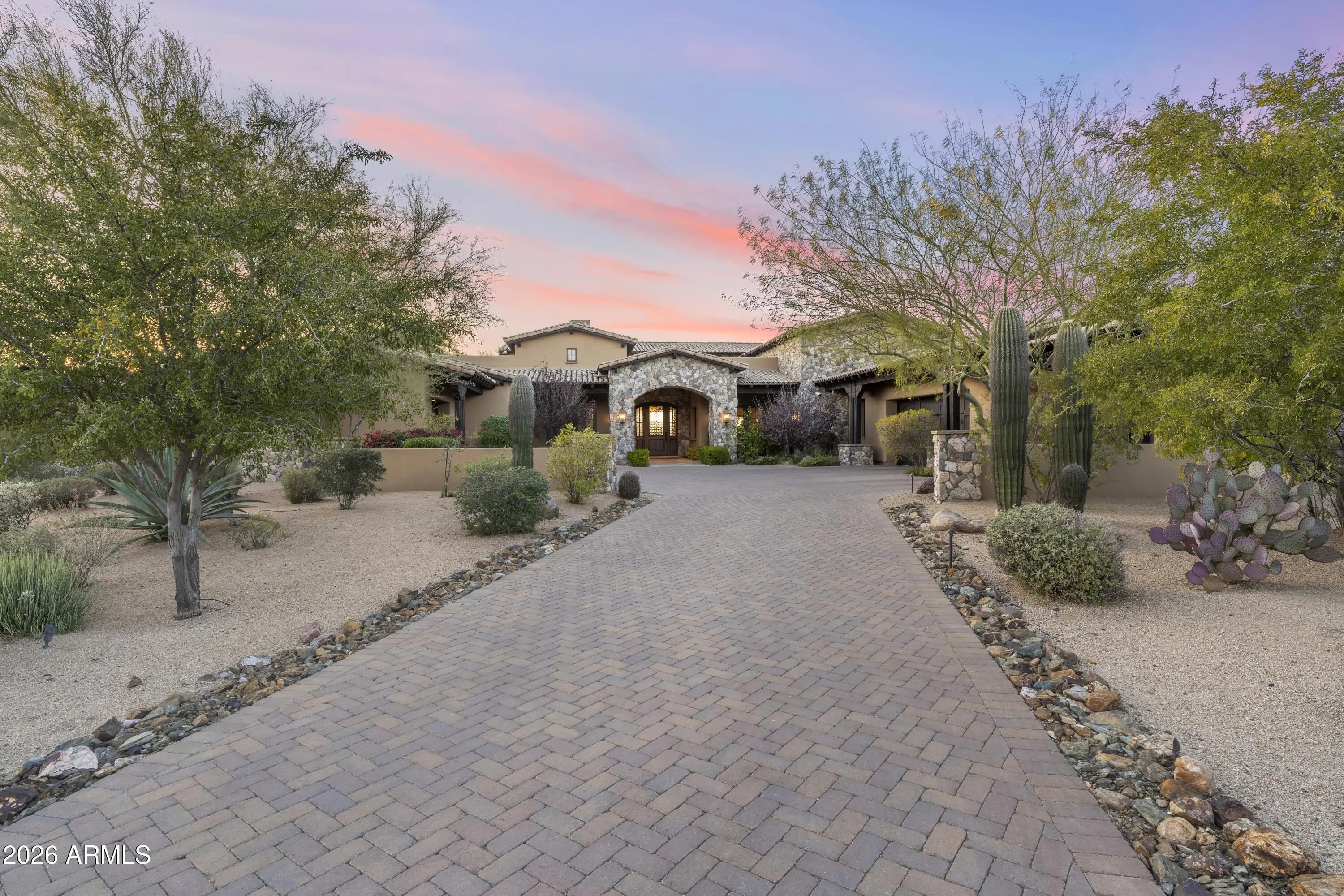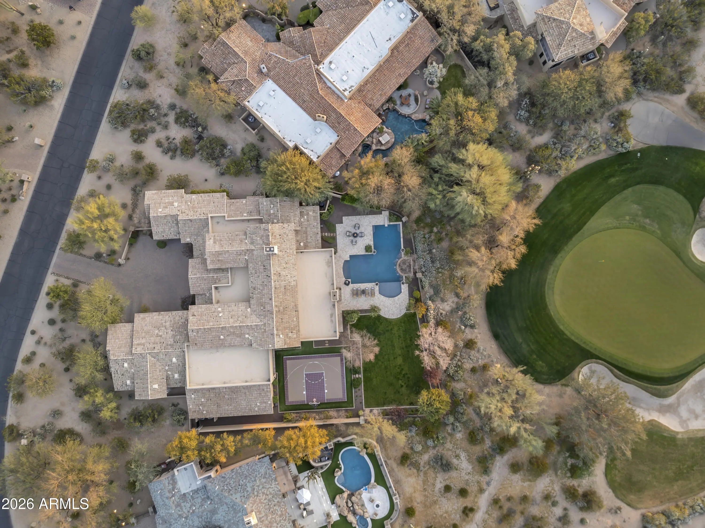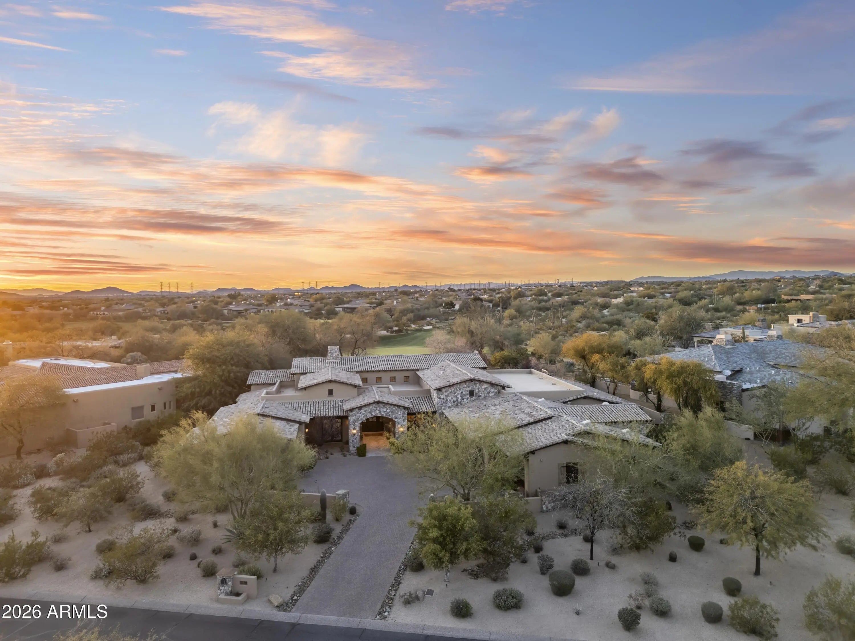 Positioned on Hole 5 of the Raptor Course at Grayhawk Golf Club, this custom estate built in 2017 in Serenity at Grayhawk represents a rare opportunity to own one of North Scottsdale's premier golf-front residences. This masterpiece offers 6,240 square feet of refined desert luxury with panoramic fairway views and a rare 5+car garage, an exceptional amenity even among North Scottsdale's elite properties. Behind the gates of one of Scottsdale's most prestigious golf communities, this 5 bedroom, 6.5 bath residence delivers architectural warmth and commanding presence. Soaring wood-beamed ceilings, handcrafted stone fireplaces, wide-plank flooring, and expansive glass walls frame unobstructed championship golf views while creating seamless indoor-outdoor living. The split floor plan is designed for privacy and elevated entertaining, featuring an executive office, flex room and multiple gathering spaces. At the center of the home, the chef's kitchen showcases a grand island, professional-grade Wolf Sub-Zero appliances, custom cabinetry, and a fully equipped butler's pantry, flowing effortlessly into the great room and formal dining areas. Retracting glass walls reveal a resort-caliber backyard retreat set against the manicured fairways of the Raptor Course. Enjoy Arizona sunsets from the covered patio fireplace lounge, entertain at the full indoor-outdoor bar, unwind in the heated pool, or host competitive play on the private sport court. The setting delivers privacy while embracing the prestige of championship golf living. The primary suite offers a private sanctuary overlooking the course, complete with a spa-inspired bath, expansive custom closets, and direct access to the outdoor living areas. Each additional bedroom features an en-suite bath, ideal for guests or multigenerational living. A substantial laundry suite with dual washer and dryer configuration, extensive storage throughout, and the highly sought-after 5+ car garage provide both luxury and functionality. Whether for collectors, golf carts, or additional recreational vehicles, this garage capacity is a rare advantage in Scottsdale luxury real estate. Serenity at Grayhawk is known for elevated custom lots, guard-gated security, and proximity to the award-winning Talon and Raptor golf courses. Residents enjoy scenic walking and biking trails, tennis courts, community parks, and quick access to Scottsdale Quarter, Kierland Commons, DC Ranch Marketplace, Pinnacle Peak hiking, and Loop 101 connectivity. For buyers seeking a golf course estate, a Grayhawk trophy property on the Raptor Course, or a North Scottsdale luxury entertainer's compound, this property stands among the most compelling offerings in today's high-end market.