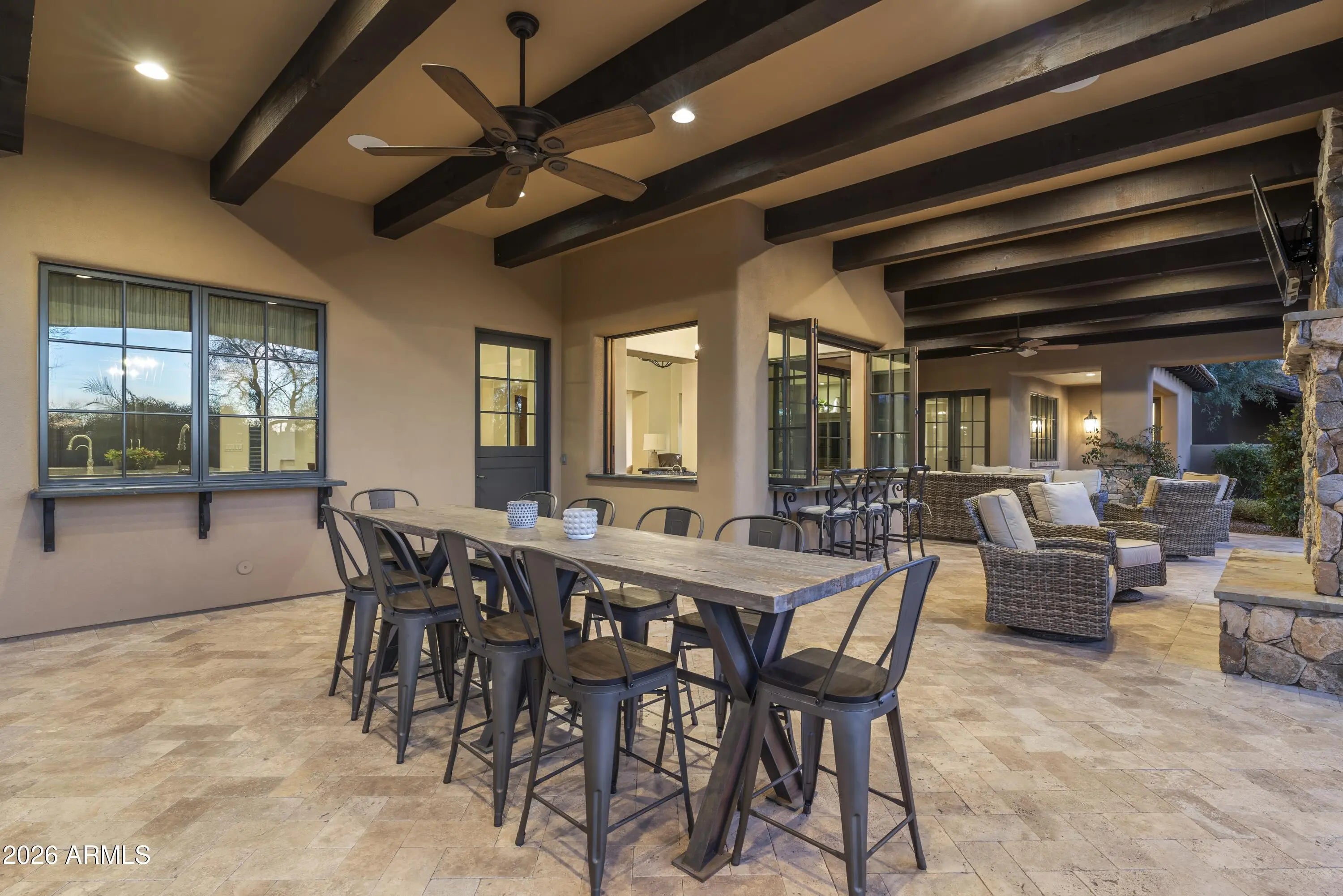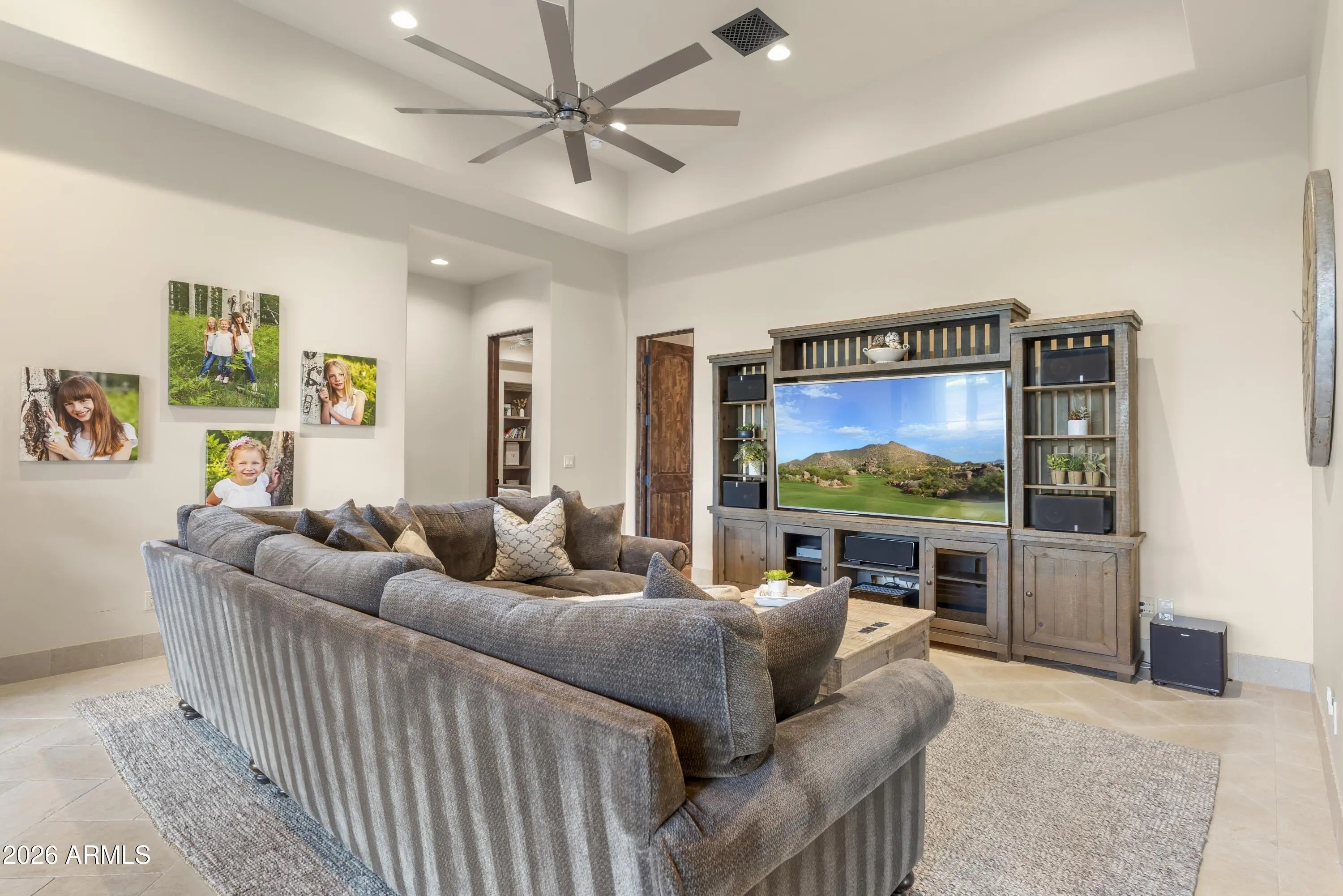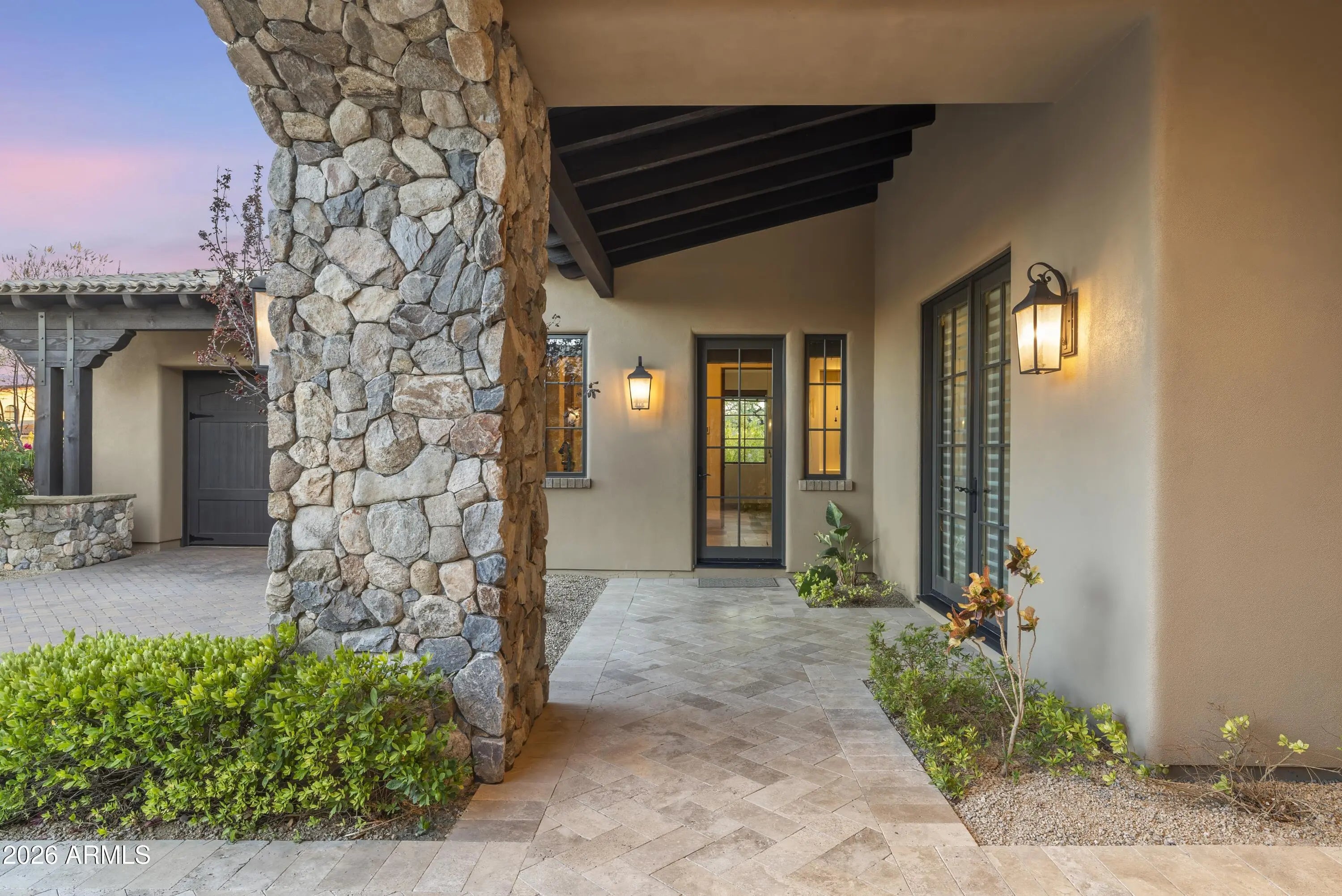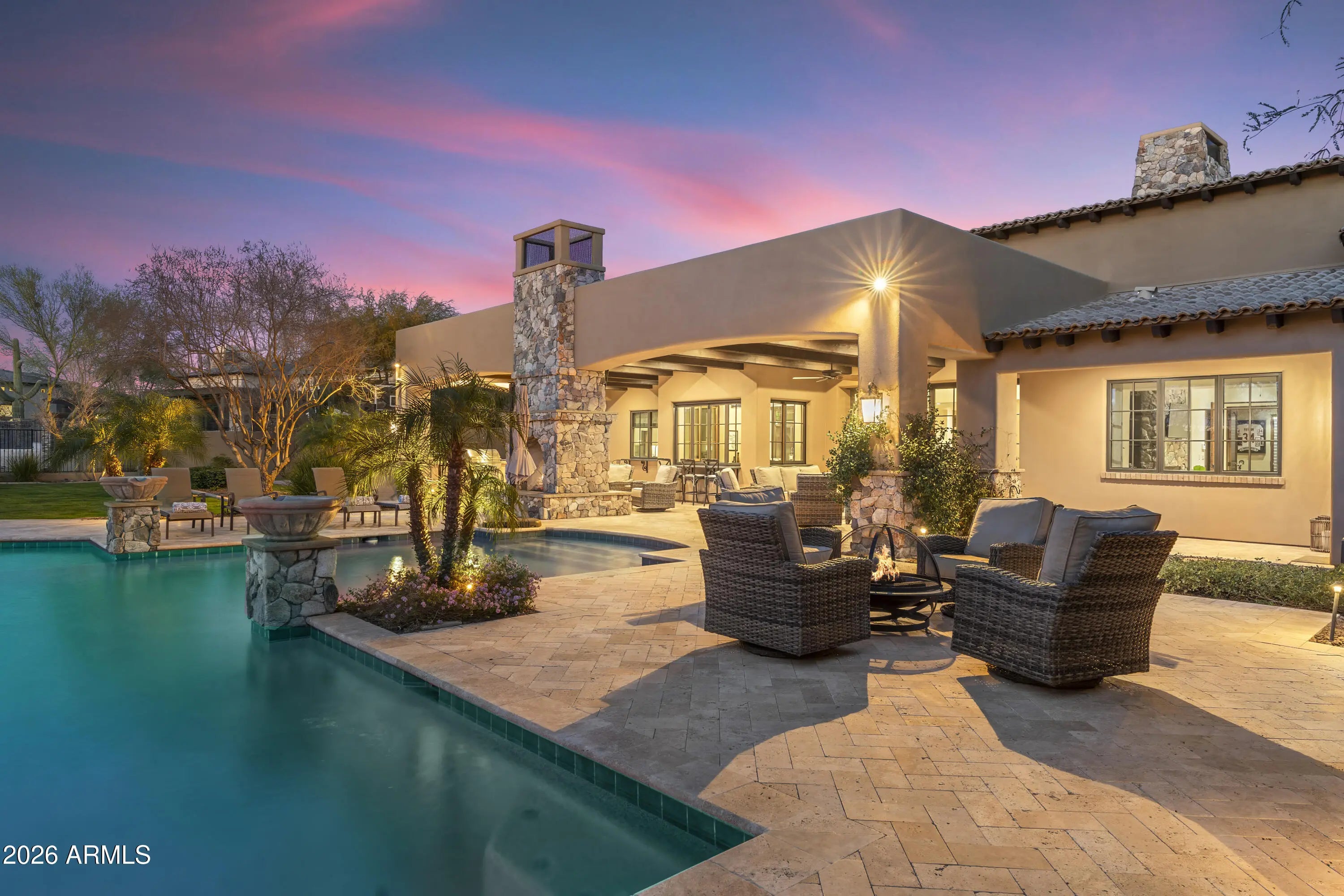 Positioned on Hole 5 of the Raptor Course at Grayhawk Golf Club, this custom estate built in 2017 in Serenity at Grayhawk represents a rare opportunity to own one of North Scottsdale's premier golf-front residences. This masterpiece offers 6,240 square feet of refined desert luxury with panoramic fairway views and a rare 5+car garage, an exceptional amenity even among North Scottsdale's elite properties. Behind the gates of one of Scottsdale's most prestigious golf communities, this 5 bedroom, 6.5 bath residence delivers architectural warmth and commanding presence. Soaring wood-beamed ceilings, handcrafted stone fireplaces, wide-plank flooring, and expansive glass walls frame unobstructed championship golf views while creating seamless indoor-outdoor living. The split floor plan is designed for privacy and elevated entertaining, featuring an executive office, flex room and multiple gathering spaces. At the center of the home, the chef's kitchen showcases a grand island, professional-grade Wolf Sub-Zero appliances, custom cabinetry, and a fully equipped butler's pantry, flowing effortlessly into the great room and formal dining areas. Retracting glass walls reveal a resort-caliber backyard retreat set against the manicured fairways of the Raptor Course. Enjoy Arizona sunsets from the covered patio fireplace lounge, entertain at the full indoor-outdoor bar, unwind in the heated pool, or host competitive play on the private sport court. The setting delivers privacy while embracing the prestige of championship golf living. The primary suite offers a private sanctuary overlooking the course, complete with a spa-inspired bath, expansive custom closets, and direct access to the outdoor living areas. Each additional bedroom features an en-suite bath, ideal for guests or multigenerational living. A substantial laundry suite with dual washer and dryer configuration, extensive storage throughout, and the highly sought-after 5+ car garage provide both luxury and functionality. Whether for collectors, golf carts, or additional recreational vehicles, this garage capacity is a rare advantage in Scottsdale luxury real estate. Serenity at Grayhawk is known for elevated custom lots, guard-gated security, and proximity to the award-winning Talon and Raptor golf courses. Residents enjoy scenic walking and biking trails, tennis courts, community parks, and quick access to Scottsdale Quarter, Kierland Commons, DC Ranch Marketplace, Pinnacle Peak hiking, and Loop 101 connectivity. For buyers seeking a golf course estate, a Grayhawk trophy property on the Raptor Course, or a North Scottsdale luxury entertainer's compound, this property stands among the most compelling offerings in today's high-end market.