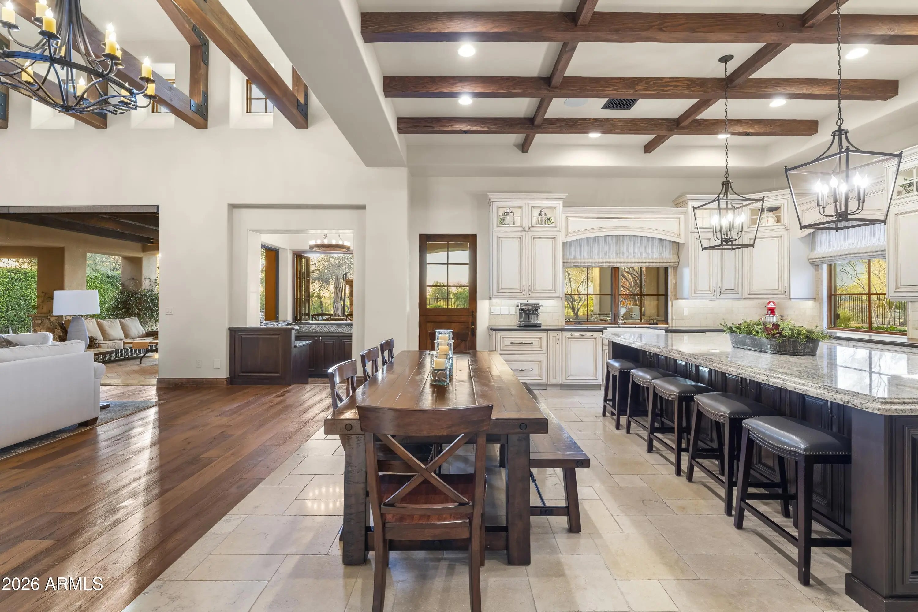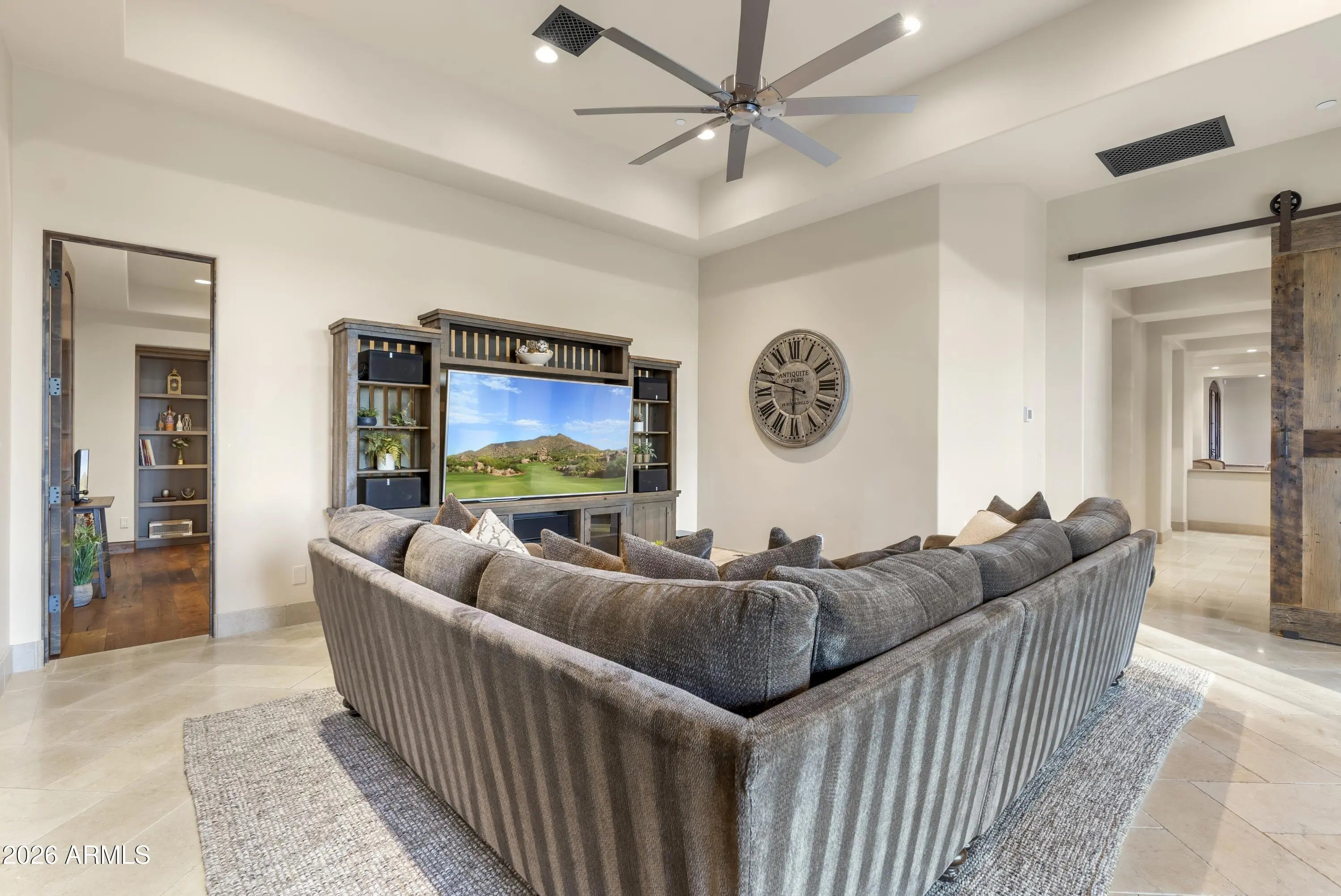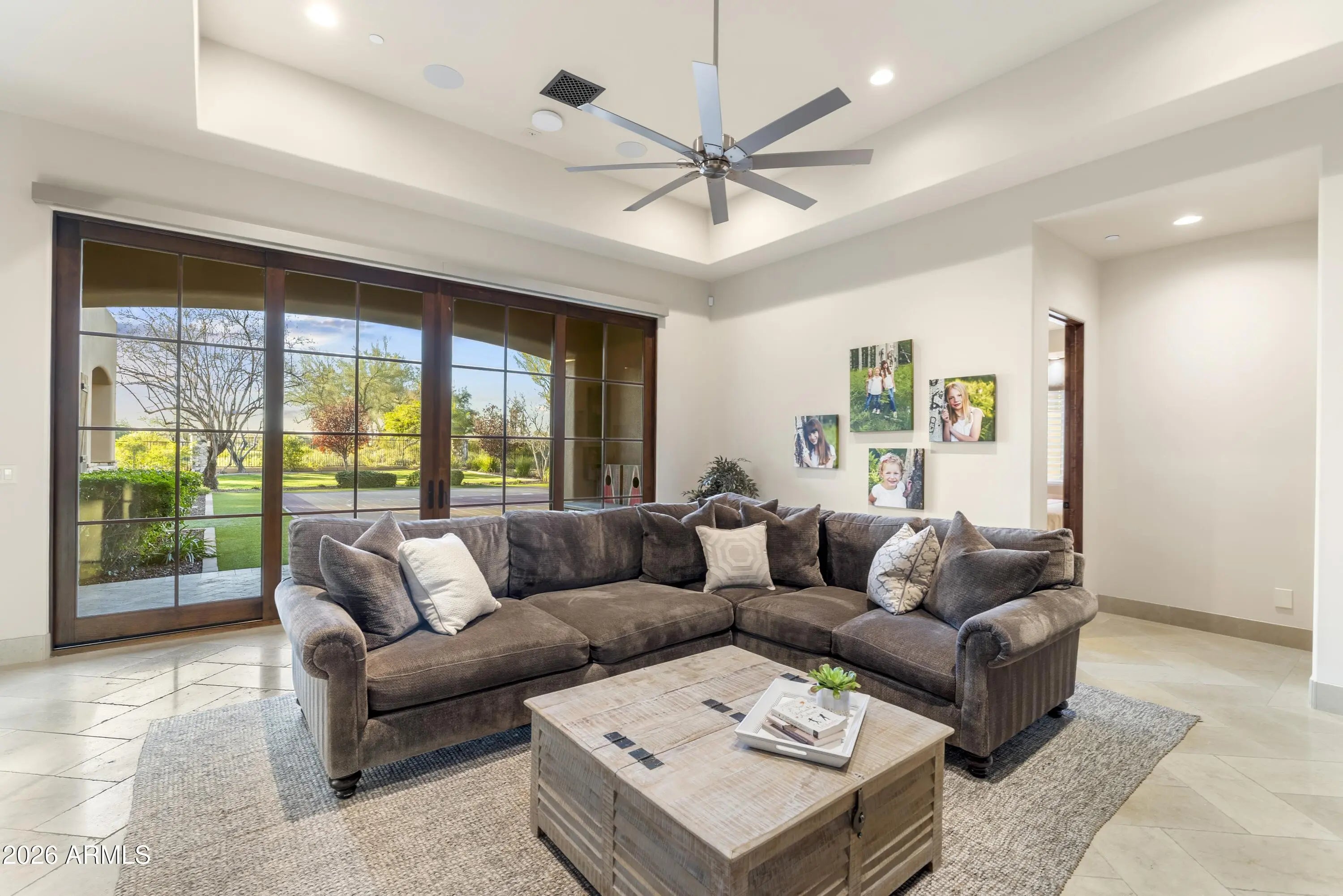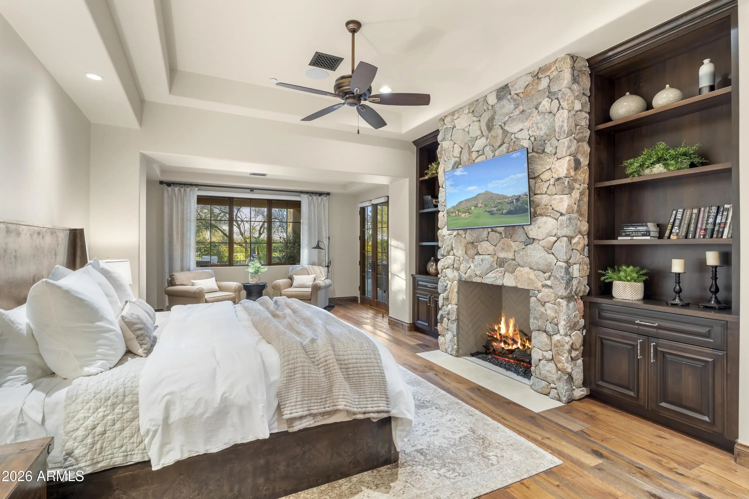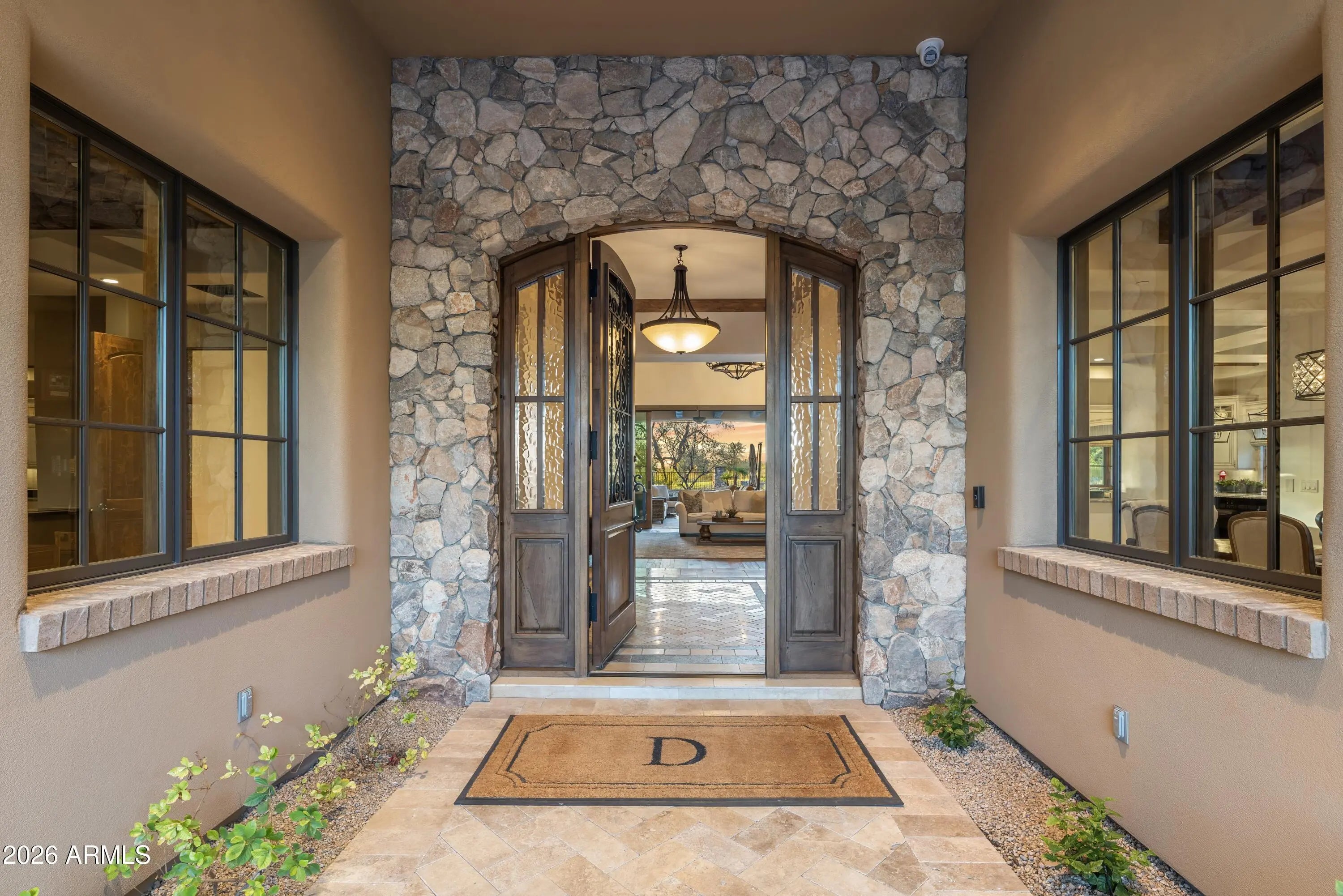 Positioned on Hole 5 of the Raptor Course at Grayhawk Golf Club, this custom estate built in 2017 in Serenity at Grayhawk represents a rare opportunity to own one of North Scottsdale's premier golf-front residences. This masterpiece offers 6,240 square feet of refined desert luxury with panoramic fairway views and a rare 5+car garage, an exceptional amenity even among North Scottsdale's elite properties. Behind the gates of one of Scottsdale's most prestigious golf communities, this 5 bedroom, 6.5 bath residence delivers architectural warmth and commanding presence. Soaring wood-beamed ceilings, handcrafted stone fireplaces, wide-plank flooring, and expansive glass walls frame unobstructed championship golf views while creating seamless indoor-outdoor living. The split floor plan is designed for privacy and elevated entertaining, featuring an executive office, flex room and multiple gathering spaces. At the center of the home, the chef's kitchen showcases a grand island, professional-grade Wolf Sub-Zero appliances, custom cabinetry, and a fully equipped butler's pantry, flowing effortlessly into the great room and formal dining areas. Retracting glass walls reveal a resort-caliber backyard retreat set against the manicured fairways of the Raptor Course. Enjoy Arizona sunsets from the covered patio fireplace lounge, entertain at the full indoor-outdoor bar, unwind in the heated pool, or host competitive play on the private sport court. The setting delivers privacy while embracing the prestige of championship golf living. The primary suite offers a private sanctuary overlooking the course, complete with a spa-inspired bath, expansive custom closets, and direct access to the outdoor living areas. Each additional bedroom features an en-suite bath, ideal for guests or multigenerational living. A substantial laundry suite with dual washer and dryer configuration, extensive storage throughout, and the highly sought-after 5+ car garage provide both luxury and functionality. Whether for collectors, golf carts, or additional recreational vehicles, this garage capacity is a rare advantage in Scottsdale luxury real estate. Serenity at Grayhawk is known for elevated custom lots, guard-gated security, and proximity to the award-winning Talon and Raptor golf courses. Residents enjoy scenic walking and biking trails, tennis courts, community parks, and quick access to Scottsdale Quarter, Kierland Commons, DC Ranch Marketplace, Pinnacle Peak hiking, and Loop 101 connectivity. For buyers seeking a golf course estate, a Grayhawk trophy property on the Raptor Course, or a North Scottsdale luxury entertainer's compound, this property stands among the most compelling offerings in today's high-end market.
