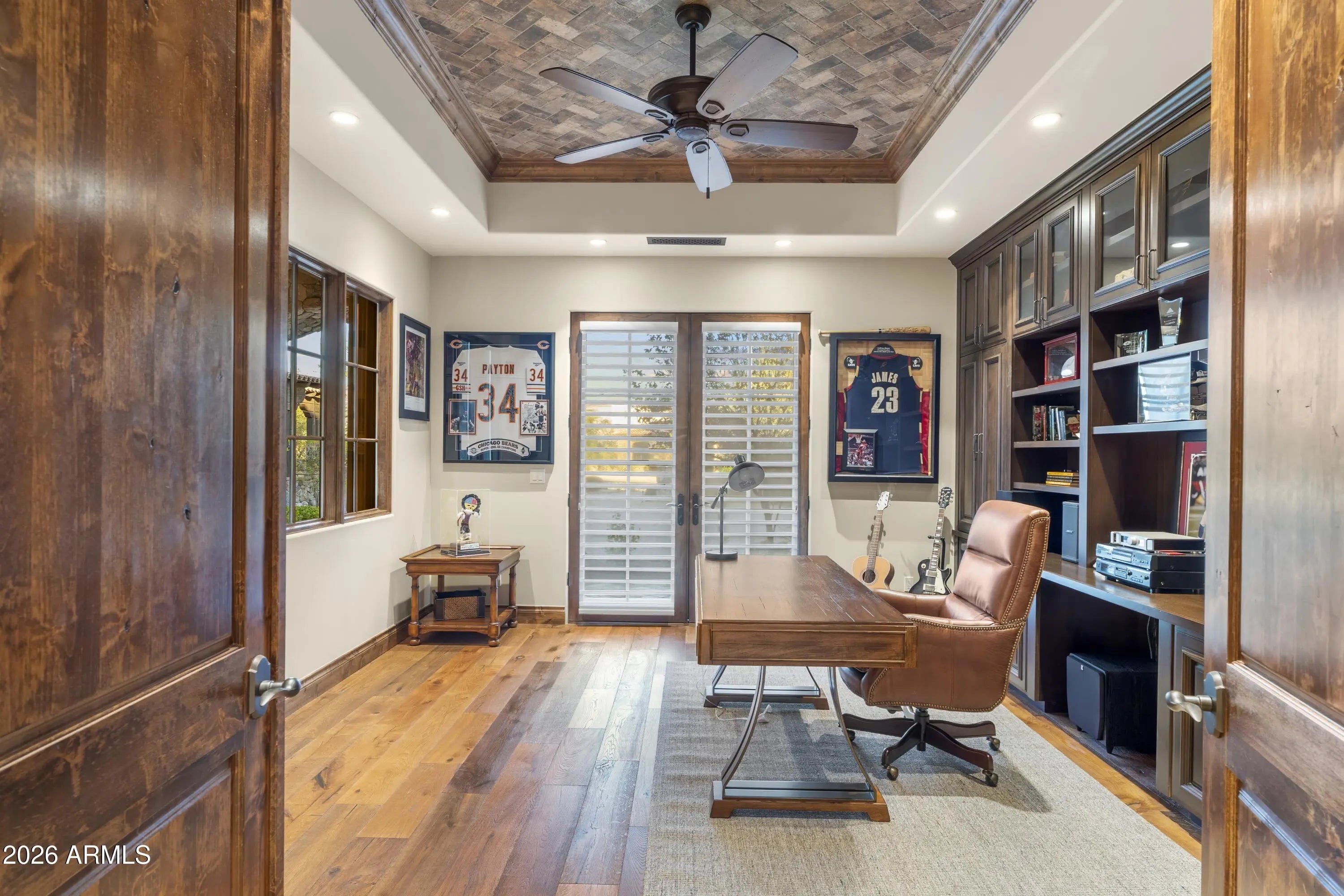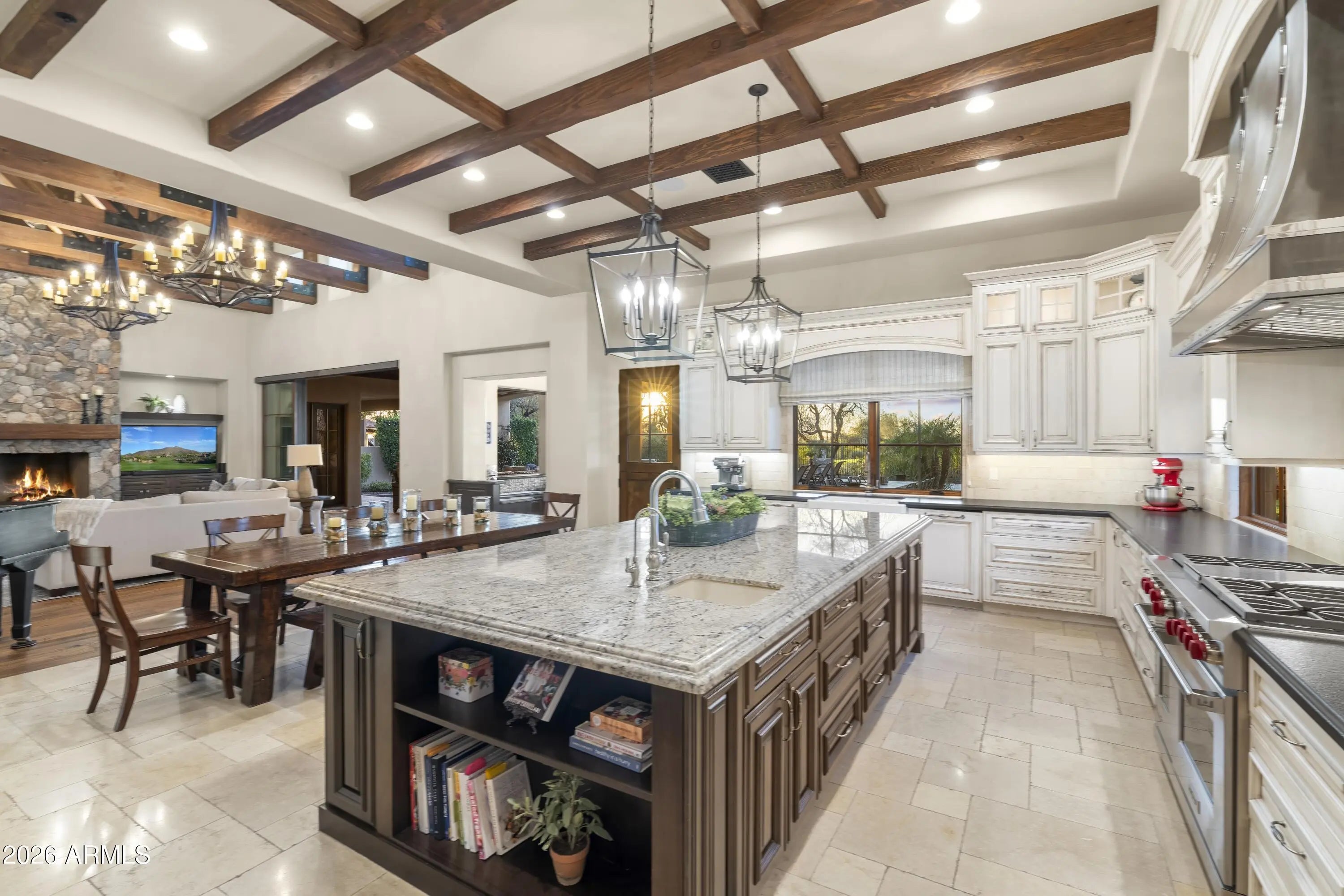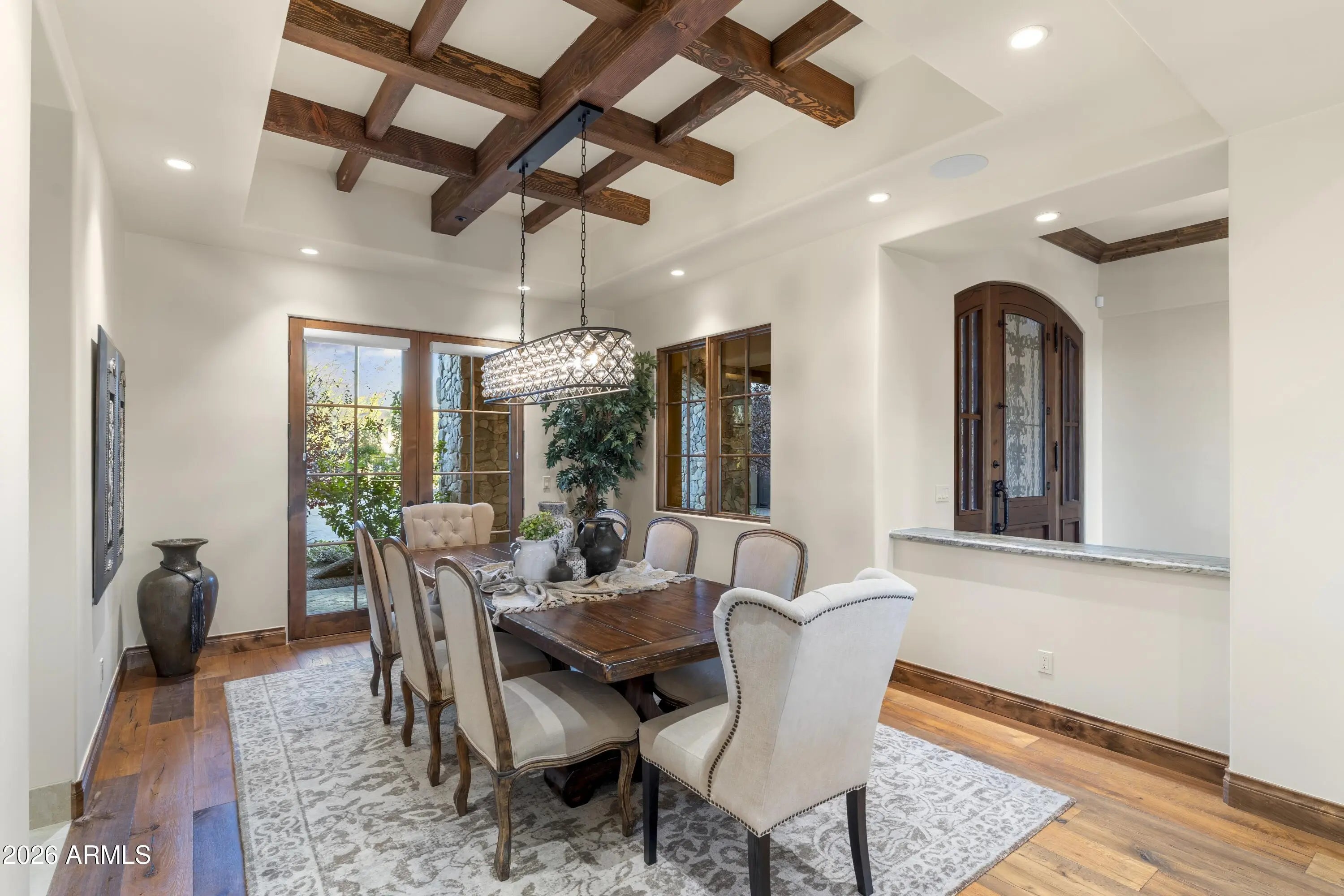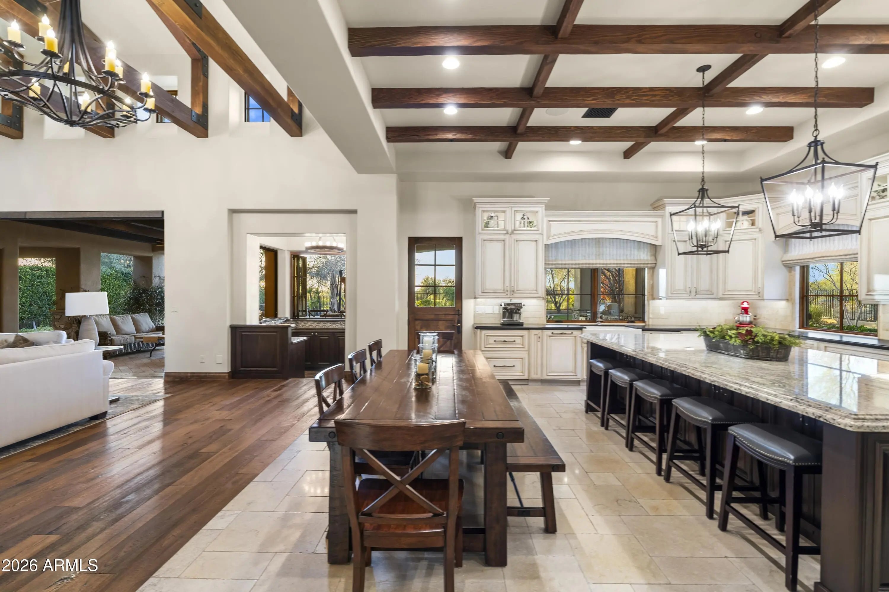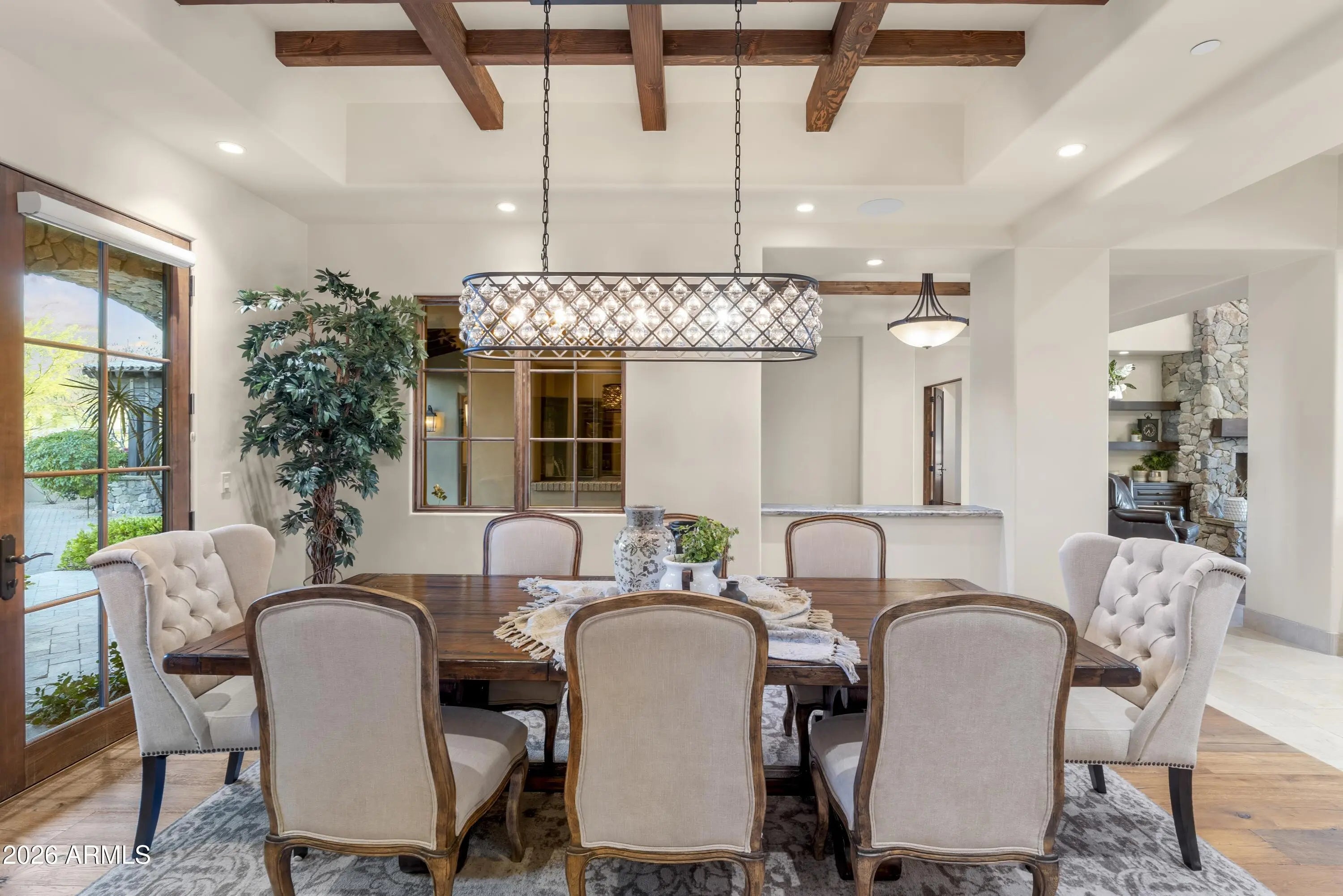 Positioned on Hole 5 of the Raptor Course at Grayhawk Golf Club, this custom estate built in 2017 in Serenity at Grayhawk represents a rare opportunity to own one of North Scottsdale's premier golf-front residences. This masterpiece offers 6,240 square feet of refined desert luxury with panoramic fairway views and a rare 5+car garage, an exceptional amenity even among North Scottsdale's elite properties. Behind the gates of one of Scottsdale's most prestigious golf communities, this 5 bedroom, 6.5 bath residence delivers architectural warmth and commanding presence. Soaring wood-beamed ceilings, handcrafted stone fireplaces, wide-plank flooring, and expansive glass walls frame unobstructed championship golf views while creating seamless indoor-outdoor living. The split floor plan is designed for privacy and elevated entertaining, featuring an executive office, flex room and multiple gathering spaces. At the center of the home, the chef's kitchen showcases a grand island, professional-grade Wolf Sub-Zero appliances, custom cabinetry, and a fully equipped butler's pantry, flowing effortlessly into the great room and formal dining areas. Retracting glass walls reveal a resort-caliber backyard retreat set against the manicured fairways of the Raptor Course. Enjoy Arizona sunsets from the covered patio fireplace lounge, entertain at the full indoor-outdoor bar, unwind in the heated pool, or host competitive play on the private sport court. The setting delivers privacy while embracing the prestige of championship golf living. The primary suite offers a private sanctuary overlooking the course, complete with a spa-inspired bath, expansive custom closets, and direct access to the outdoor living areas. Each additional bedroom features an en-suite bath, ideal for guests or multigenerational living. A substantial laundry suite with dual washer and dryer configuration, extensive storage throughout, and the highly sought-after 5+ car garage provide both luxury and functionality. Whether for collectors, golf carts, or additional recreational vehicles, this garage capacity is a rare advantage in Scottsdale luxury real estate. Serenity at Grayhawk is known for elevated custom lots, guard-gated security, and proximity to the award-winning Talon and Raptor golf courses. Residents enjoy scenic walking and biking trails, tennis courts, community parks, and quick access to Scottsdale Quarter, Kierland Commons, DC Ranch Marketplace, Pinnacle Peak hiking, and Loop 101 connectivity. For buyers seeking a golf course estate, a Grayhawk trophy property on the Raptor Course, or a North Scottsdale luxury entertainer's compound, this property stands among the most compelling offerings in today's high-end market.
