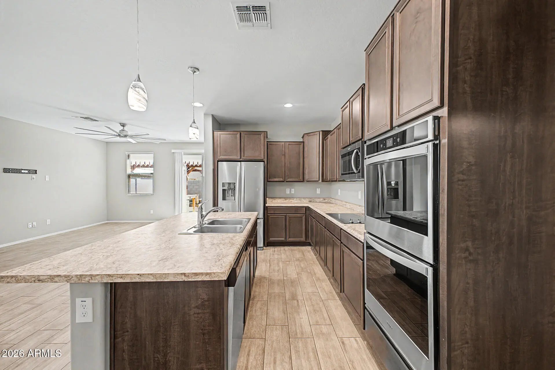 This stunning, nearly-new home offers a thoughtfully designed open great room layout, perfect for everyday living and entertaining. The owner's suite is split for privacy, complemented by a private den for work or study. Recent upgrades include wood tile flooring throughout the main living areas, replacing the original carpet, and a fully reimagined backyard featuring turf and newly planted trees -- creating a low-maintenance outdoor oasis. Built in 2020, this home combines modern finishes, functional design, and a prime location in a sought-after community, making it move-in ready and stylishly comfortable.