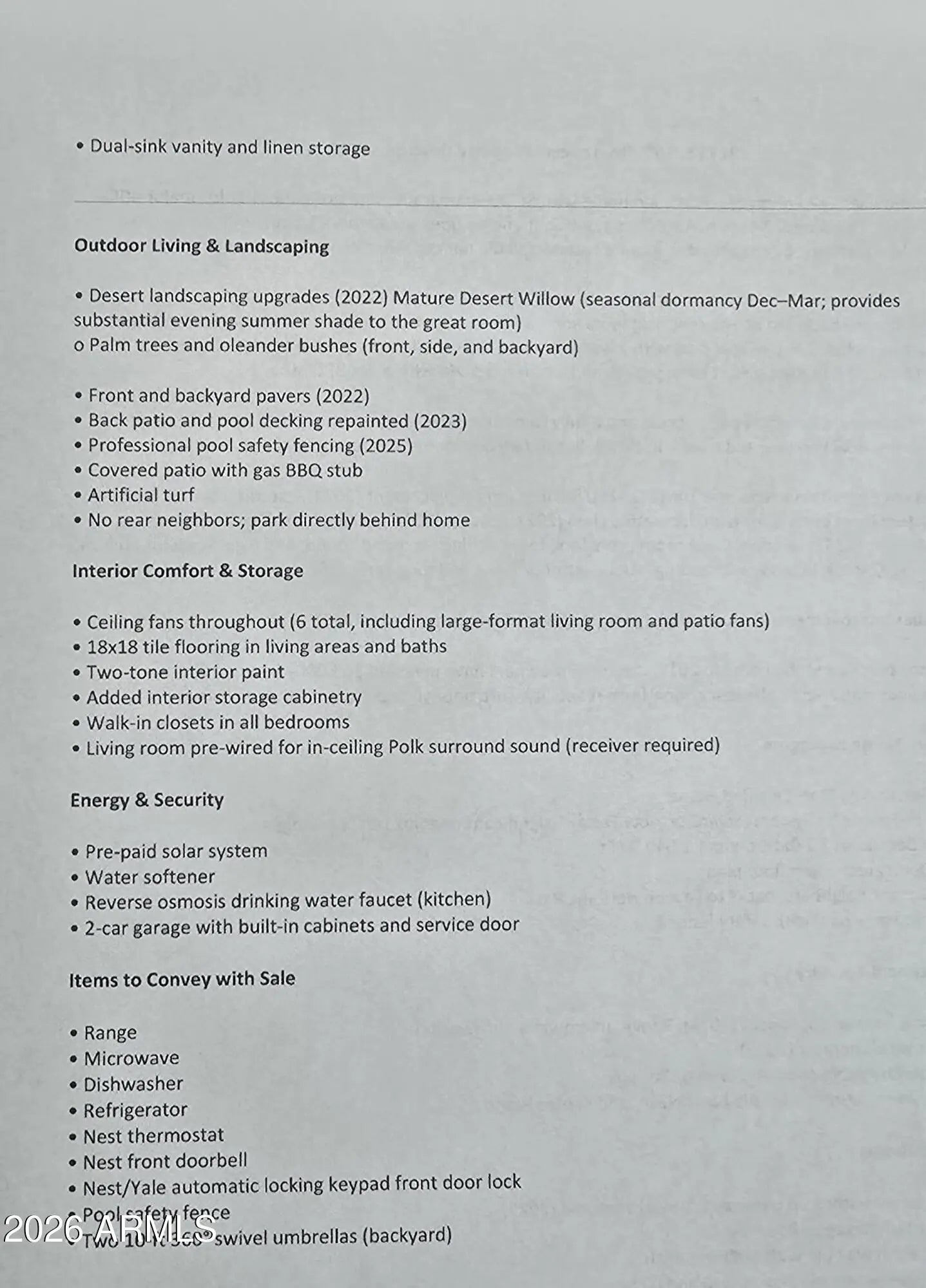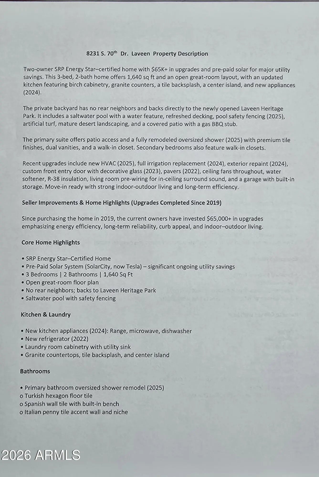 Rare opportunity! Move-in ready w/prepaid Solar, beautiful saltwater pool, $65k in upgrades! No rear neighbors ever. This 3-bedroom, 2-bath home offers 1,640 sq ft of open-concept living with a spacious great-room layout ideal for everyday comfort and entertaining. The updated kitchen features birch cabinetry, granite countertops, tile backsplash, center island, and new appliances (2024). Recent upgrades provide peace of mind and long-term efficiency, including a new HVAC system (2025), full irrigation replacement (2024), exterior repaint (2024), custom front entry door w/ decorative glass (2023), paver enhancements (2022), R-38 insulation, ceiling fans throughout, water softener, living room pre-wiring for in-ceiling surround sound, and a garage with built-in storage. Enjoy a truly private backyard with no rear neighbors, backing directly to the newly opened Laveen Heritage Park. The outdoor space is designed for low-maintenance enjoyment and includes a saltwater pool with water feature, refreshed pool decking, pool safety fencing (2025), artificial turf, mature desert landscaping, and a covered patio with gas BBQ stub--perfect for Arizona outdoor living. The primary suite offers direct patio access and a spa-like ensuite with a fully remodeled oversized shower (2025) featuring premium tile finishes, dual vanities, and a walk-in closet. Secondary bedrooms also include walk-in closets, adding to the home's functional appeal. Move-in ready with strong indoor-outdoor living, modern upgrades, and outstanding energy efficiency.