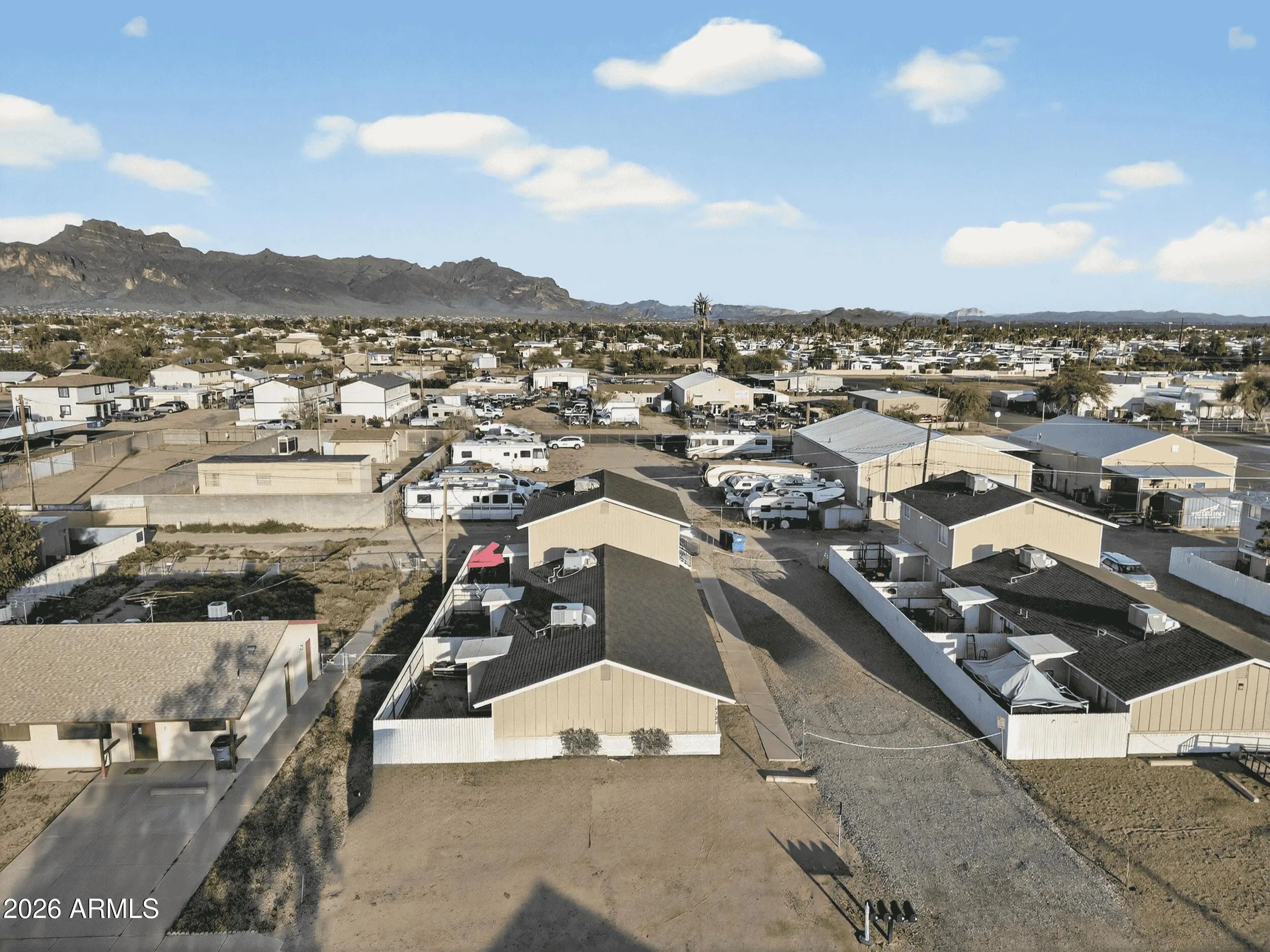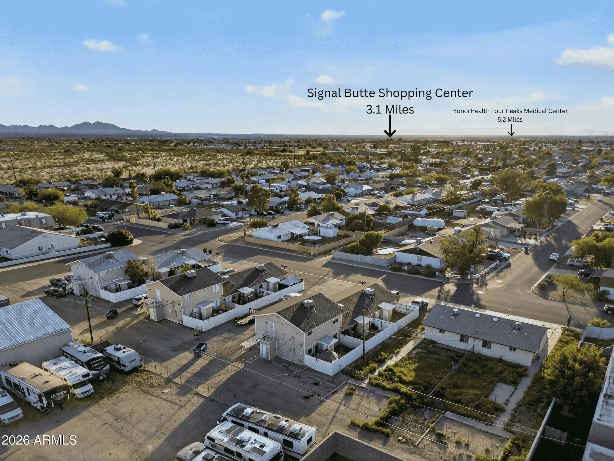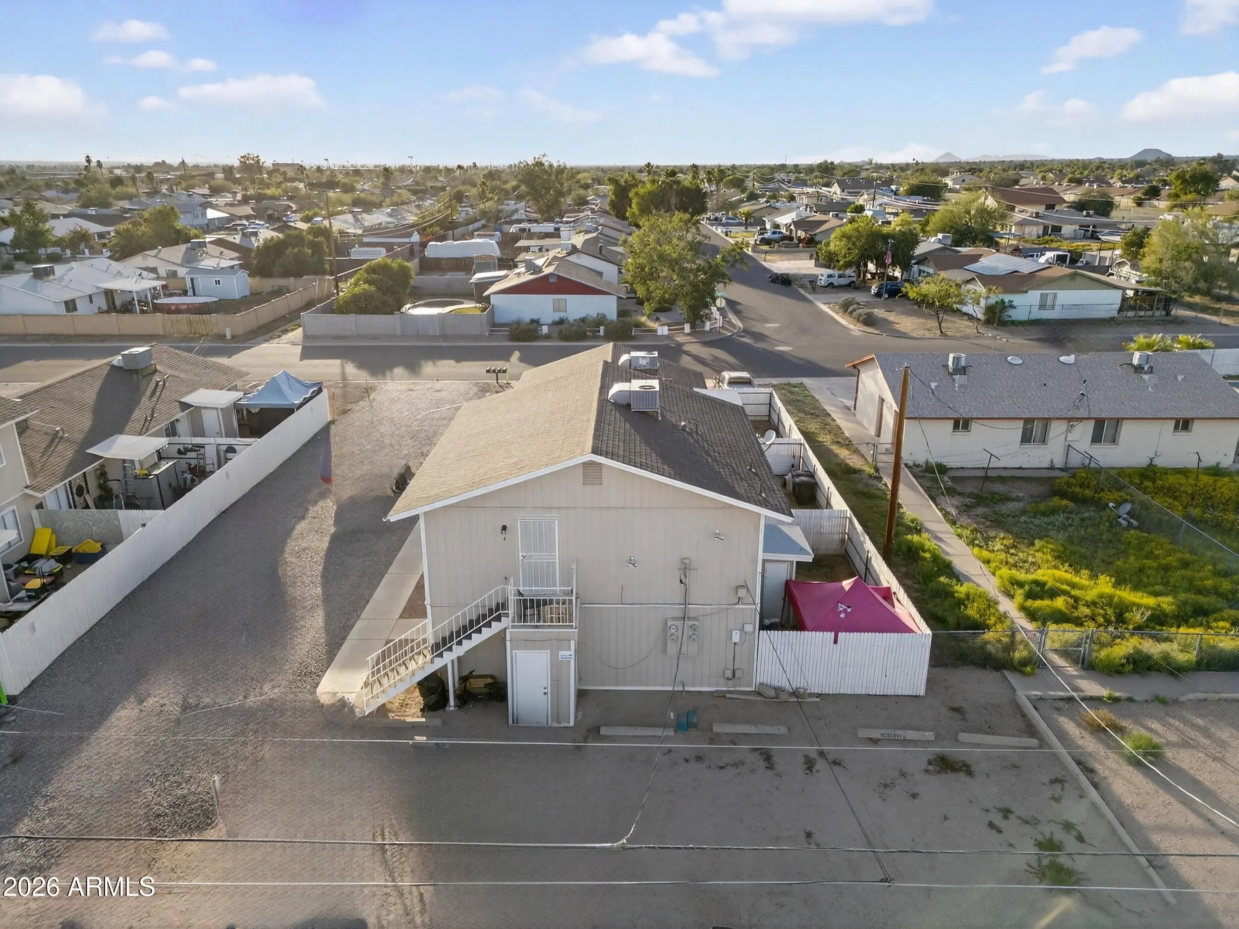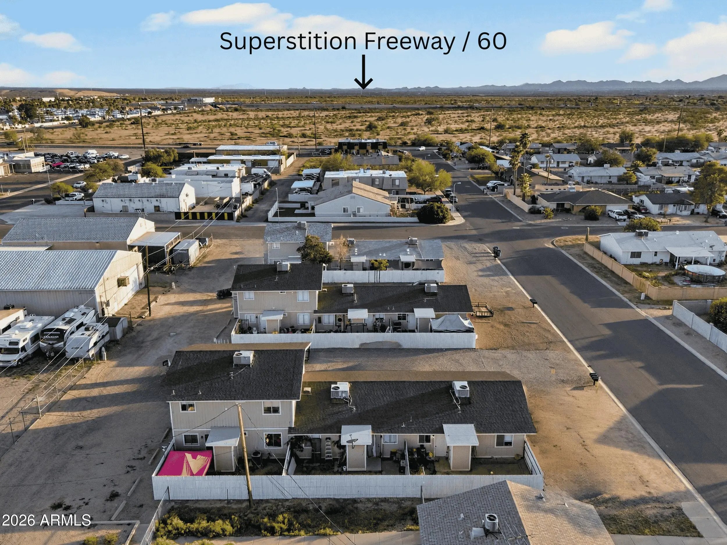 Incredible 4-Plex investment opportunity close to the US-60 in Apache Junction. All 2 bedrooms/1 bathroom, individual laundry rooms in each unit, and all units have exterior storage rooms. Three single level units have private, enclosed patios. Unit 2 was updated in 2020, exterior paint completed in 2020, new roof installed in 2019, staircase was replaced in 2020, and fence installed in 2018. Rents: 1 at $1,123.10 M2M (LONG TERM TENANT), 2 at $1,150 Exp 11/01/2026, 3 at $1,150 Exp 10/01/2026, 4 at $1,050 Exp 12/29/2026. All units individually metered for electric. Professionally managed! Qualifies for residential financing! **DO NOT DISTURB TENANTS; DRIVE-BY ONLY**
