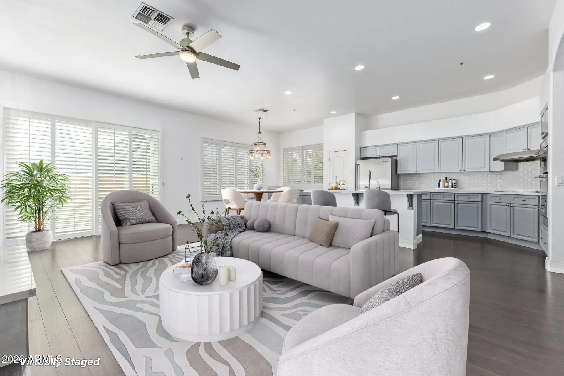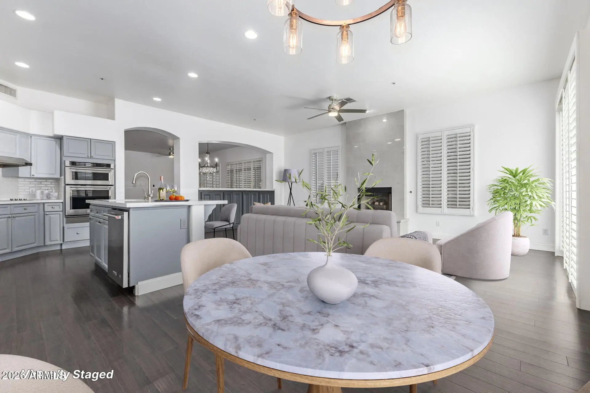 Located in a gated community with resort-style amenities, this expanded model with 2 bedrooms and a den or 3rd bedroom offers additional square footage and extensive updates throughout. Directly across from the community pool and cabanas, residents enjoy convenient access to nearby spa, fitness, and golf memberships, as well as close proximity to the renowned Fairmont Scottsdale Princess. The community also provides full-week passes each year to the Waste Management Phoenix Open. Major improvements include a new roof and liner installed in September 2022, updated sliding doors, a paver patio, improved grading with French drains, and an epoxy-coated garage floor. Most windows have been replaced with quality Pella windows; the final two were completed in November 2025. The AC and compressor were replaced in 2017/2018, and added attic insulation enhances efficiency. Inside, the remodeled fireplace creates a stylish focal point in the living area. The kitchen was fully renovated in 2020 with stainless steel KitchenAid appliances, including a stove, hood, oven, and dishwasher. An upgraded entertaining bar with a custom quartz top (2023) and enhanced family room shelving with black cabinetry and quartz counters add both function and design. The primary bathroom was completely rebuilt in 2019 and features a walk-in shower, oversized freestanding tub, quartz countertops, updated cabinetry, and a chandelier. The guest bathroom was remodeled in 2025 with an oversized walk-in shower, modern black-and-white tile, and a custom vanity. HOA dues are $251.86 per month and include weekly landscaping of common areas. Rentals are permitted with a 30-day minimum lease term, offering flexibility for seasonal or extended stays.
