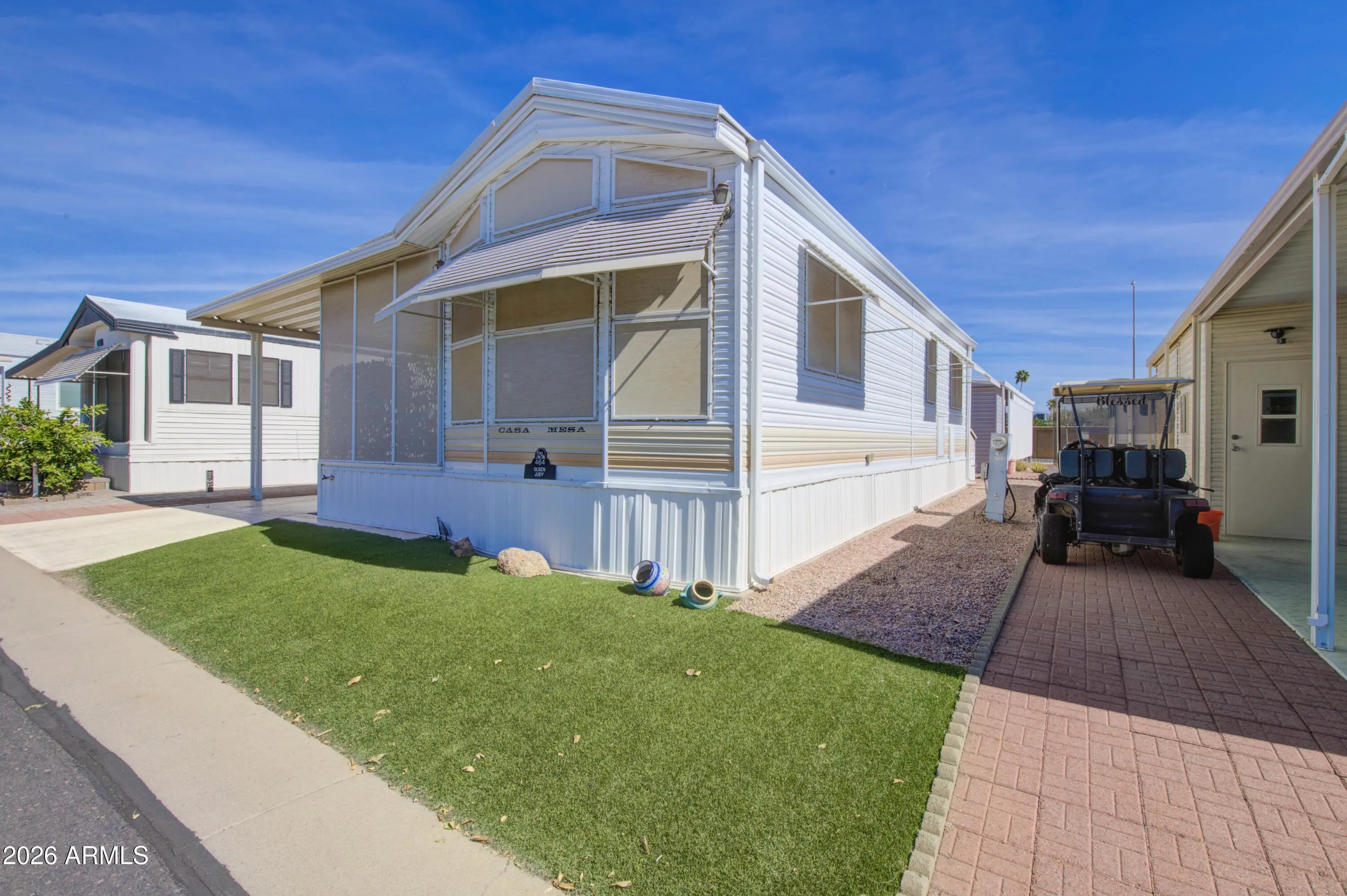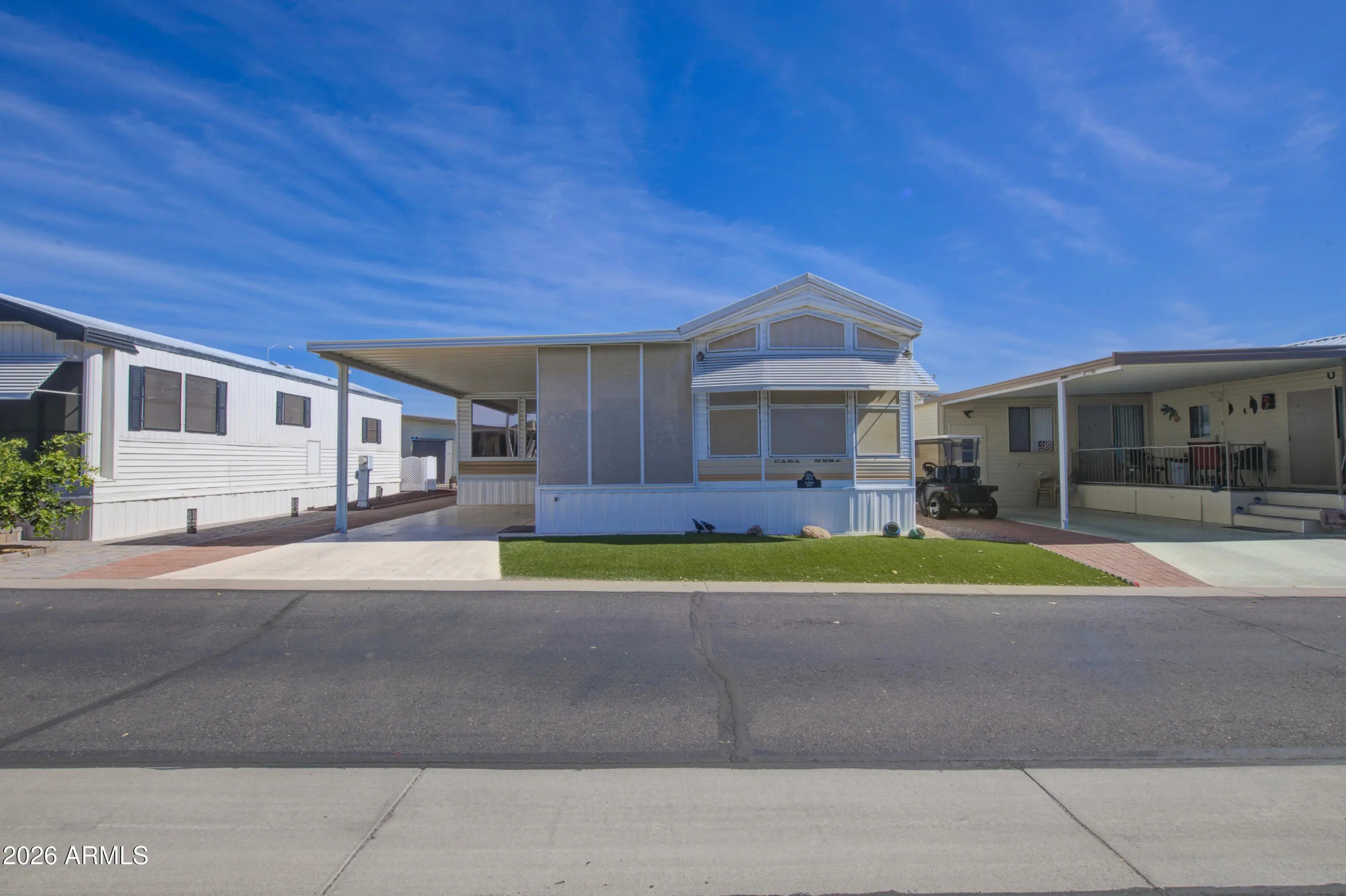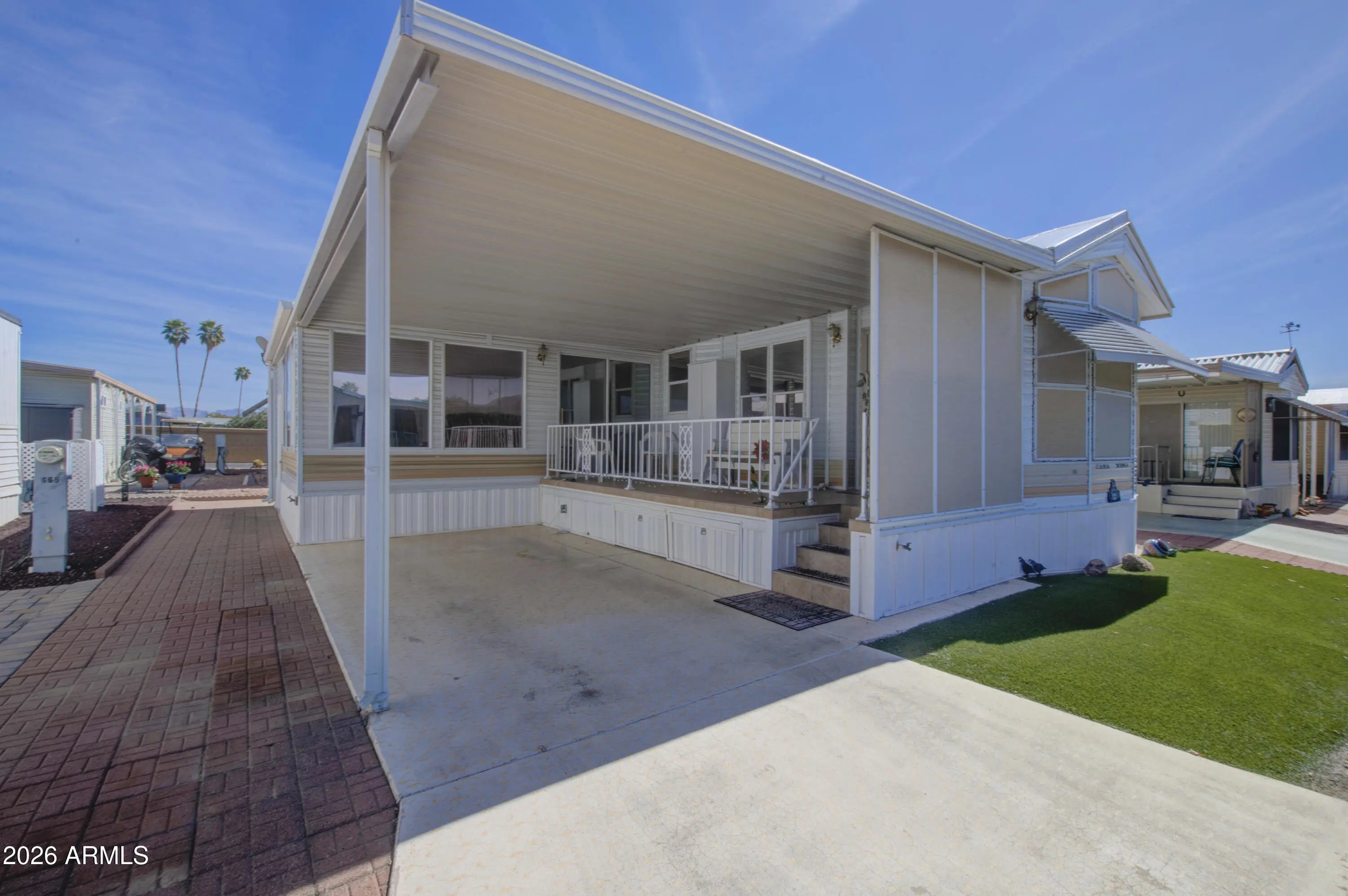 This is a lovely west facing park model with an Arizona room in Carriage Manor Resort, a premier 55+ Community where you OWN THE LAND! Outside you have a nice big tiled deck and artificial turf in front of the home, as well as pavers on both sides. Inside you'll find the walls and ceiling have been skim coated. The kitchen has all updated appliances including a double kitchen sink and reverse osmosis. The A/C on this home was installed in 2020. Carriage Manor has 24/7 on site security, a heated SALTWATER pool/spa, fitness facility, Tennis, Pickleball, Bocce, Shuffleboard, Golf Club, Billiards, Lapidary/Silversmith, Ceramics, Glass Art, Sewing, Wood shop, Bingo, Dances parties & many more activities & amenities.