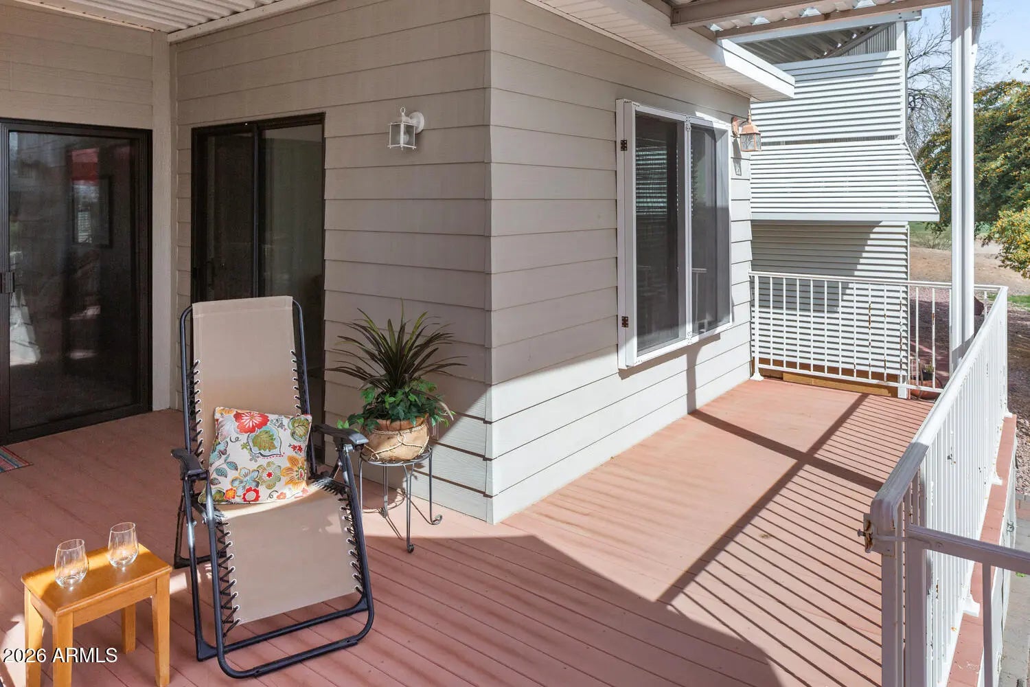 GET READY FOR AMAZING MORNING VIEWS! Picture yourself out on your deck in the mornings watching the sunrise from this golf course view deck. Lot 343 is it! This park model with AZ room has been recently remodeled with new flooring, fresh paint, new bathroom, and a newer AC/heat pump (2023). All you need is your personal touch and your desire for warm, sunny winters! AZ has it all with mountains, deserts, lakes, and sun, sun, sun!! This one is priced to sell! Move-in ready a few furnishings to get you started. Happy Trails RV Resort is a 55+ active adult, guarded community featuring an on-site restaurant, post office, low HOA dues, & NO LAND LEASE! Experience Arizona living and a vibrant social scene. This is more than a home - it's a lifestyle!