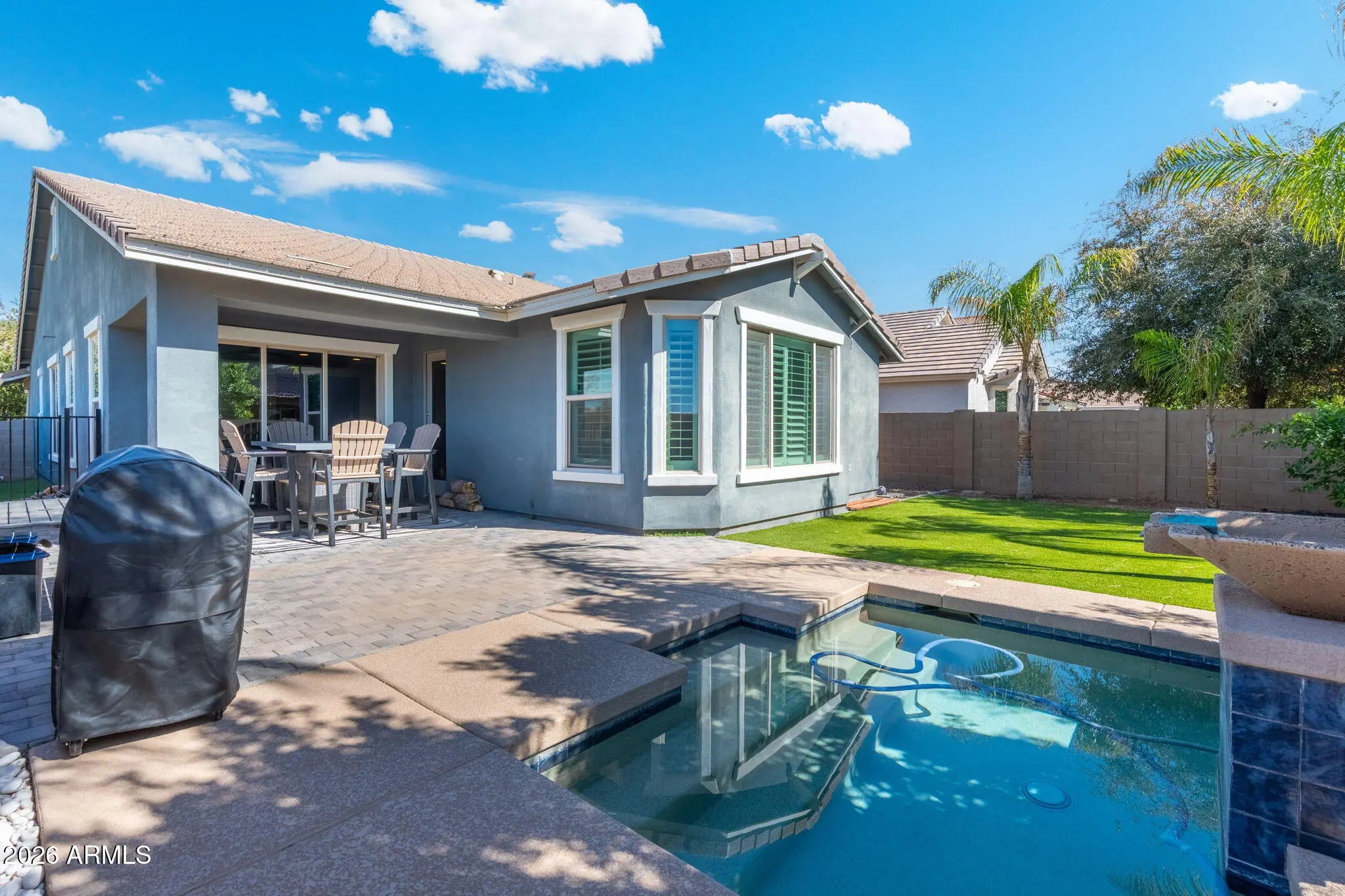 Beautifully maintained 3-bedroom, 2-bath home situated on a corner lot, offering a bright open-concept floor plan ideal for everyday living and entertaining. Plantation shutter shades on all east- and west-facing windows help reduce heat gain and improve energy efficiency year-round. Enjoy a low-maintenance backyard with a spool for relaxing and a prime Gilbert location in Morrison Ranch close to shopping, dining, parks, and top-rated schools.