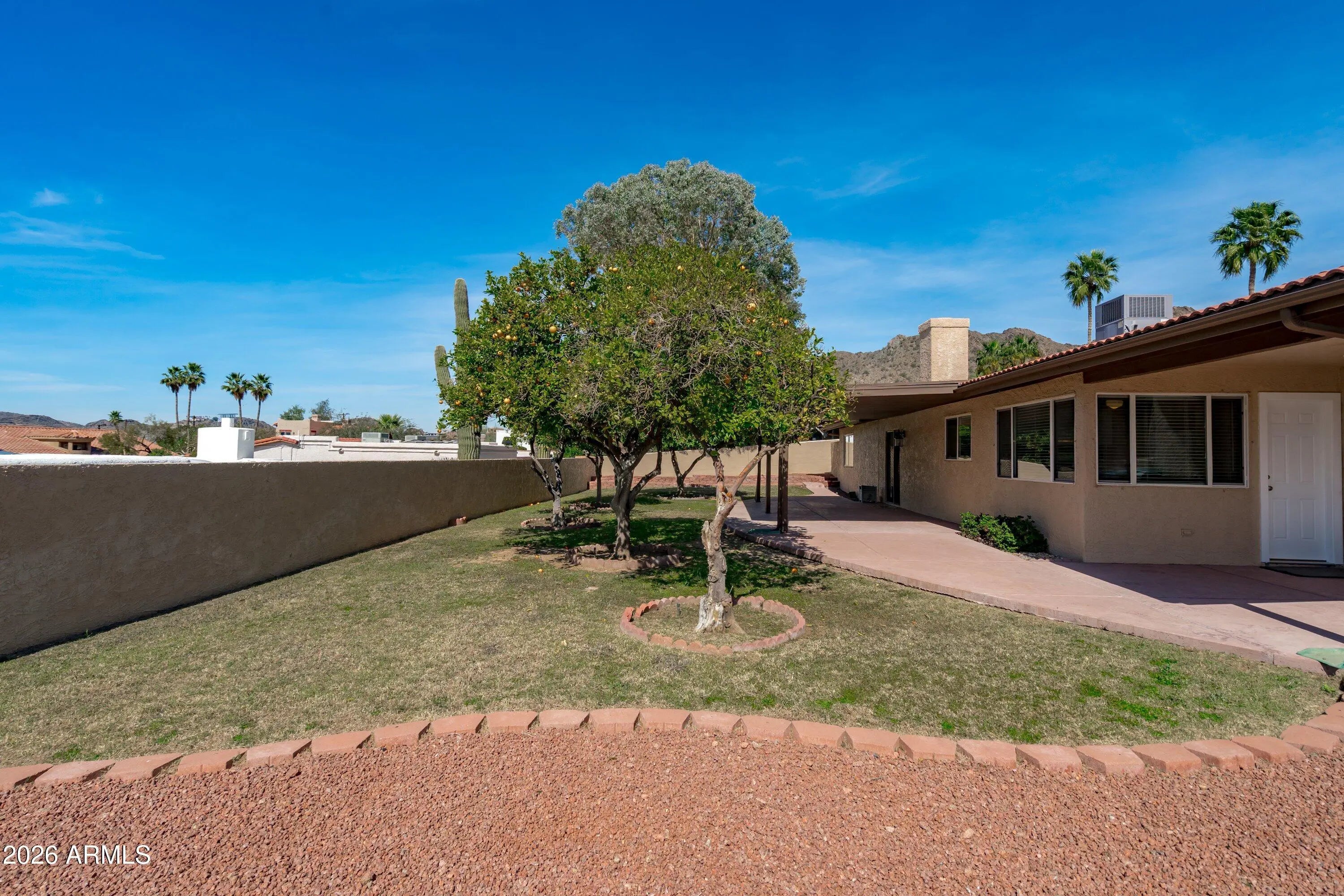 If you seek a tranquil setting, this three-bedroom, two-bath hillside home is tucked in a quiet neighborhood with stunning mountain views by day and city lights at night + NO HOA! The home offers tasteful desert landscaping in the front and a rear yard featuring several fruit-bearing citrus trees and a large, covered patio perfect for entertaining. Amenities include a spacious living room with a large picture window, a formal dining area, and a family room featuring a stone fireplace and wet bar. The home includes a large, two-car garage with space for a worktable and cabinets or shelving. The extended driveway can provide parking for as many as eight vehicles. Built in 1974, the home is an excellent candidate for updating and is being sold AS IS. Appliances (washer, dryer, dishwasher, stovetop, double oven, microwave and refrigerator) are included.