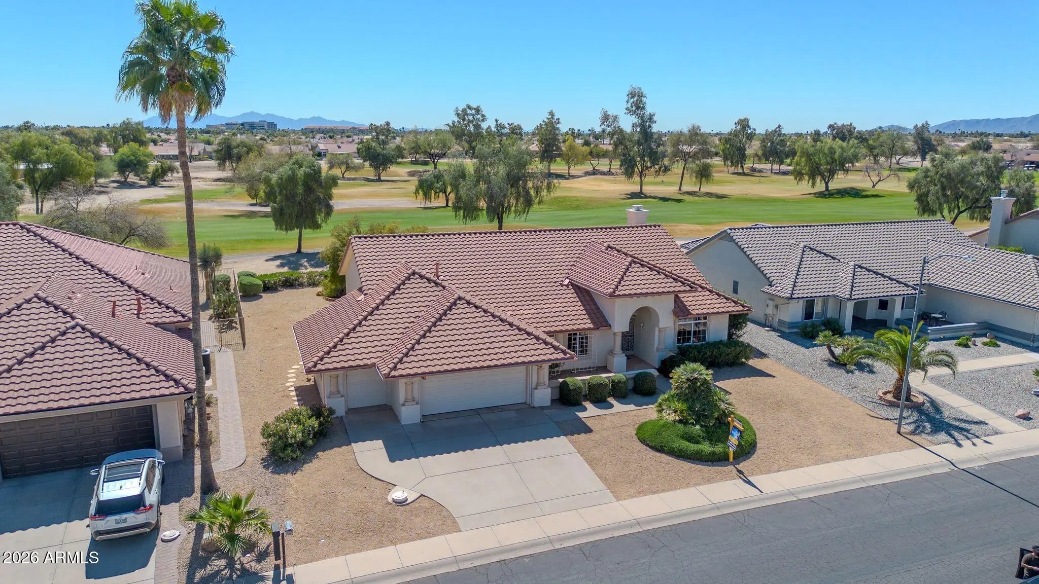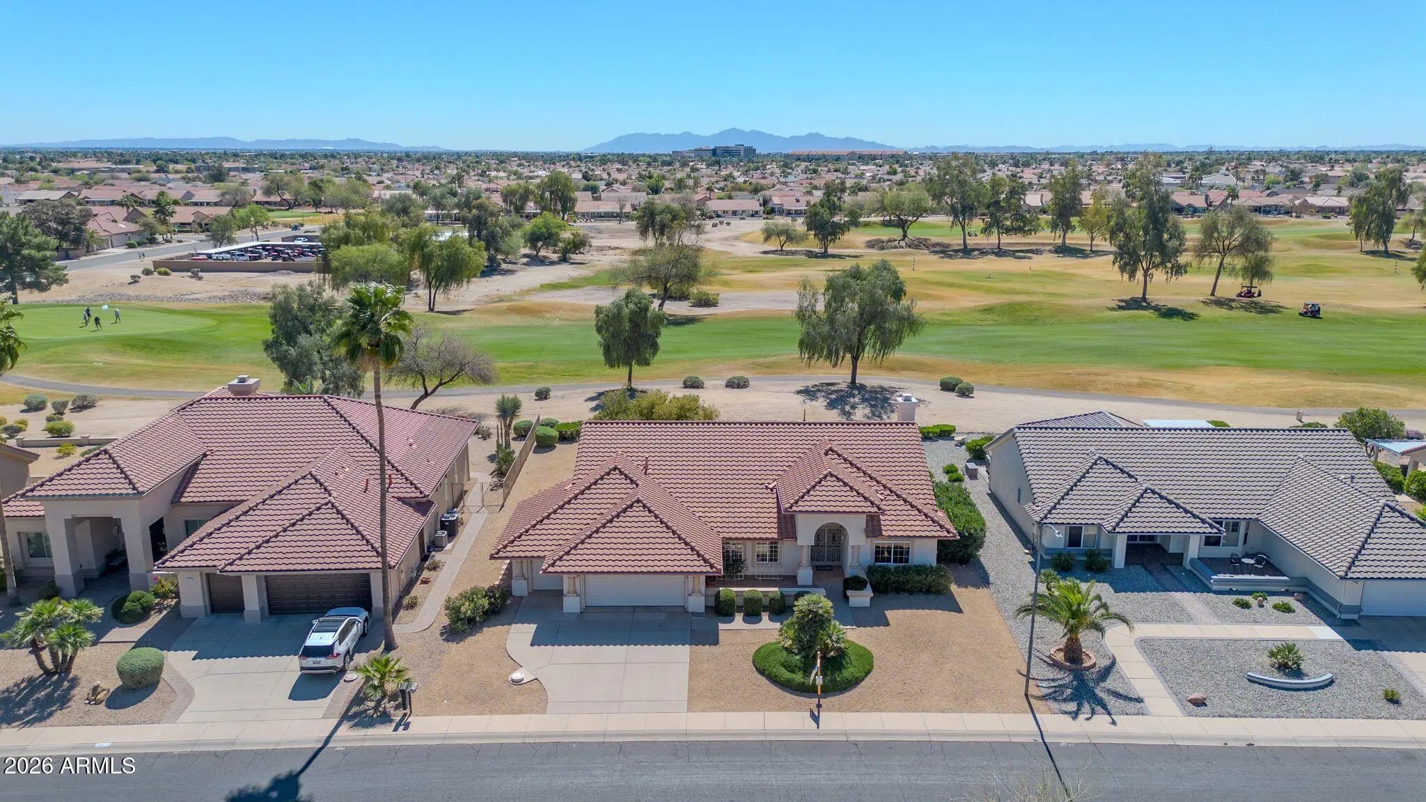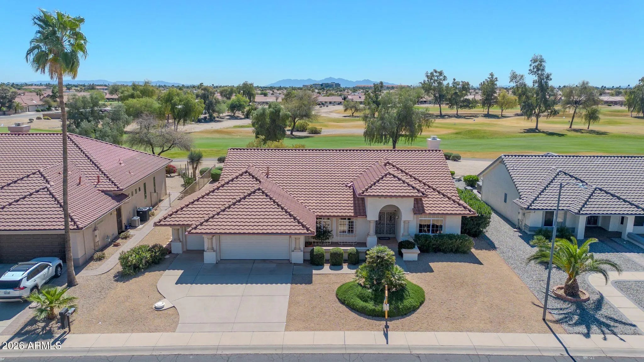 Exceptional golf course property featuring the sought-after Sandoval floor plan with 2,183 sq ft on an oversized 10,600 sq ft lot, offering stunning multiple fairway and mountain views with ideal north/south exposure. Spacious open layout includes fireplace, raised panel doors, and abundant natural light. Kitchen offers gas stub for future appliance flexibility. Primary suite features plantation shutters and walk-in closet. Major updates include Trane AC/Heat (2022), gas heat, updated roof, water heater (2017). Garage includes insulated doors, LiftMaster opener, tile flooring, laundry tub, and separate golf cart garage. Enjoy privacy and prime location near recreation centers, golf, shopping, and dining.