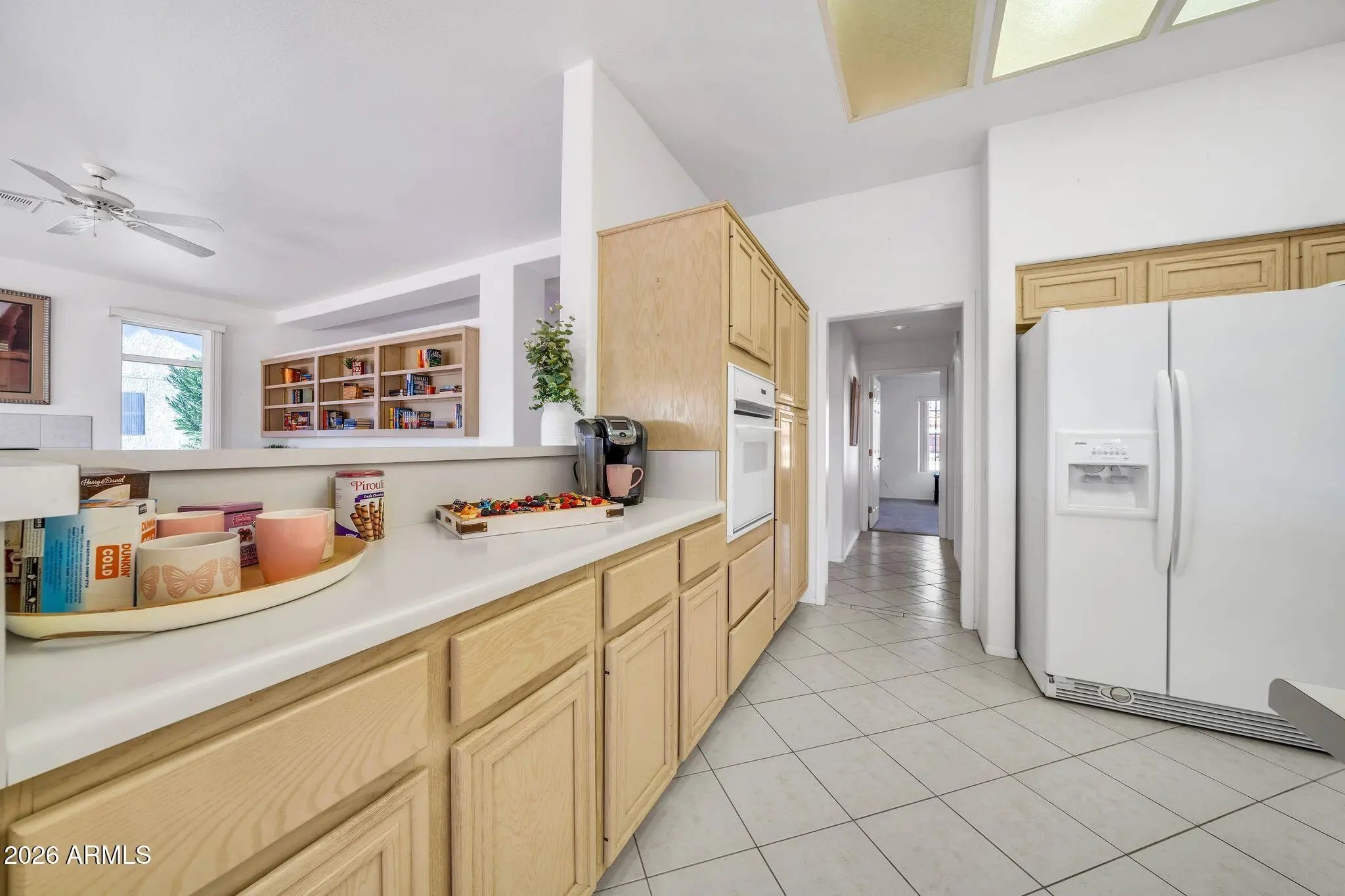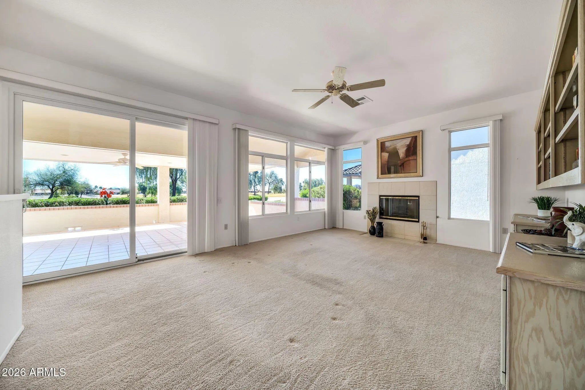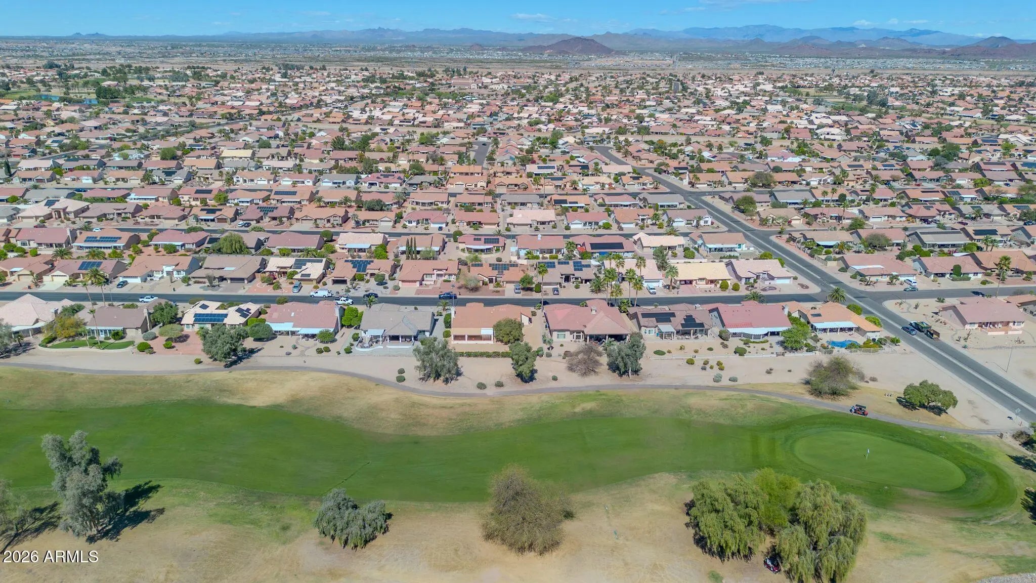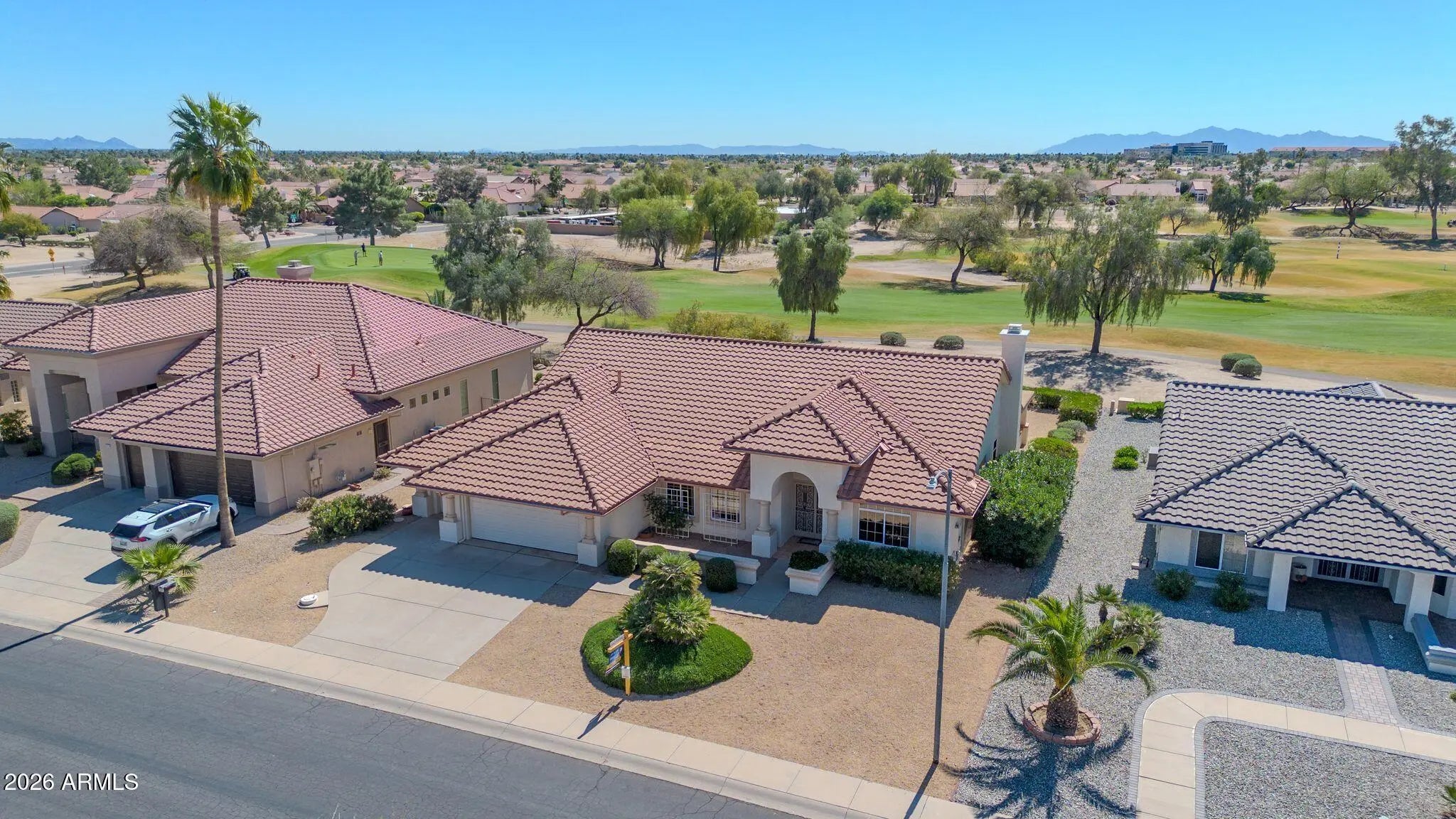 Exceptional golf course property featuring the sought-after Sandoval floor plan with 2,183 sq ft on an oversized 10,600 sq ft lot, offering stunning multiple fairway and mountain views with ideal north/south exposure. Spacious open layout includes fireplace, raised panel doors, and abundant natural light. Kitchen offers gas stub for future appliance flexibility. Primary suite features plantation shutters and walk-in closet. Major updates include Trane AC/Heat (2022), gas heat, updated roof, water heater (2017). Garage includes insulated doors, LiftMaster opener, tile flooring, laundry tub, and separate golf cart garage. Enjoy privacy and prime location near recreation centers, golf, shopping, and dining.