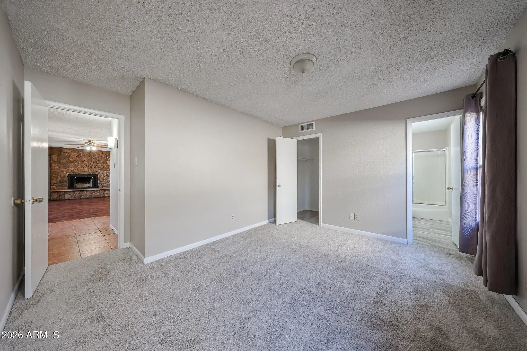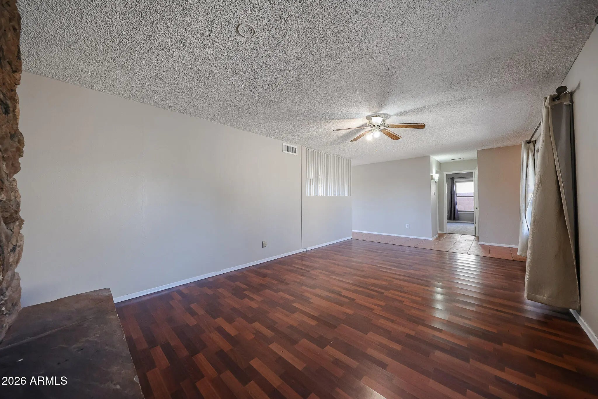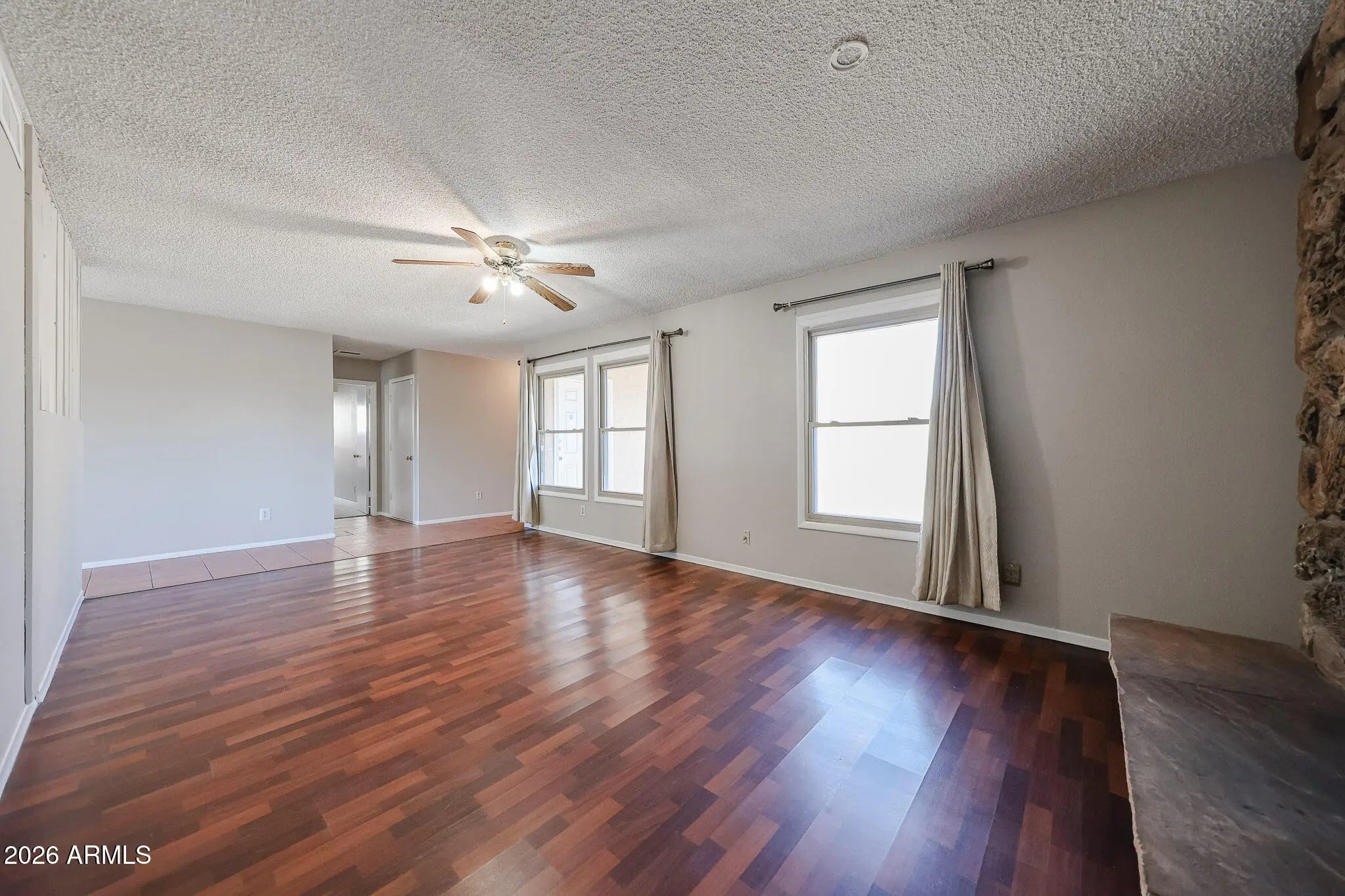 Fresh interior paint and brand-new carpet give this Glendale home a clean, move-in ready feel. Inside, you'll find a spacious living area anchored by a striking floor-to-ceiling stone fireplace and warm wood-look flooring. The galley kitchen offers generous cabinet storage, tile floors, and a bright layout that flows easily into the main living spaces. Windows replaced approximately five years ago add efficiency and natural light throughout. Step outside to a backyard built for Arizona living, complete with a private pool, extended patio space, and room to create your ideal outdoor retreat.