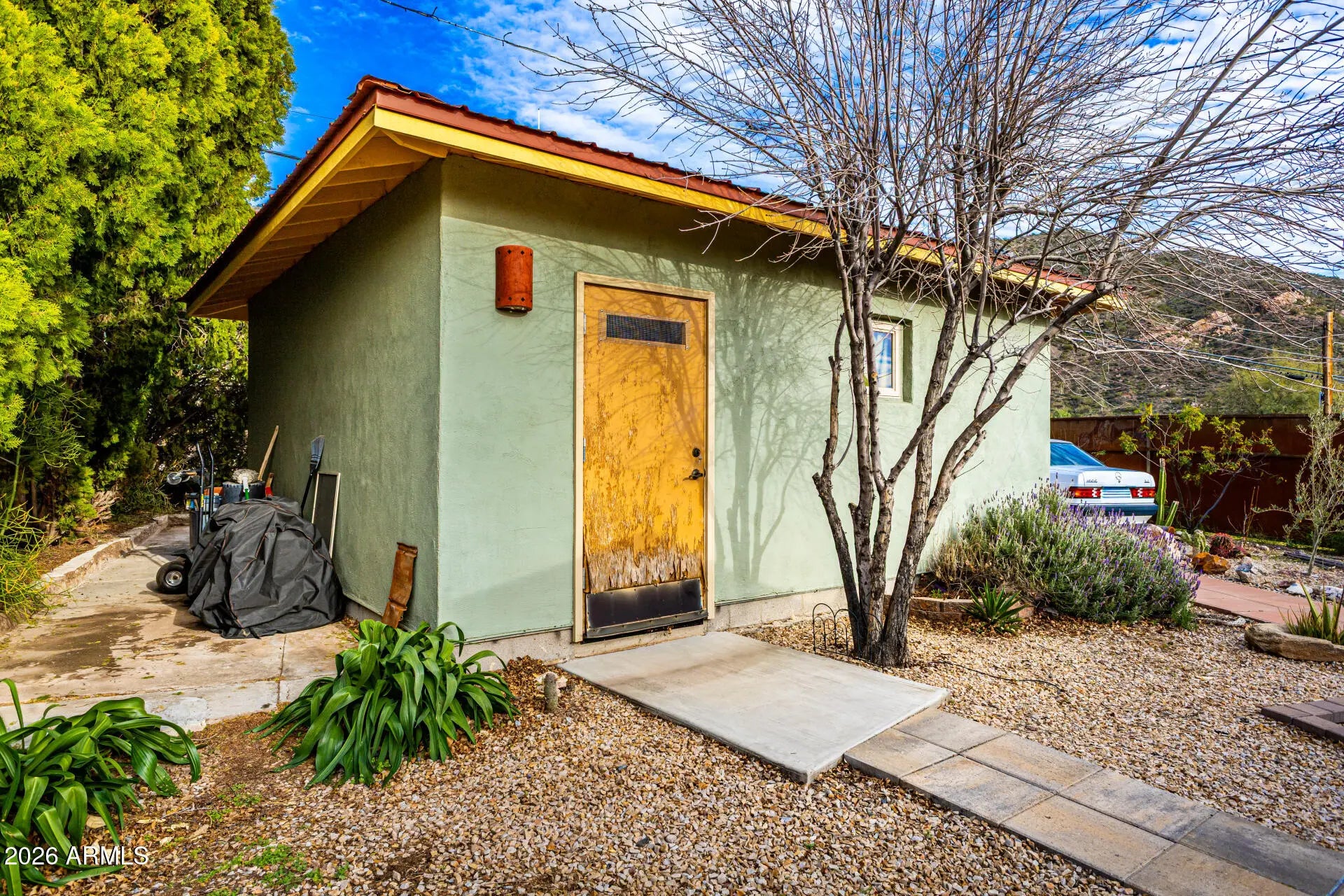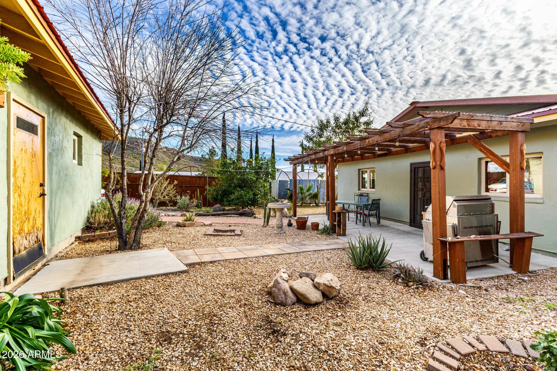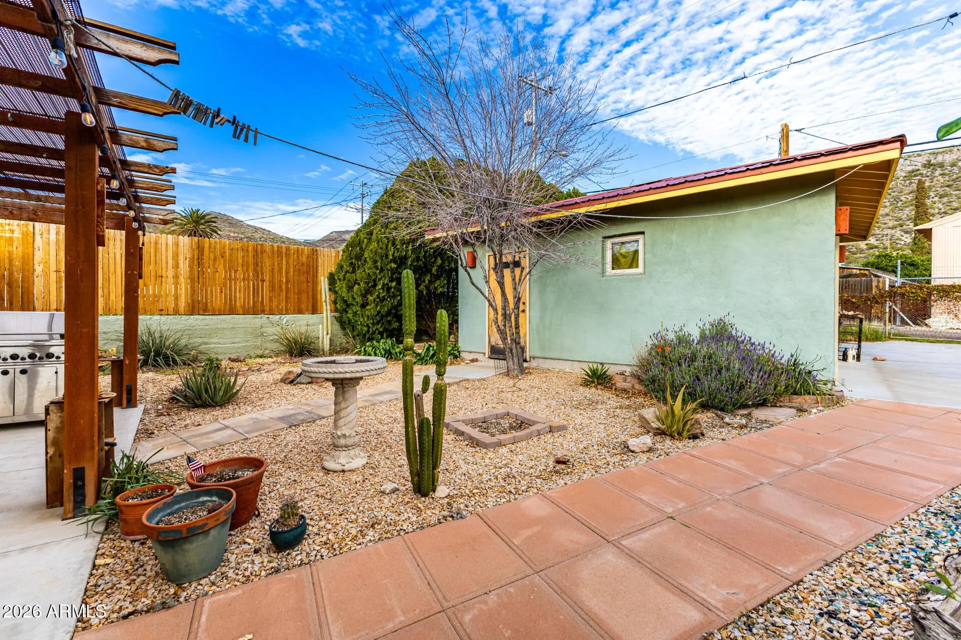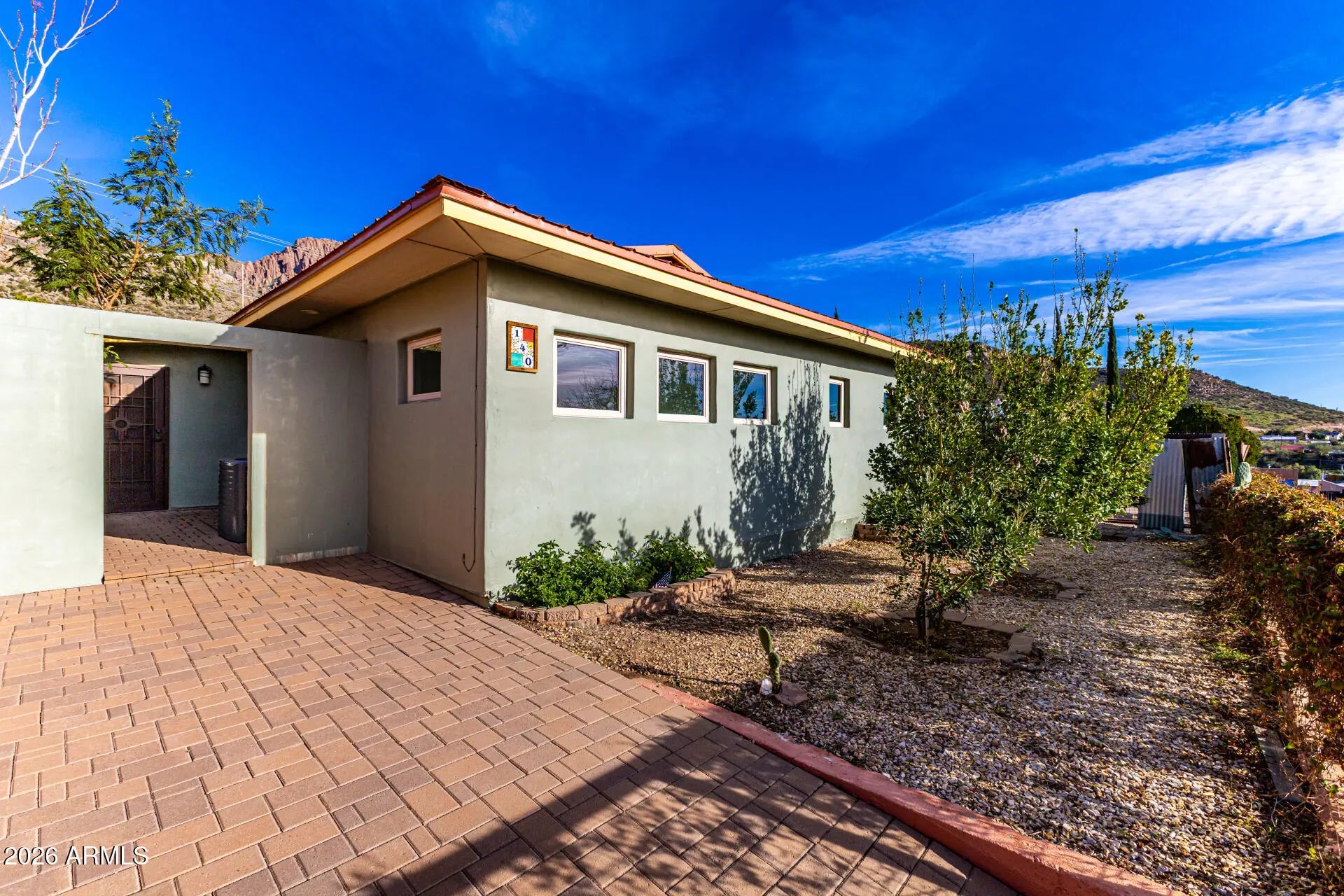 Fantastic opportunity! Garage could be made into a casita has water, power and sewer is also near by. A fully fenced property with a mature landscape & a gated front paver driveway. The interior features a versatile foyer, neutral palette, and tile flooring t/out. The living & dining room combo is paired w/vaulted ceiling. The galley kitchen has SS appliances, designer tile backsplash, a walk-in pantry, and wood cabinets. Main bedroom boasts a triple-wide closet, sitting/office room, & an ensuite w/dual sinks. Secondary bedroom w/outdoor access. If you twant to relax or enjoy BBQ, you have an open patio on the sideyard & a Pergola in the backyard! Also including a detached 1-car garage, along with an RV gate & parking, accessible from the alley. Plus, Stunning Mountain View's! Visit today