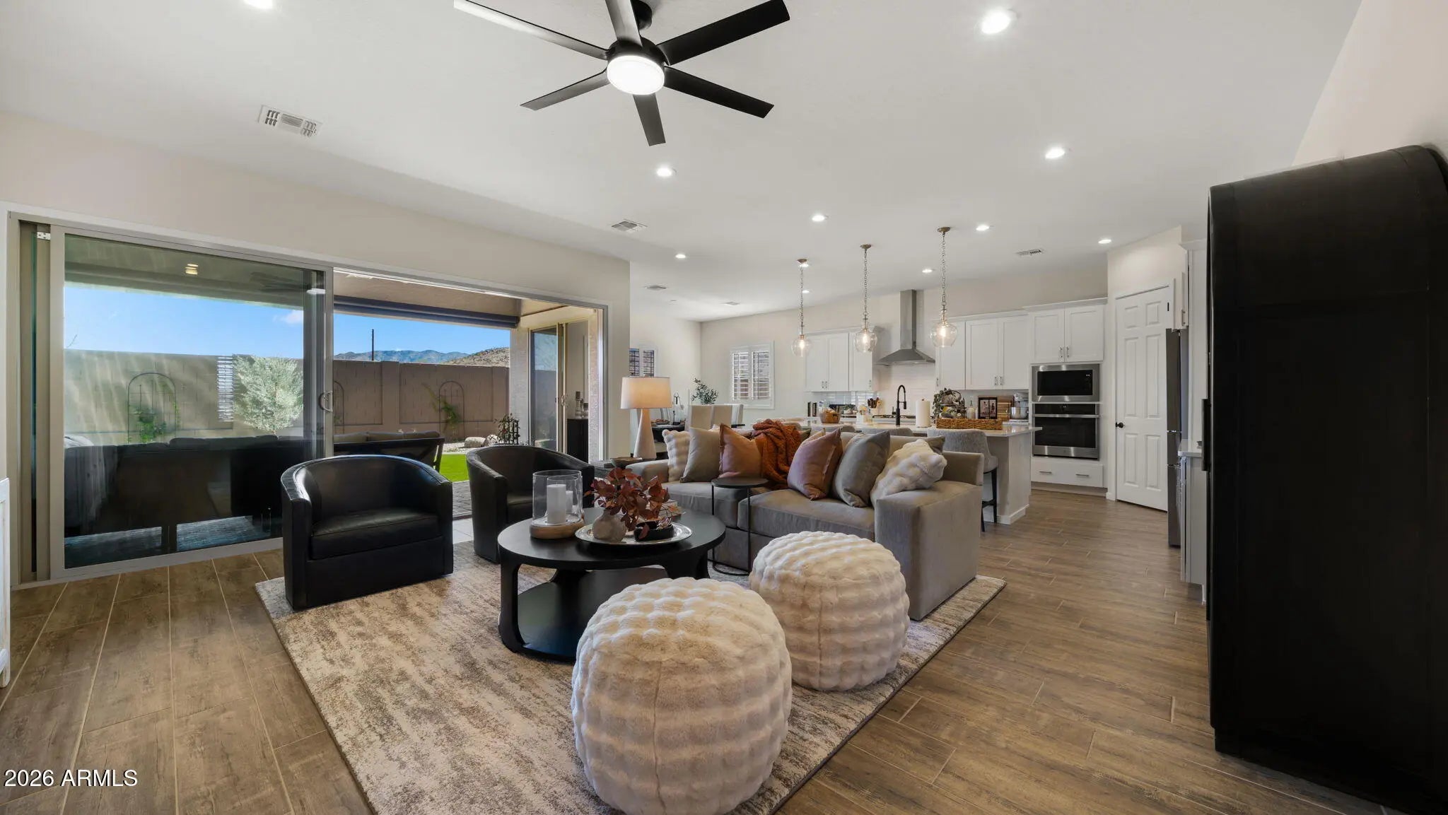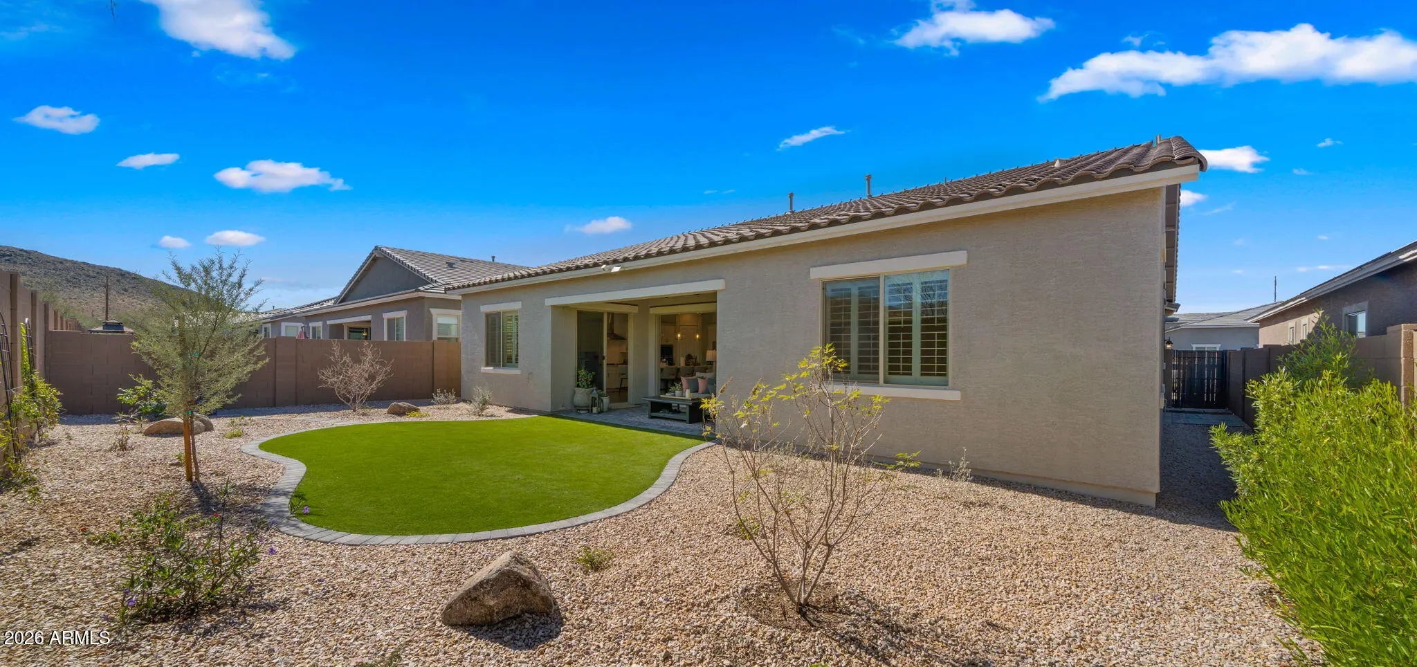 New Construction | Premium View Lot | Designer Upgrades Throughout Exquisite luxury estate situated on a premium lot showcasing unobstructed, panoramic mountain views. Designer-owned & thoughtfully enhanced with over $50,000 in upgrades, this residence offers a level of finish and detail that surpasses the builder models and stands apart from other new construction opportunities in the community. Featuring soaring 10' ceilings with tray details, a desirable split floorplan, and expansive multi-sliding glass doors that seamlessly blend indoor and outdoor living. The chef's kitchen is a true showpiece with premium appliances, upgraded 42'' cabinetry, quartz countertops, designer backsplash, elevated lighting, and an open-concept layout ideal for entertaining -- all framed by breathtaking... breathtaking mountain vistas. The luxurious primary retreat offers a spa-inspired bath complete with a deluxe drop-in soaking tub, separate walk-in shower, dual vanities, and refined tile selections. Every finish has been carefully curated, including upgraded flooring and bathroom tile, contemporary baseboards, premium fixtures, gutters, and a motorized patio shade for added comfort. Low-maintenance and truly move-in ready, this home provides the advantage of new construction without the wait, added expense, or uncertainty of completing upgrades after closing. A rare opportunity to own a turnkey, designer-finished luxury residence with exceptional views. Don't wait to start living here, choose the best home in the community...available now.
