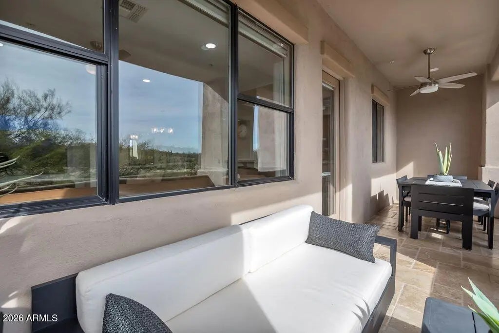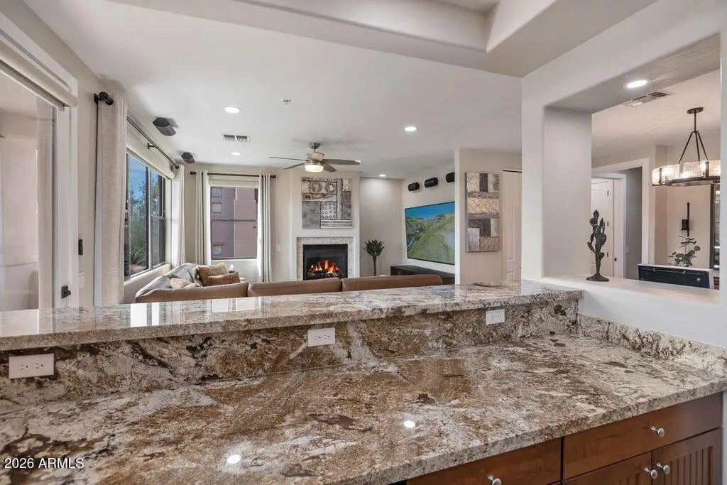 Experience the epitome of golf course living in this remodeled 2 bed, 2 bath ground-floor condo on the 16th fairway in Legend Trail in Scottsdale. Enjoy stunning Desert Course views and serene Sonoran Desert surroundings from your private patio. Interior upgrades include travertine flooring, granite countertops, stainless GE Café appliances, and pullout lower kitchen shelves. Both the primary suite and second bedroom feature an ensuite bath. Additional highlights: owned security system and 5.1 surround sound. Ideal lock-and-leave, seasonal retreat, or full-time residence with resort-style community amenities.