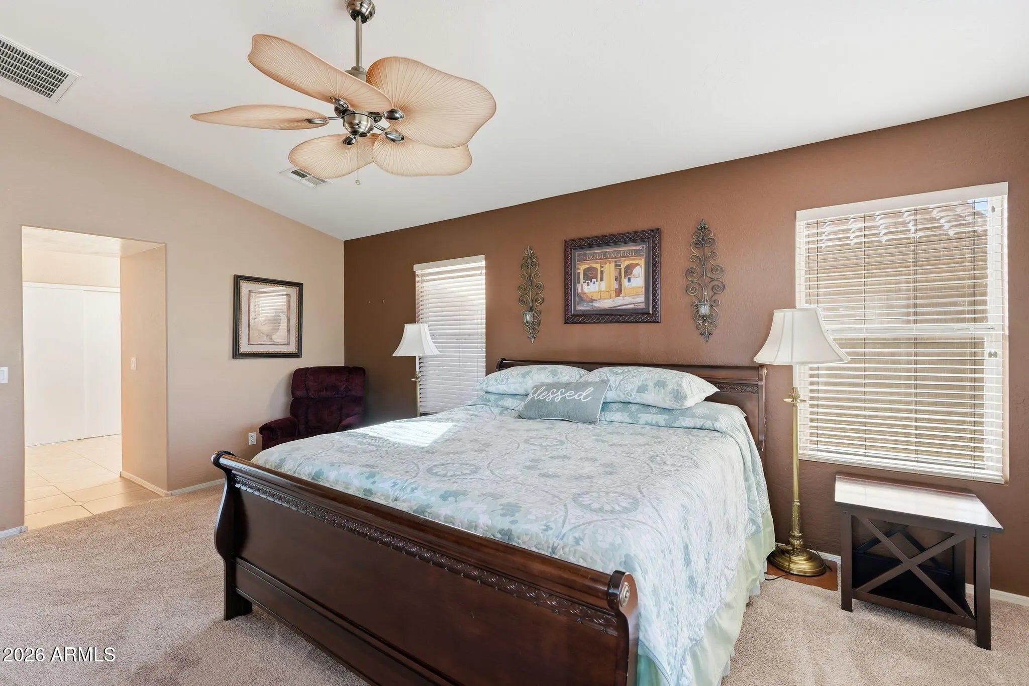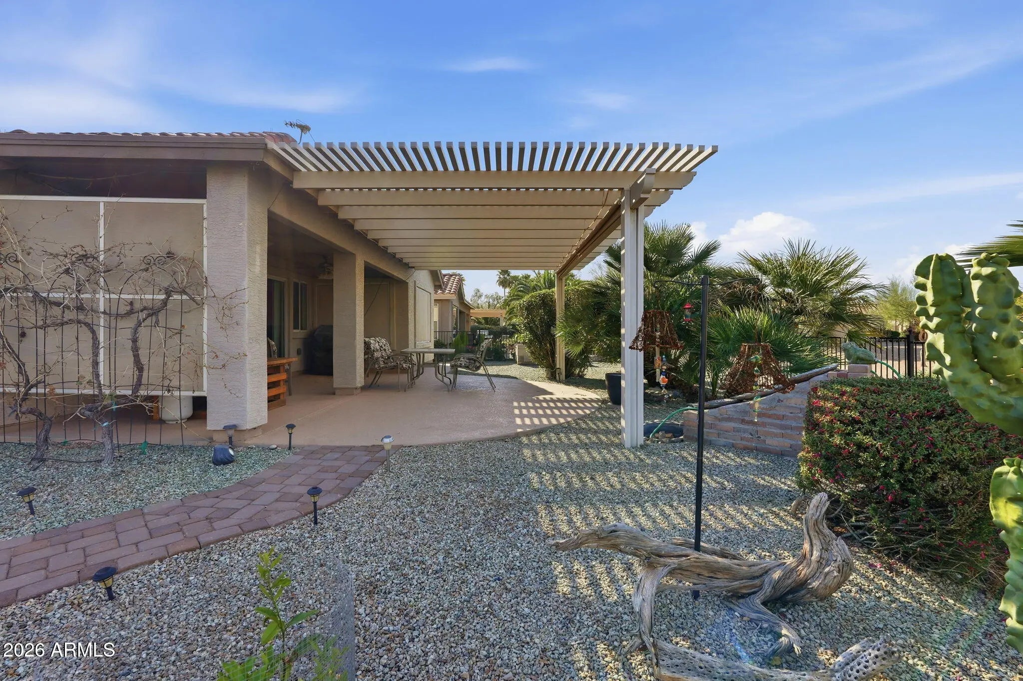 Located in the 55+ community of Mission Royale, this FULLY FURNISHED (including the Golf Cart) 2 bedroom, 2 bathroom home is located on a desirable FENCED corner lot backing to a common area with no neighbors behind you. The open floor plan provides an ideal layout for everyday living and entertaining with tile in all the main areas and carpet in the bedrooms. The kitchen is complete with an island/breakfast bar, lots of counter space, walk in pantry and plenty of storage. The primary suite features an ensuite bathroom with tile walk in shower and generous closet space. A secondary bedroom and full bath provide flexibility for guests or office use. Out back enjoy the views and the beautiful Arizona weather under the extended pergola patio. You'll love the mature fruit trees, grape vines and garden area ready for you to add your favorite vegetables! Don't miss this one!