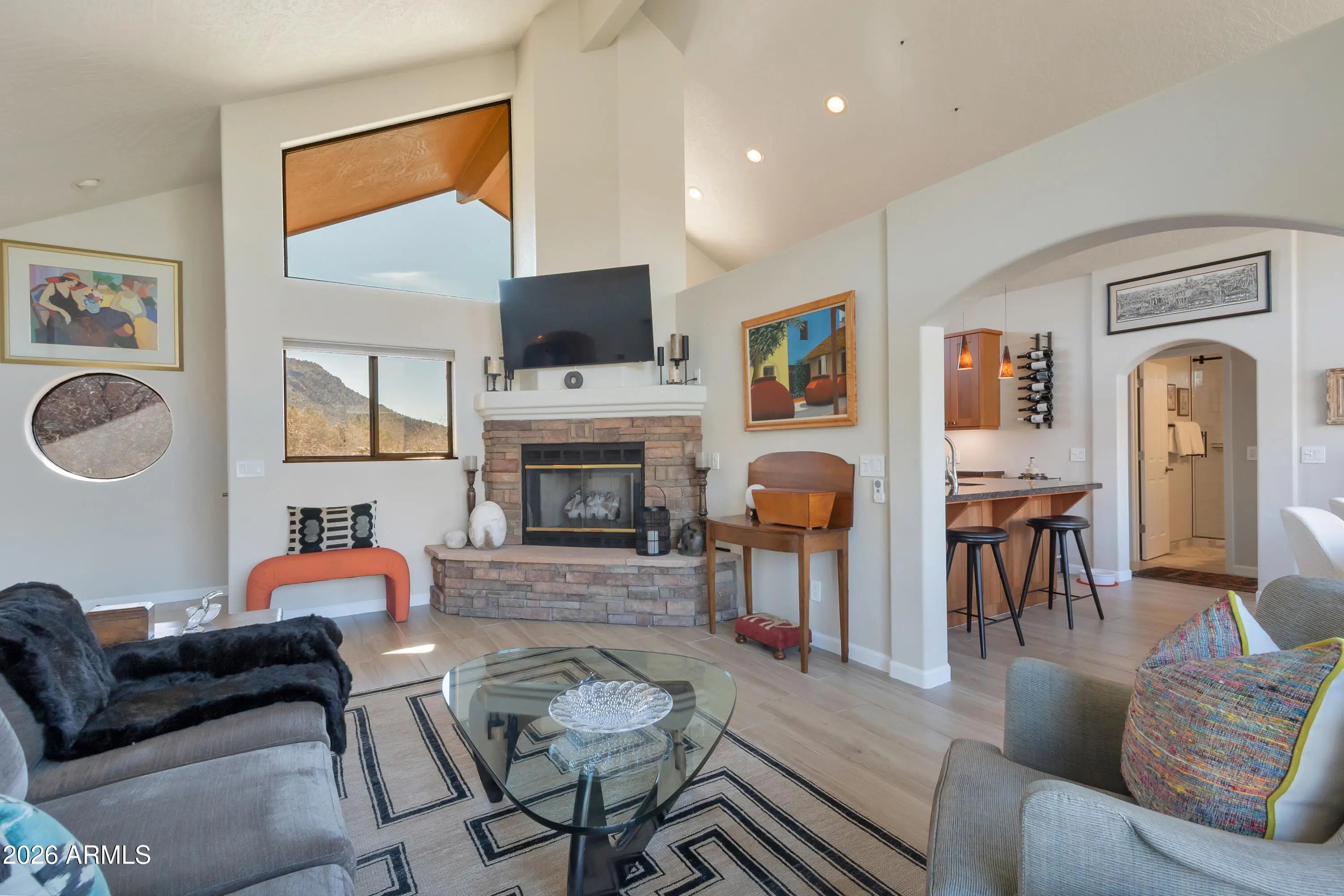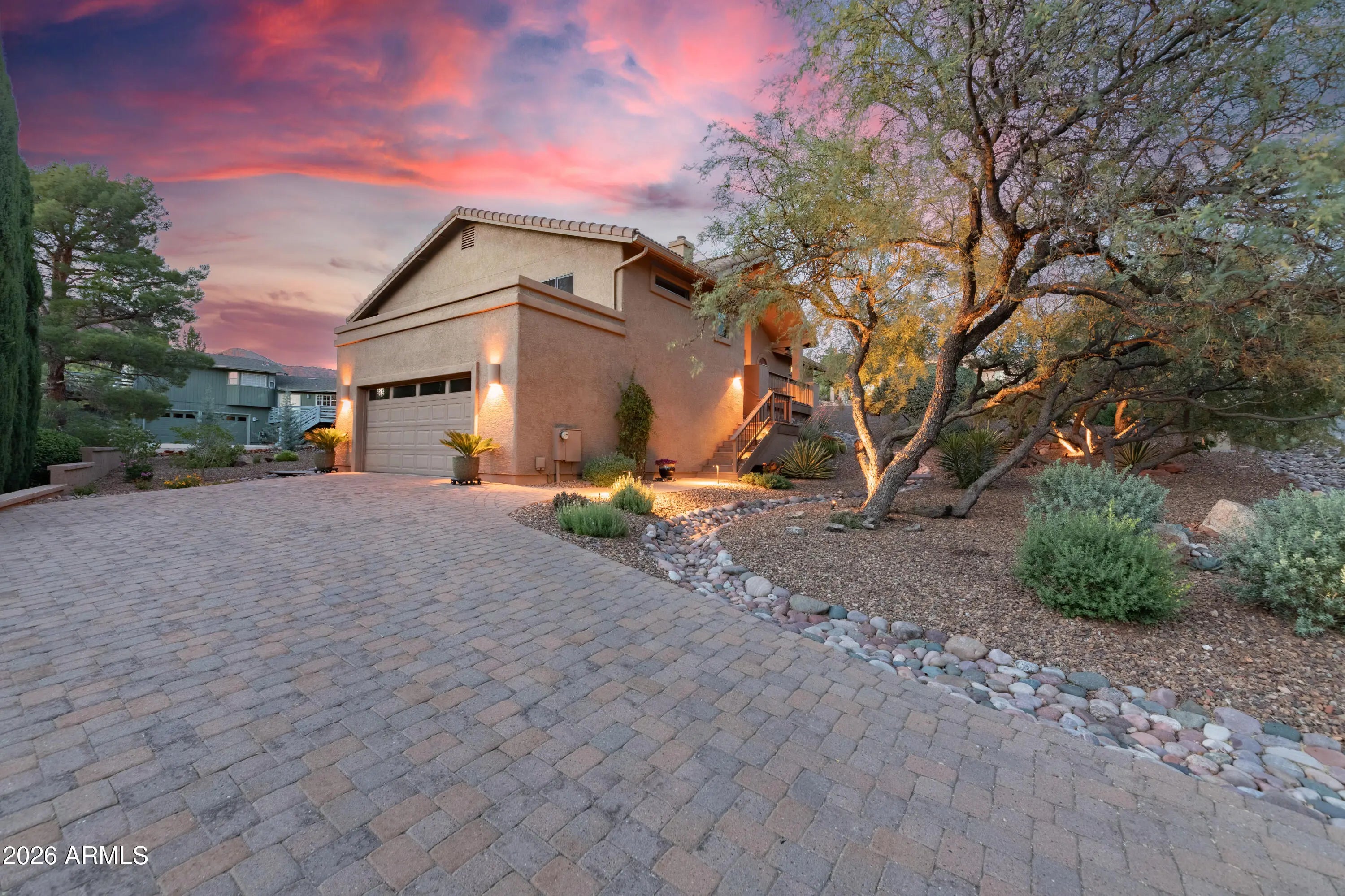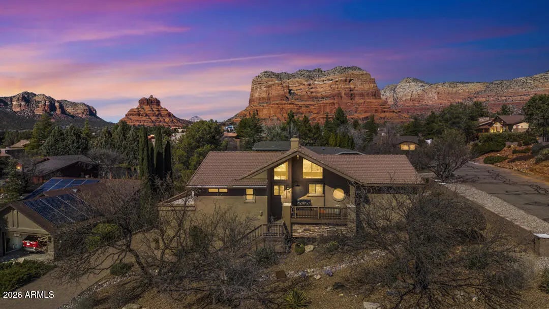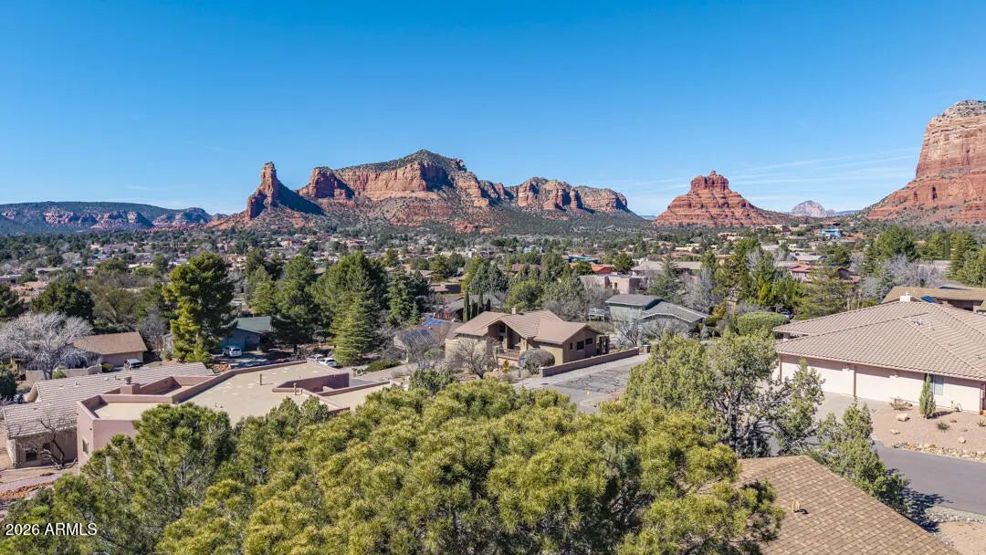 Positioned to capture sweeping, panoramic Red Rock views in Sedona's highly desirable Village of Oak Creek, this meticulously upgraded residence delivers refined desert living with exceptional privacy and comfort. Expansive outdoor decks create a seamless indoor-outdoor lifestyle, offering the perfect vantage point for morning sunrises, evening sunsets, and year-round enjoyment of Sedona's iconic landscape. Inside, the 3-bedroom, 2-bath home has been extensively remodeled between 2023 and 2024 with a focus on quality, cohesion, and contemporary Southwest elegance. Soaring cathedral ceilings and an open-concept layout create an airy, light-filled environment, enhanced by new porcelain tile flooring throughout the primary living areas, plush carpeting in guest rooms, designer interior paint, and updated lighting and ceiling fans that add warmth and sophistication. The guest bathroom has been thoughtfully renovated, elevating both style and functionality for residents and guests alike. Outdoor living has been equally transformed. Professionally designed landscaping, new garden walls, an easy access paver walkway to the home, and a fully automated drip irrigation system create a lush, private setting framed by carefully selected plantings and accent lighting. The result is a tranquil, low-maintenance oasis that enhances both daytime beauty and evening ambiance. Practical luxury continues with a spacious two-car garage featuring custom storage systems, a craftsman workbench with shelving, and an additional dedicated bonus/storage room and wine cellar. A paver driveway accommodates up to four vehicles, with additional parking at the street entry for guests. A newer roof installed in 2019 with a 30-year warranty adds further peace of mind. With over $65,000 in recent improvements, curated finishes throughout, and commanding Red Rock vistas from multiple vantage points, this Village of Oak Creek home represents a rare opportunity to own a beautifully upgraded Sedona retreat where thoughtful design and natural beauty converge.