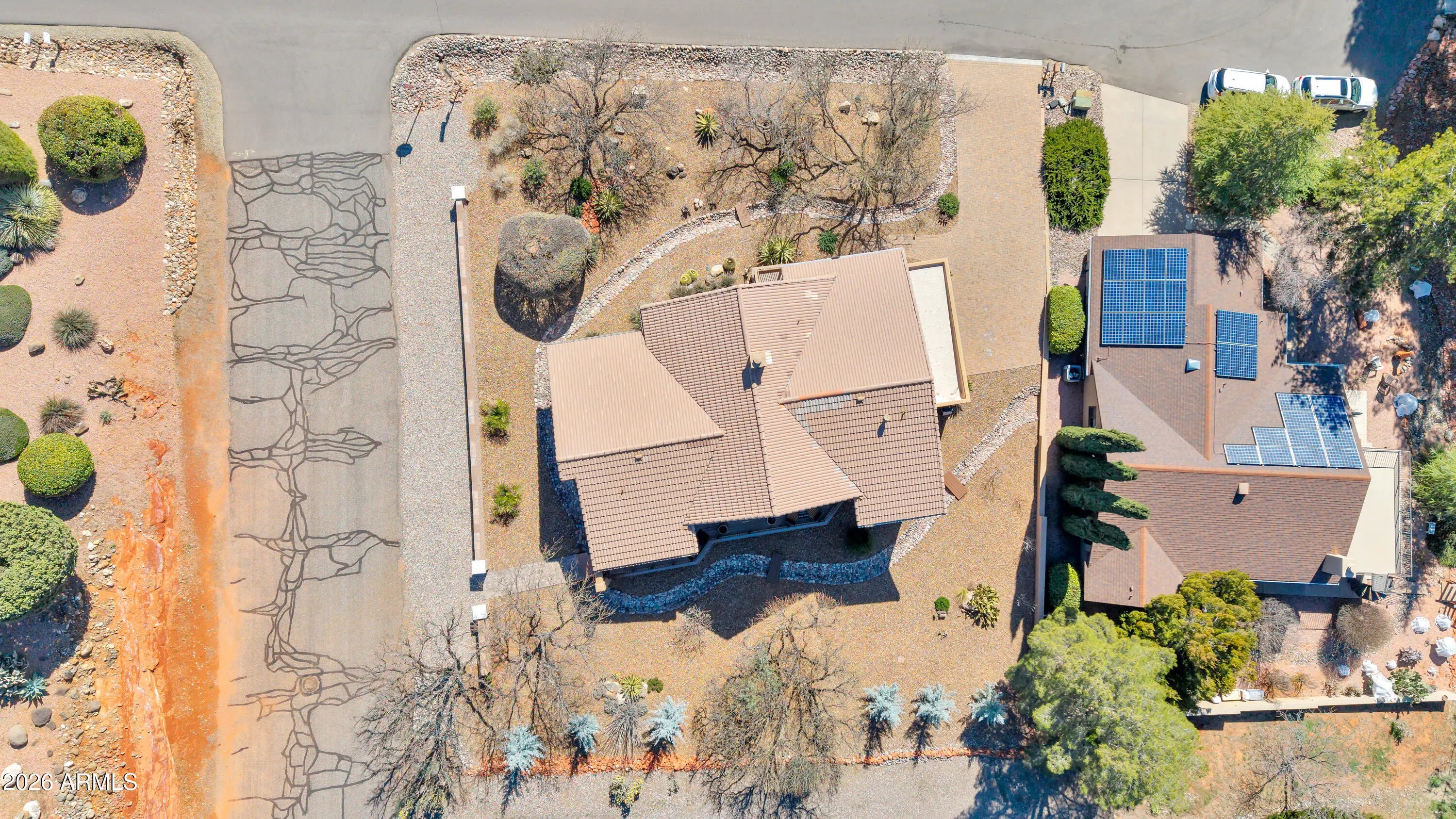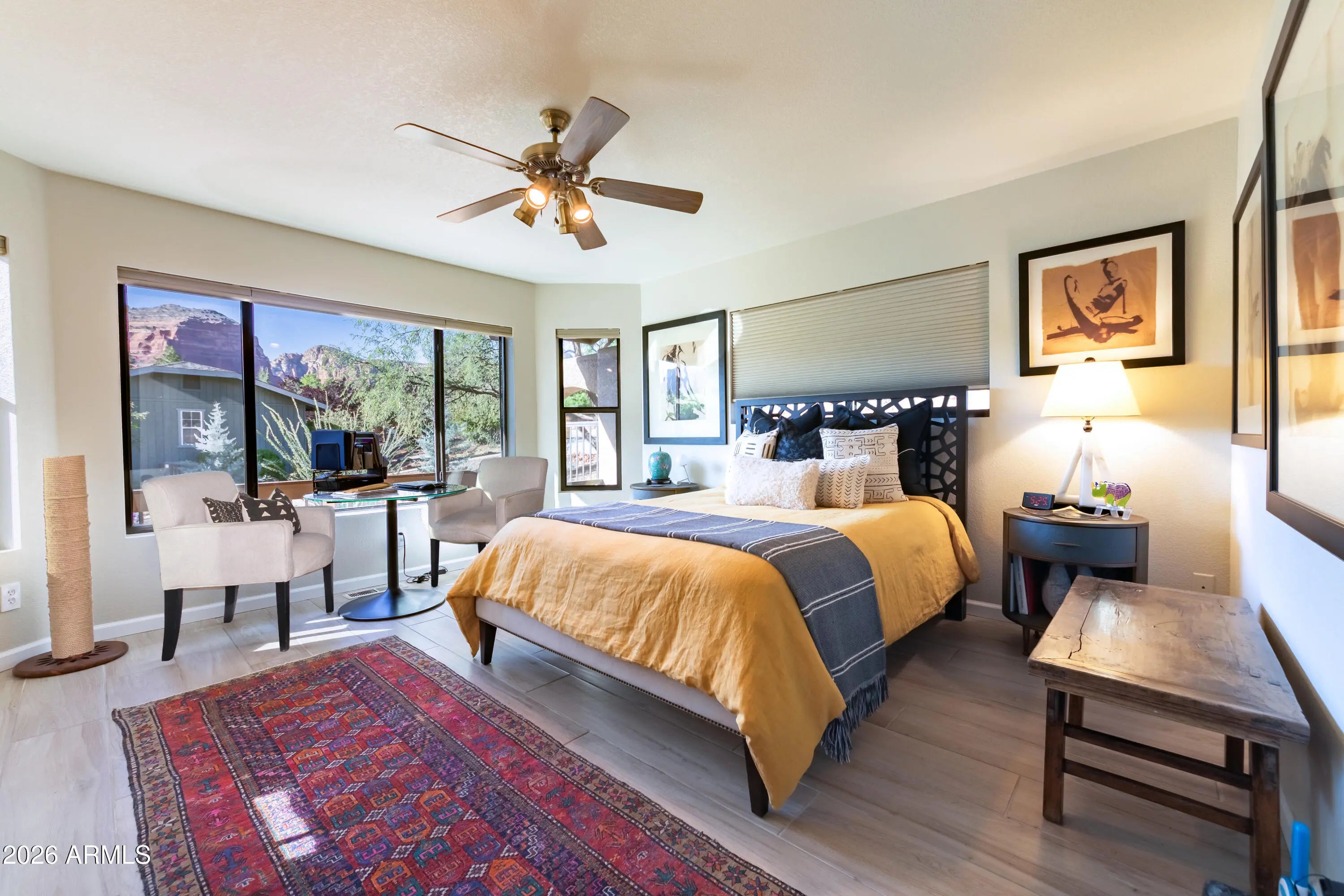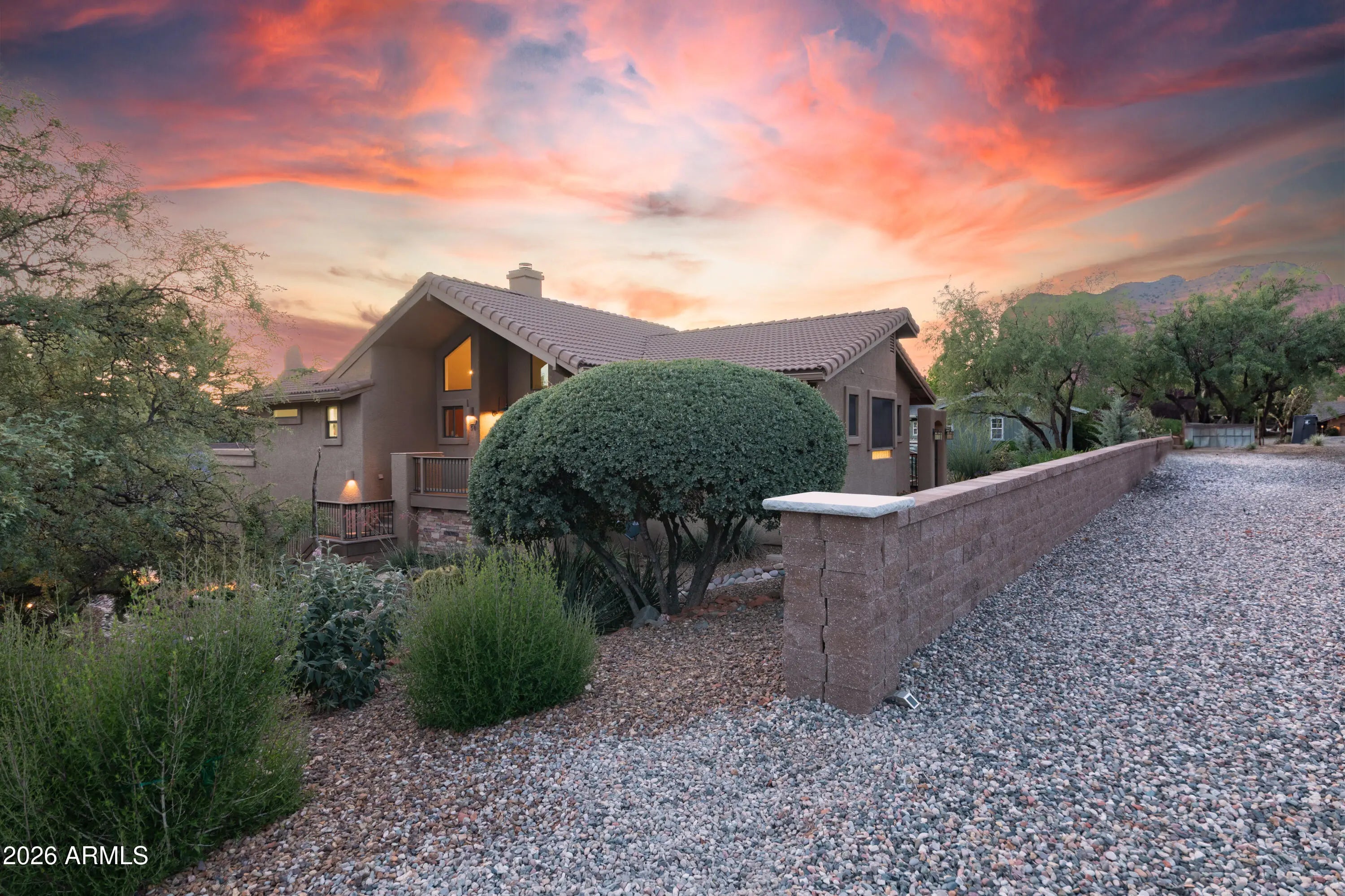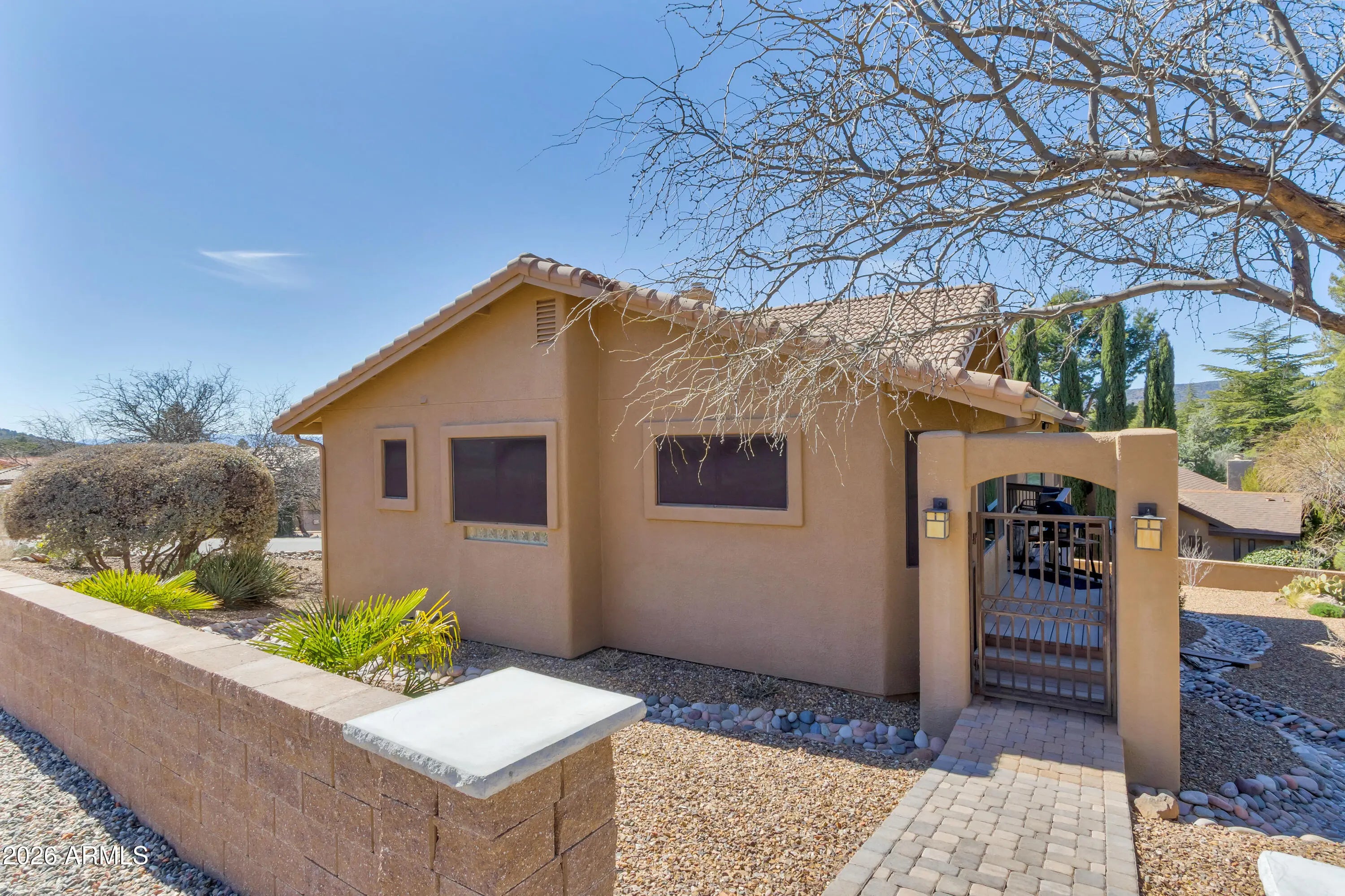 Positioned to capture sweeping, panoramic Red Rock views in Sedona's highly desirable Village of Oak Creek, this meticulously upgraded residence delivers refined desert living with exceptional privacy and comfort. Expansive outdoor decks create a seamless indoor-outdoor lifestyle, offering the perfect vantage point for morning sunrises, evening sunsets, and year-round enjoyment of Sedona's iconic landscape. Inside, the 3-bedroom, 2-bath home has been extensively remodeled between 2023 and 2024 with a focus on quality, cohesion, and contemporary Southwest elegance. Soaring cathedral ceilings and an open-concept layout create an airy, light-filled environment, enhanced by new porcelain tile flooring throughout the primary living areas, plush carpeting in guest rooms, designer interior paint, and updated lighting and ceiling fans that add warmth and sophistication. The guest bathroom has been thoughtfully renovated, elevating both style and functionality for residents and guests alike. Outdoor living has been equally transformed. Professionally designed landscaping, new garden walls, an easy access paver walkway to the home, and a fully automated drip irrigation system create a lush, private setting framed by carefully selected plantings and accent lighting. The result is a tranquil, low-maintenance oasis that enhances both daytime beauty and evening ambiance. Practical luxury continues with a spacious two-car garage featuring custom storage systems, a craftsman workbench with shelving, and an additional dedicated bonus/storage room and wine cellar. A paver driveway accommodates up to four vehicles, with additional parking at the street entry for guests. A newer roof installed in 2019 with a 30-year warranty adds further peace of mind. With over $65,000 in recent improvements, curated finishes throughout, and commanding Red Rock vistas from multiple vantage points, this Village of Oak Creek home represents a rare opportunity to own a beautifully upgraded Sedona retreat where thoughtful design and natural beauty converge.