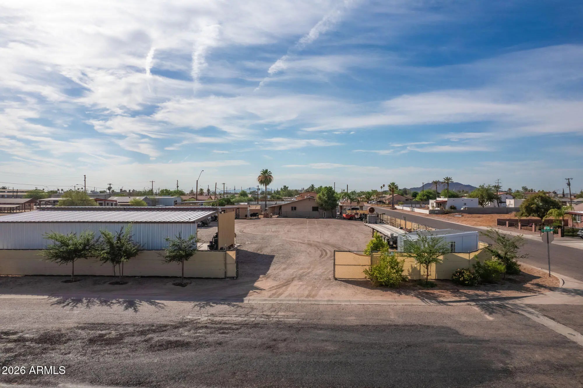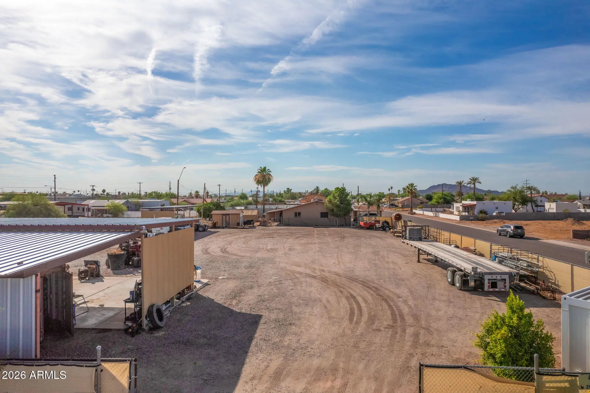 Ideal location for equipment or trucking operation! 2 parcels netting 25,500 sqft. 8 x 20 office, 50' x 25' steel shade structure with concrete floor and 400 amp outlets, another 40' x 15' steel shade structure.