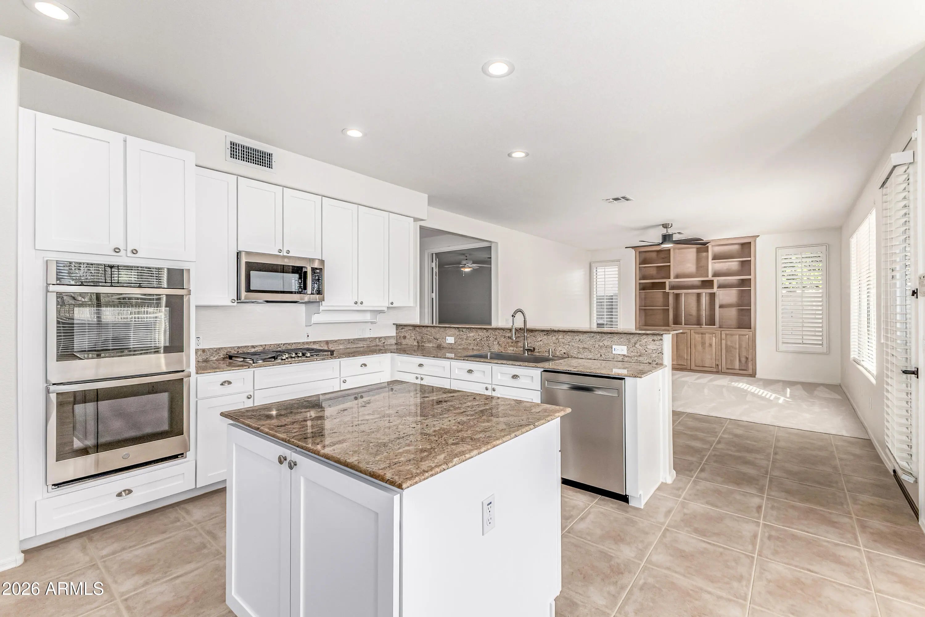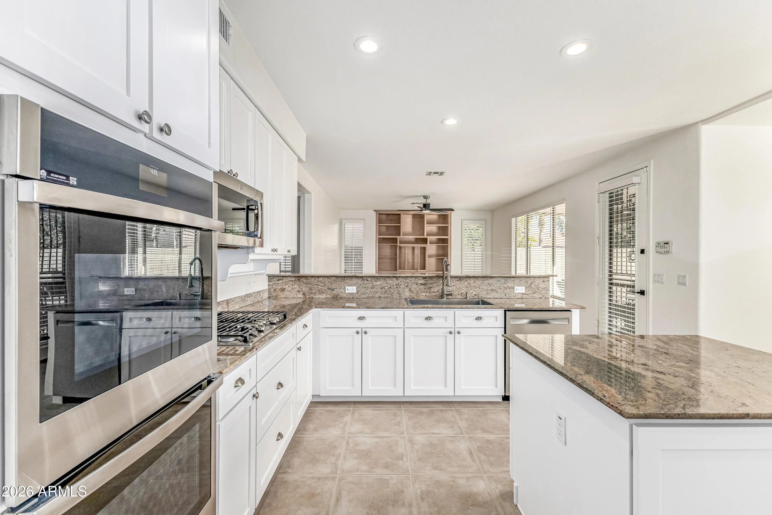 Experience elevated living in this stunning 4-bedroom plus den residence featuring a 3-car garage with newly finished epoxy floors and refined desert curb appeal. Inside, soaring vaulted ceilings, abundant natural light, fresh designer paint, plush new carpeting, and elegant can lighting create a sophisticated ambiance. The gourmet kitchen showcases granite countertops, beautifully refinished white shaker cabinetry, designer backsplash, walk-in pantry, center island, and premium new appliances, including a double oven with air fryer, cooktop, and microwave. A new upgraded self-adhesive double-ply roof and leased solar with upgraded critter guards enhance efficiency and peace of mind. Move-in ready and thoughtfully curated, this home blends luxury, comfort, and effortless Arizona living. Enjoy enchanting sunsets in the backyard, boasting a covered patio, pristine artificial turf, and a refreshing pool and spa. Make this fantastic gem yours today!