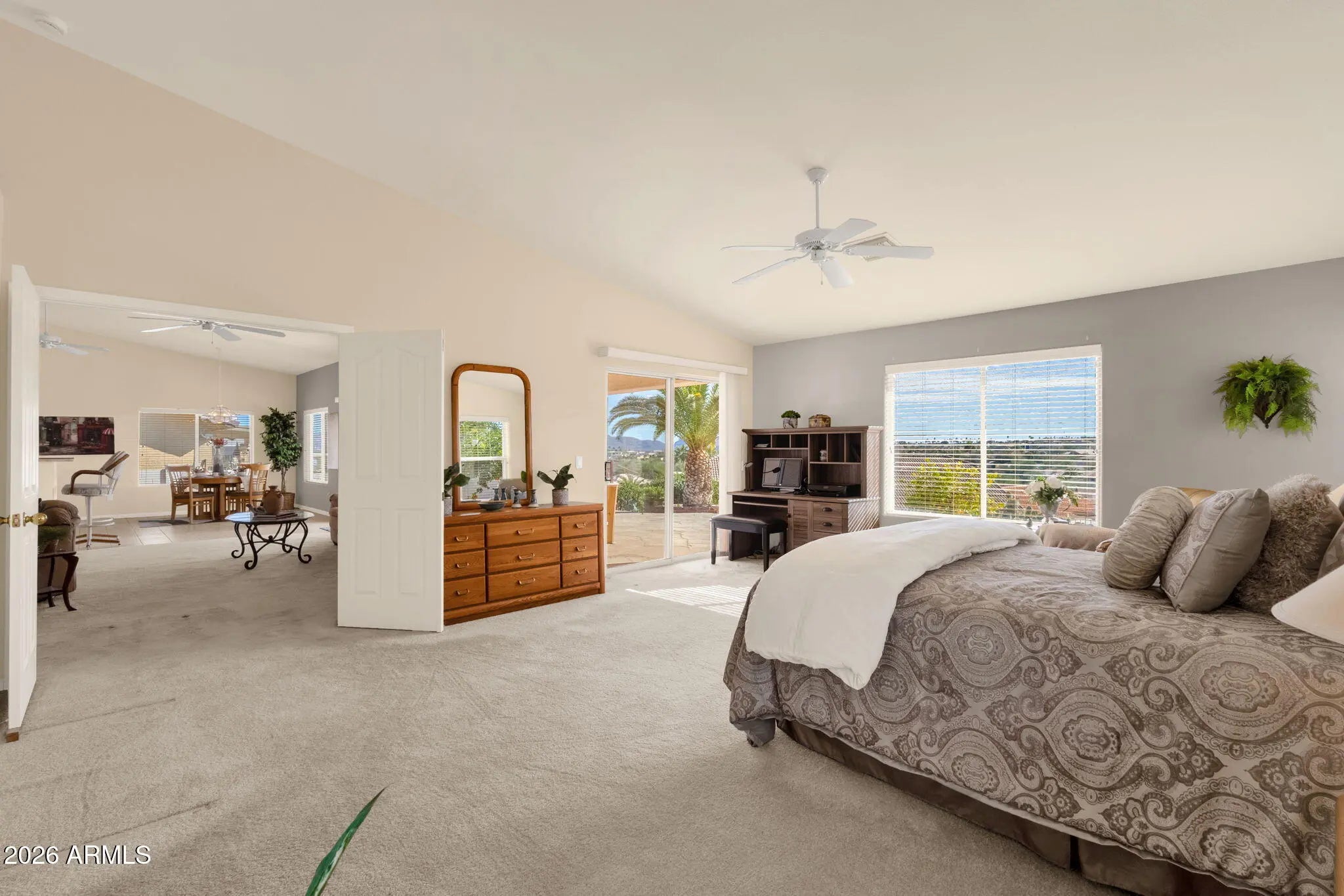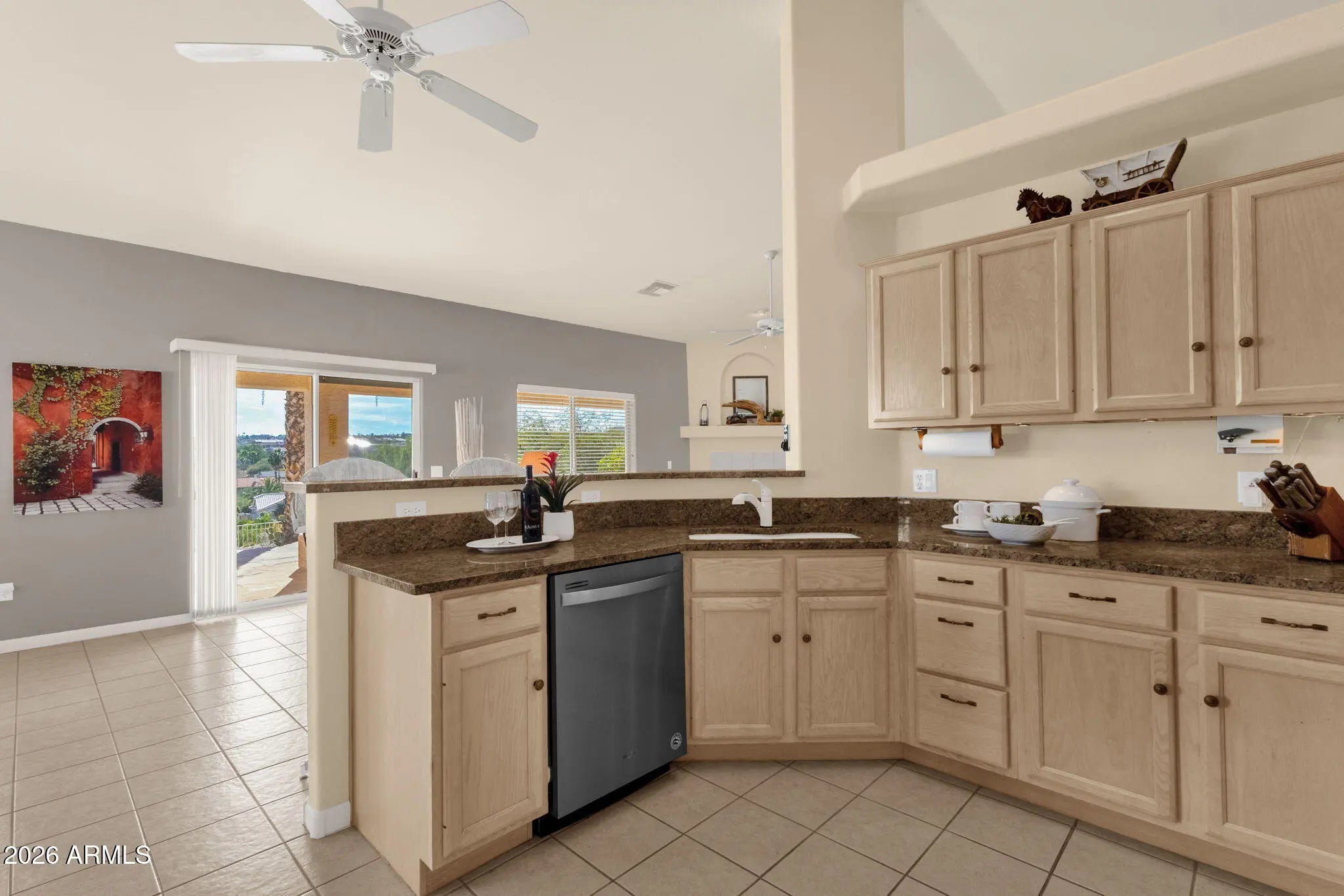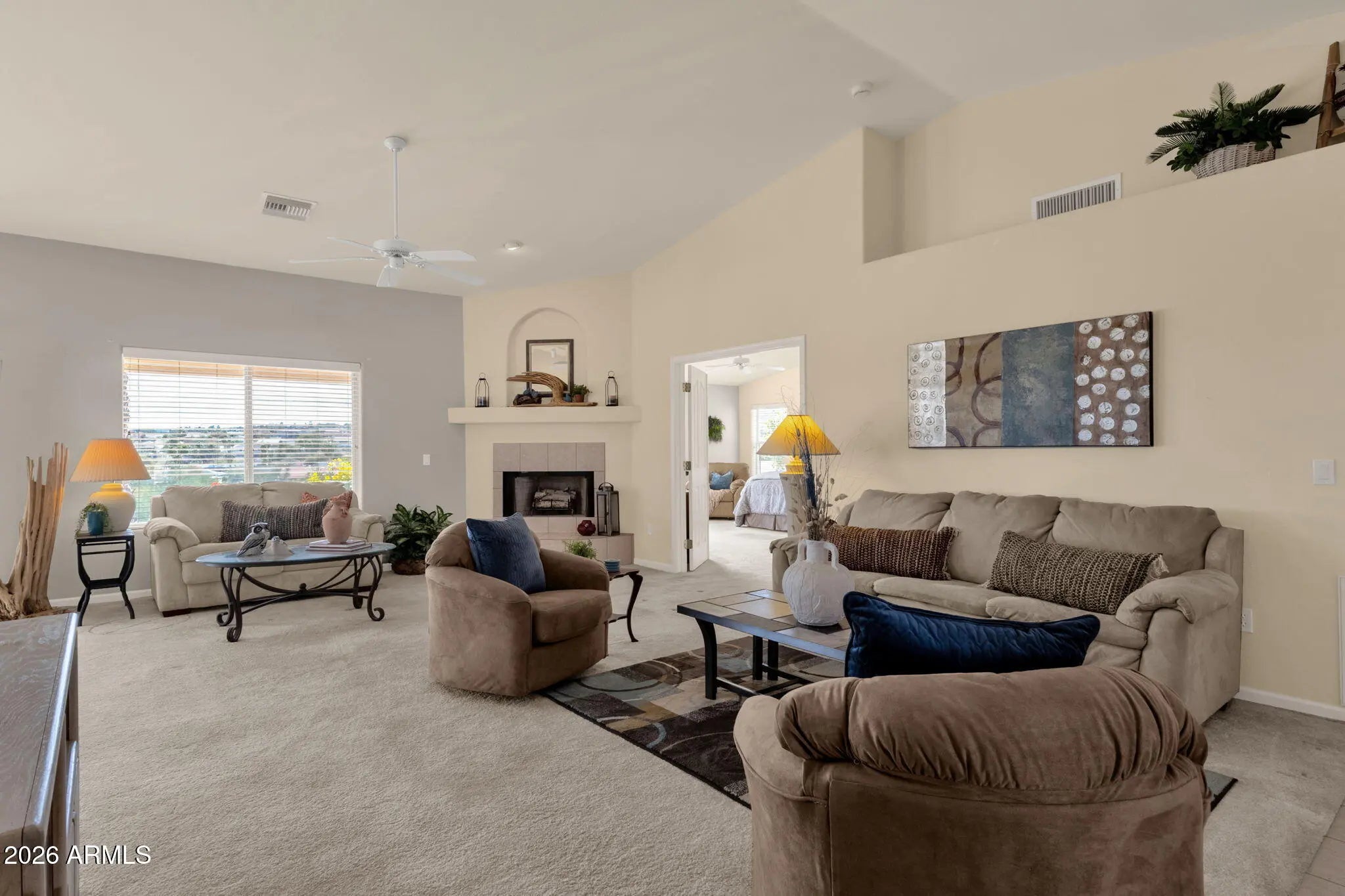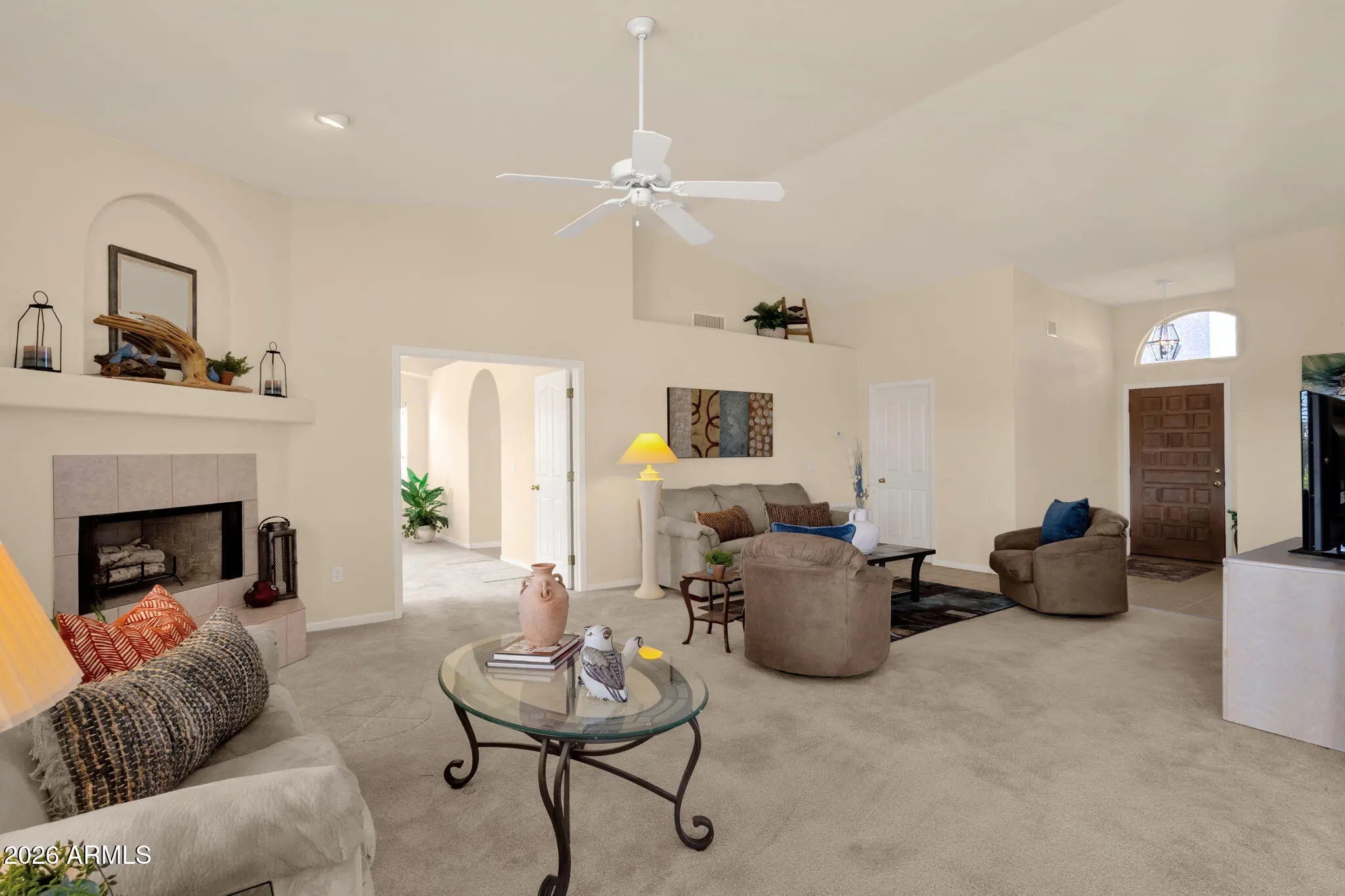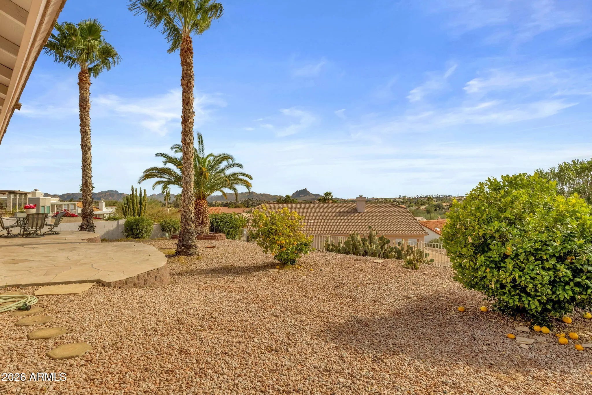 Situated on a quiet street in Fountain Hills, this well-cared-for single-level home offers comfortable living with scenic desert surroundings. Featuring 3 bedrooms, 2 bathrooms, and 1,957 square feet of living space, the property sits on a spacious 10,001-square-foot lot, designed for privacy and easy outdoor enjoyment. Inside, vaulted ceilings and abundant natural light create an inviting atmosphere across the open living areas, where a fireplace anchors the main gathering space and large windows frame backyard and mountain views. The kitchen provides ample cabinetry, generous counter space, and a breakfast bar that flows seamlessly into the dining and living areas, making it ideal for everyday living and entertaining. The primary suite serves as a relaxing retreat with a dual-sink vanity, soaking tub, and separate shower, while secondary bedrooms offer flexibility for guests, workspace, or hobbies. Outdoors, a covered patio overlooks low-maintenance desert landscaping and captures elevated views that enhance Arizona's indoor-outdoor lifestyle. The home's location provides convenient access to Golden Eagle Park's recreation amenities, nearby walking paths and sports facilities, Fountain Hills schools, and major roadways such as Golden Eagle Boulevard and Palisades Boulevard, placing shopping, dining, and the iconic Fountain Hills fountain just minutes away.