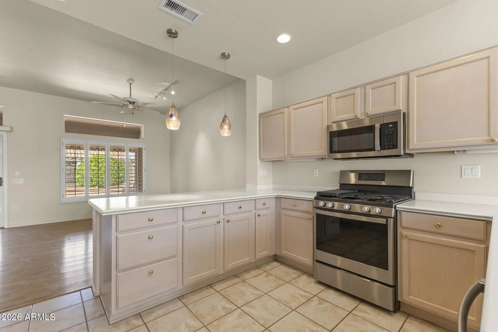 This Chandler has great curb appeal. Inviting entry with double doors opens into the foyer with the large flexible living/dining space with newer laminate wood flooring. The spacious kitchen has plenty of cabinets, newer stainless appliances, gas range, Corian countertops, a huge pantry with double doors and pull-outs, beautiful pendants over the breakfast bar and a convenient dining nook. The primary suite has a lovely bay window and vaulted ceiling in bedroom, double sinks, large walk-in shower with updated fixtures and a raised toilet in the ensuite bath. The guest bedroom has lots of built-ins, including a Murphy bed and LED lighting, offering plenty of options as craft/sewing room or office. Other features include plantation shutters, ceiling fans and 6 panel interior doors. Plenty of windows and a large patio door slider with double security doors opens onto a large, expanded covered patio. A second patio area located to the left, outside of the primary suite is complete with electric retractable awning w/newcanvas (2024). The backyard, fenced with wrought iron on block, has four mature fruit trees offering a variety of citrus. Enjoy the bounty of lemons, Washington navels, Arizona sweet oranges and tangelos. The large inside laundry room has a newer washer and dryer, a sink, lower and upper cabinets for plenty of storage, leading into the garage. The 2.5 car garage is well lit with LED lights and offers plenty of space for cars, golf cart, storage, work space and lots of cabinets. HVAC and Roof were replaced in 2018. Soft water unit is new as of 2024. Water heater was replaced in 2024.