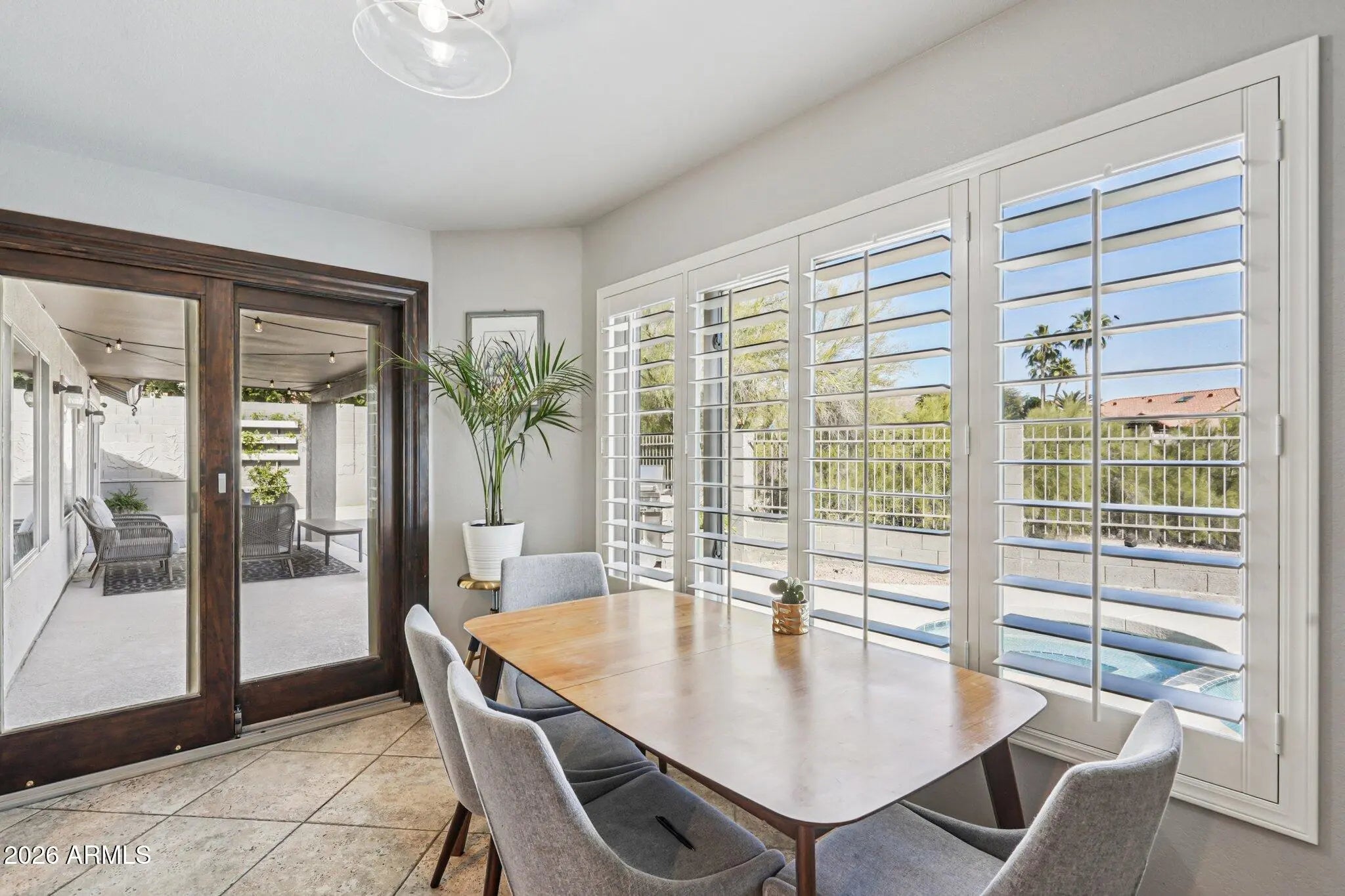 Beautifully updated single-level home in the sought-after Rio Montana community of Scottsdale, offering 3 bedrooms, 2.5 bathrooms, and a dedicated den or optional 4th bedroom. This floor plan strikes the right balance between open-concept living and defined spaces, featuring a formal living and dining area anchored by a stone fireplace. The renovated kitchen showcases quartz countertops, new grey cabinetry, stainless steel appliances, and updated lighting, all opening to the main living space. Spacious primary suite with walk-in closet, dual vanities, tiled shower, soaking tub, and solid wood French doors leading to the backyard. Interior updates include wood plank ceramic flooring, updated bathroom cabinetry, updated lighting and fans, updated hardware, baseboards, plantation shutters, and custom doors throughout. Major system updates include new interior paint, two-tone exterior paint, roof (2018), water heater (2021), electrical panel (2021), Anderson energy-efficient windows, and newer Trane HVAC systems (2). A true Arizona setting where nature meets Scottsdale, backing to a natural wash with mountain views and no neighbors directly behind. Outdoor features include a resurfaced Kool deck (2019), pool and spa, extended covered patio, built-in stacked stone BBQ with seating, turf grass, and a spacious yard designed for both relaxing and entertaining. Conveniently located near Desert Mountain High School, BASIS Scottsdale, Mayo Clinic, Rio Montana Park, golf, dining, shopping, and easy access to the 101.