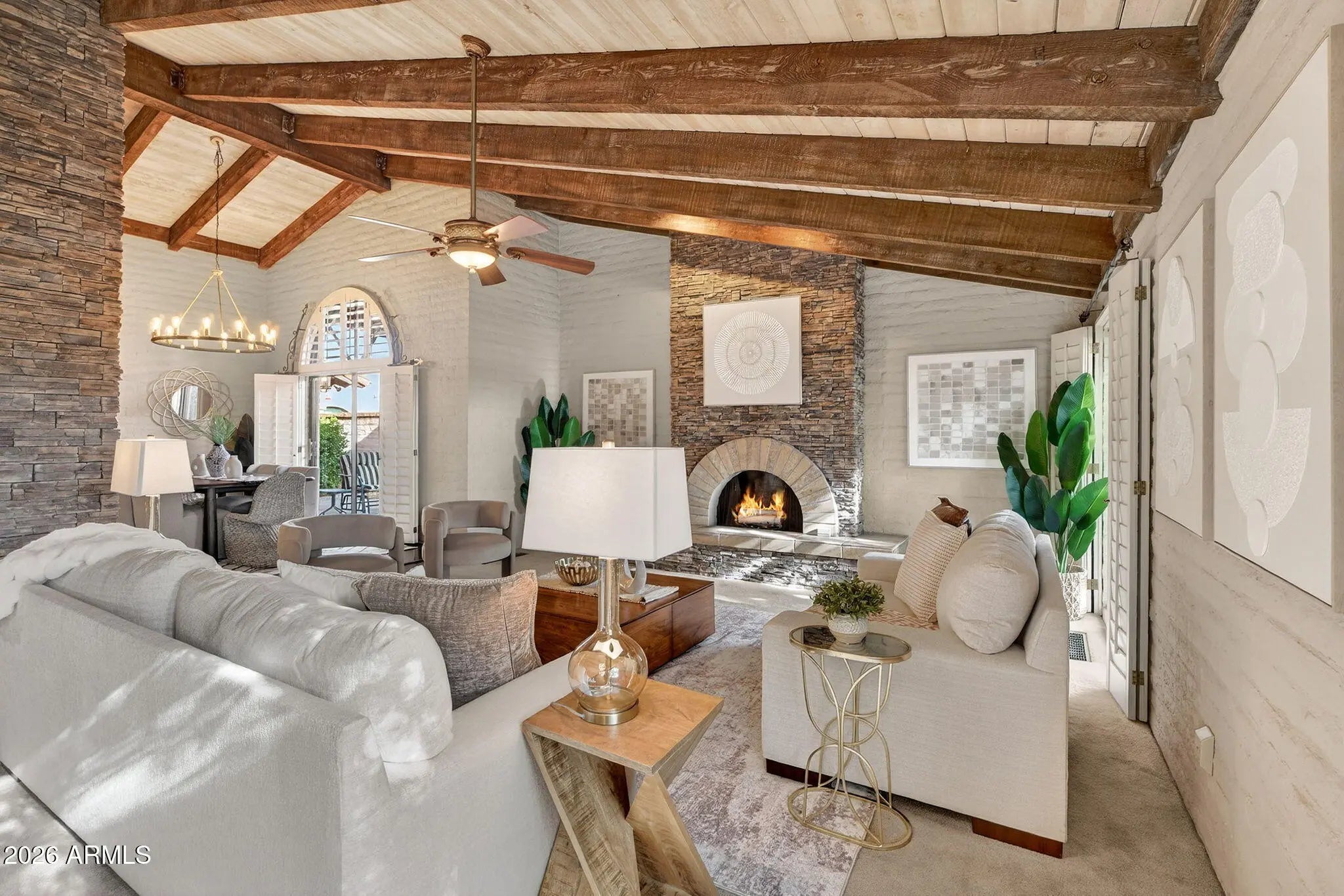 Resting beneath a canopy of mature established trees, in the gated community of Villa Valencia, this Spanish Colonial gem blends timeless character with modern comfort. Offering 2,273 sq ft, the home features three bedrooms, two baths, vaulted wood beamed ceilings, gourmet kitchen, two car garage, workroom, & a cozy wood burning fireplace creating warmth throughout. A spacious primary suite boasts a sunken soaking tub, dual vanities, ample closets, & sitting area. A charming courtyard with splashing fountain, lush established landscaping, & multiple private patios create seamless indoor outdoor living & alfresco dining. Enjoy a resort style community pool, lighted tennis/pickleball court, dog park, & a prime location near the canal, hiking, biking, the Biltmore, local dining, & Sky Ha