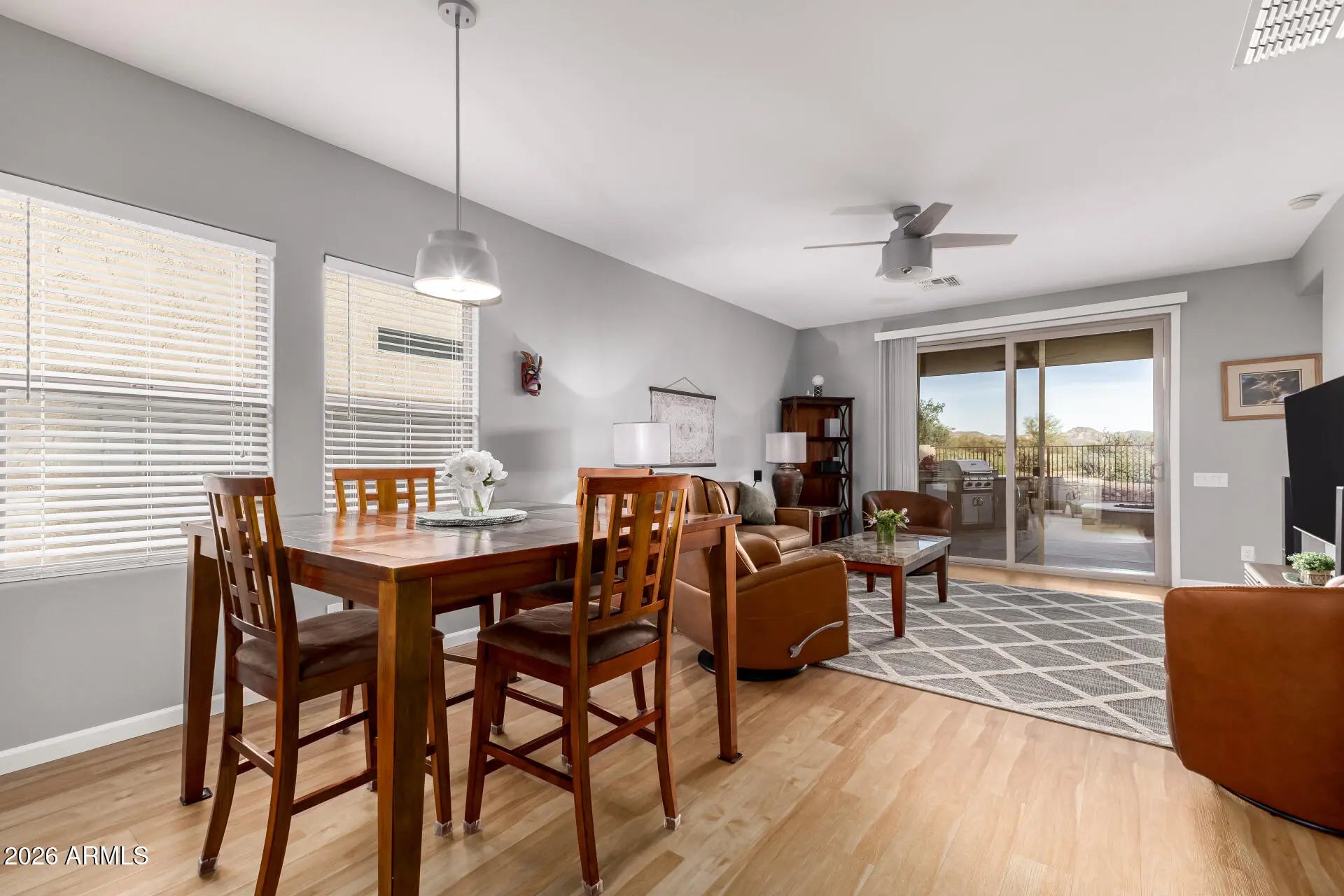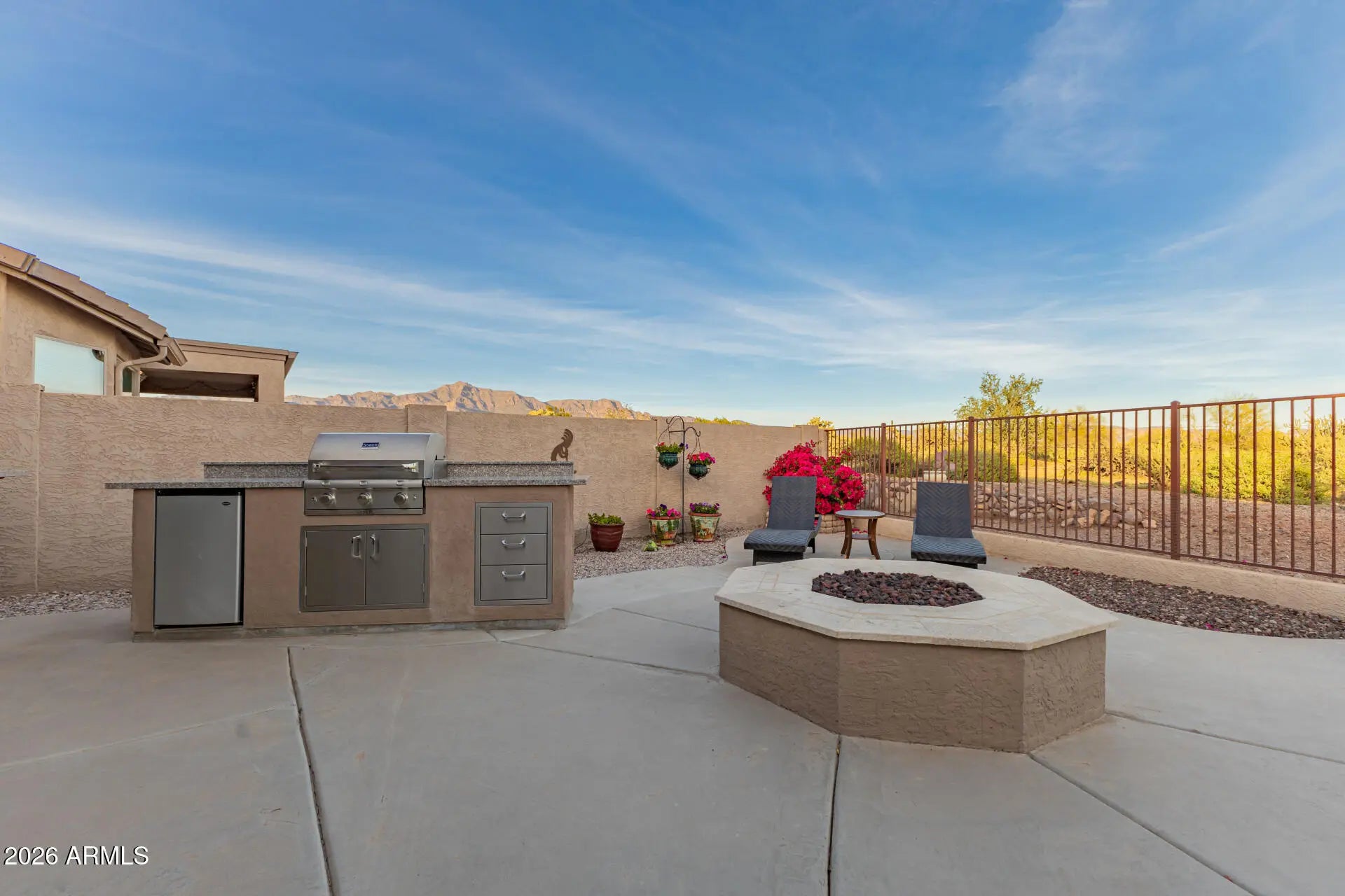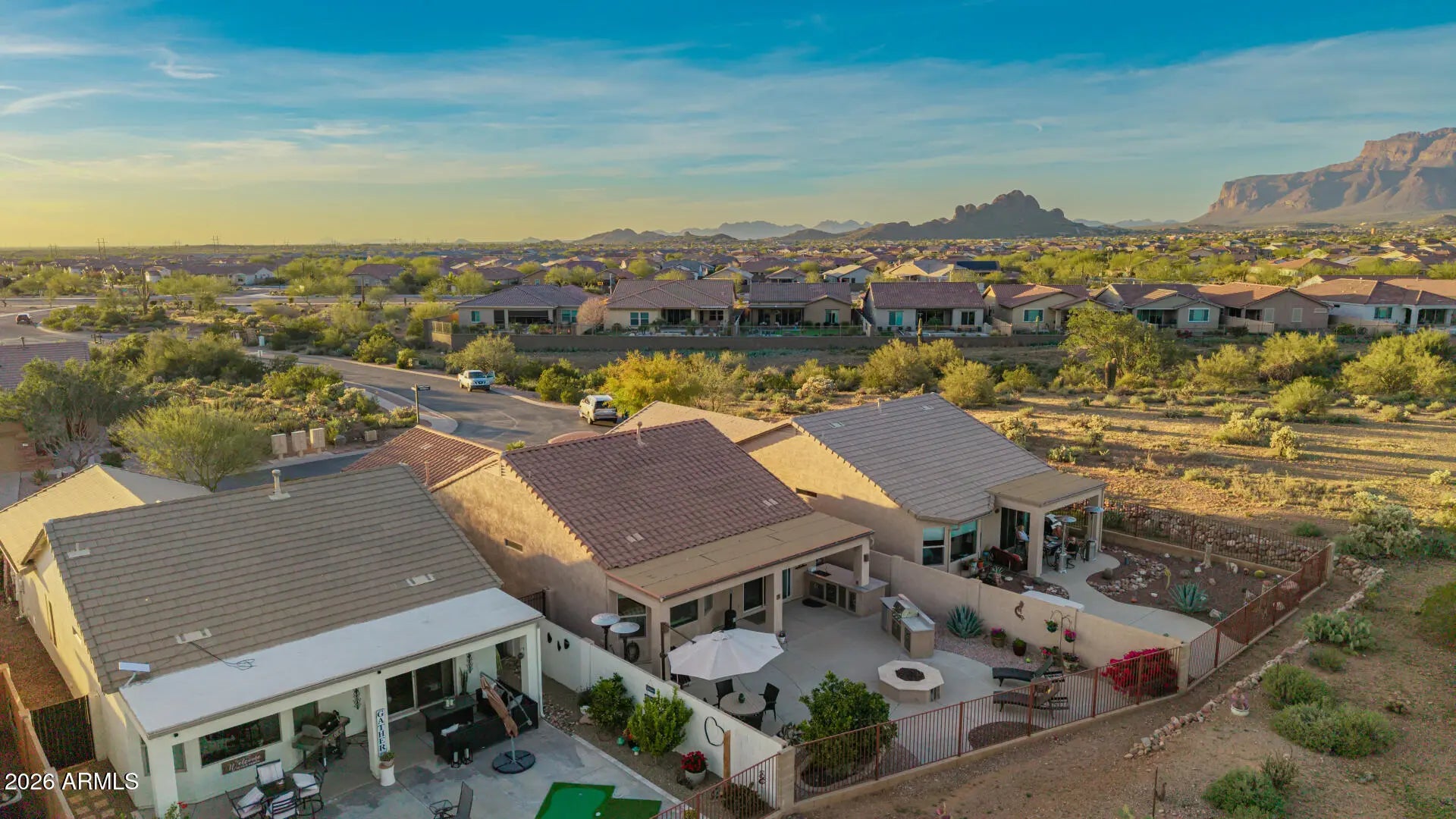 Amazing 2 bedroom, 2 bathroom home with unobstructed views of the breathtaking Superstition Mountains. Located in the desirable gated Peralta Trails community, this ranch-style home features wood-look laminate flooring and tile throughout. The upgraded kitchen offers a stainless steel appliance package with gas range, farmhouse sink, pantry, and recessed lighting, all opening seamlessly to the great room, perfect for entertaining. The spacious primary suite includes a walk-in shower and a large walk-in closet with built-in shelving. Step outside to a backyard designed to impress, where the mountain views are truly unmatched and best enjoyed from the covered patio. The outdoor space is fully equipped with a built-in barbecue grill, beverage cooler, sink, additional island with stainless steel drawers, gas firepit, oversized built-in umbrella, and mature fruit trees and plants all on irrigation. Additional features include inside laundry, water filtration system, built-in desk and cabinetry in both the primary suite and great room, and so much more. The home is available fully furnished with the right offer, making it an ideal turnkey opportunity. This section of the community includes access to the pool, adding to the low-maintenance lifestyle. With its lock-and-leave convenience and incredible mountain views, this home is perfect as a full-time residence or second home. Come tour today.