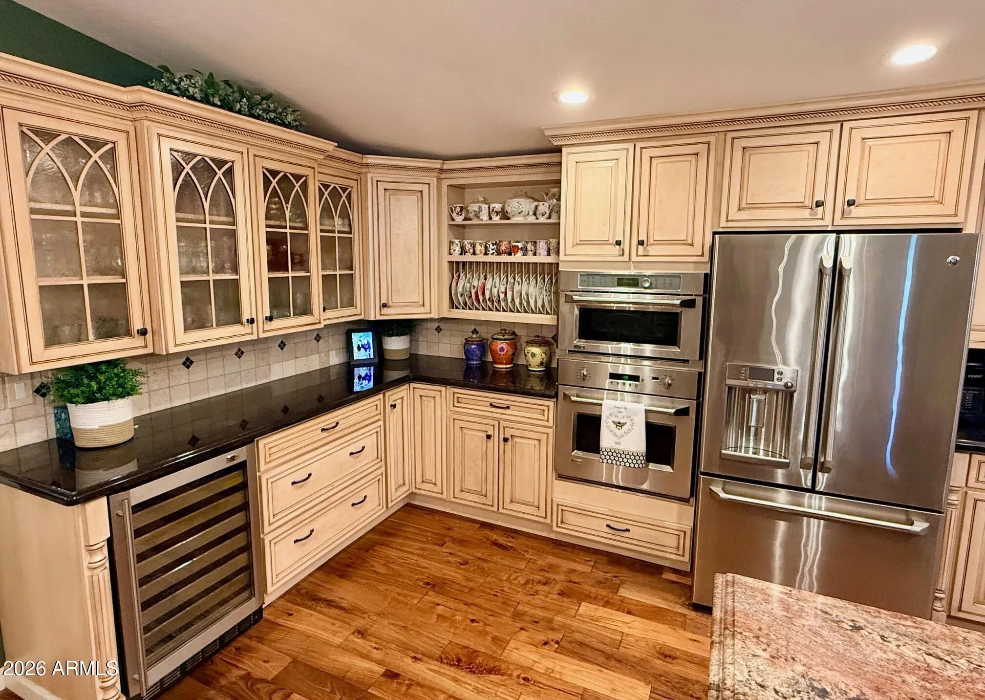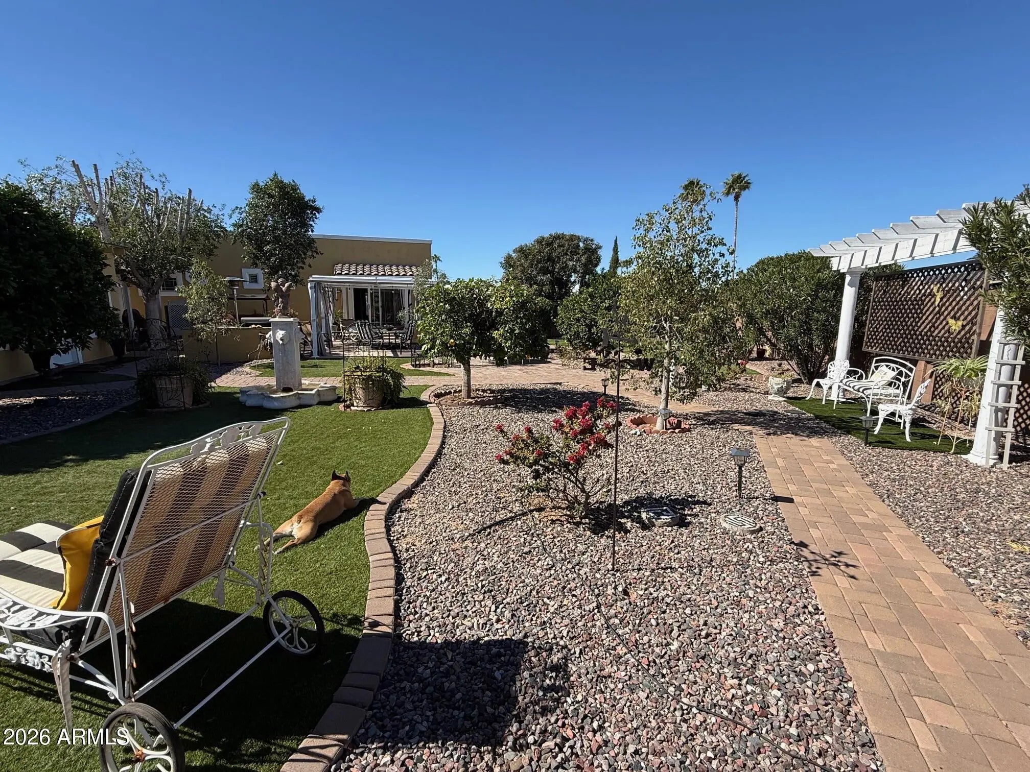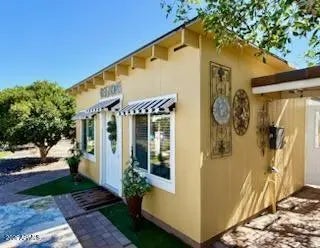 Beautiful Custom home in Apache Wells. This home features a gourmet kitchen with GE Monogram appliances including wine refrigerator, downdraft cooktop in the island. Luxury cabinetry, top of the line granite countertops. Step in through the Cantera metal front door to your living room with tumbled marble floors in a palace pattern. Great room off the kitchen features hand scraped wood floors. New dual pane windows and doors throughout. Both bathrooms extensively remodeled with tile and stone. No stone unturned. Lot is over 16,000 square feet making it the largest homesite in Apache Wells. Backyard features a covered pergola, paver patios and paths, an air conditioned and heated 'She Shed' with an attached workshop. Wood burning fireplace for cool winter evenings.