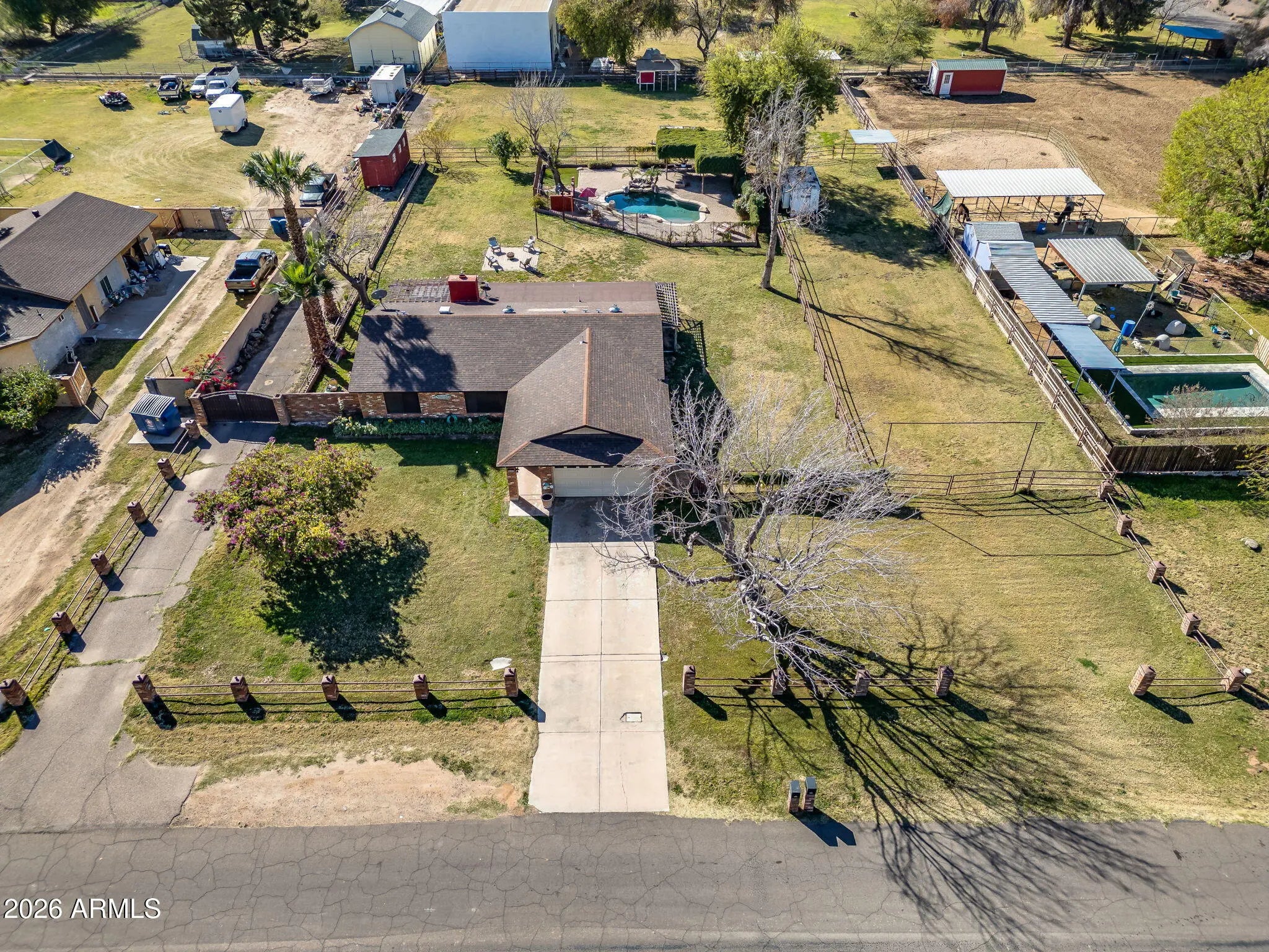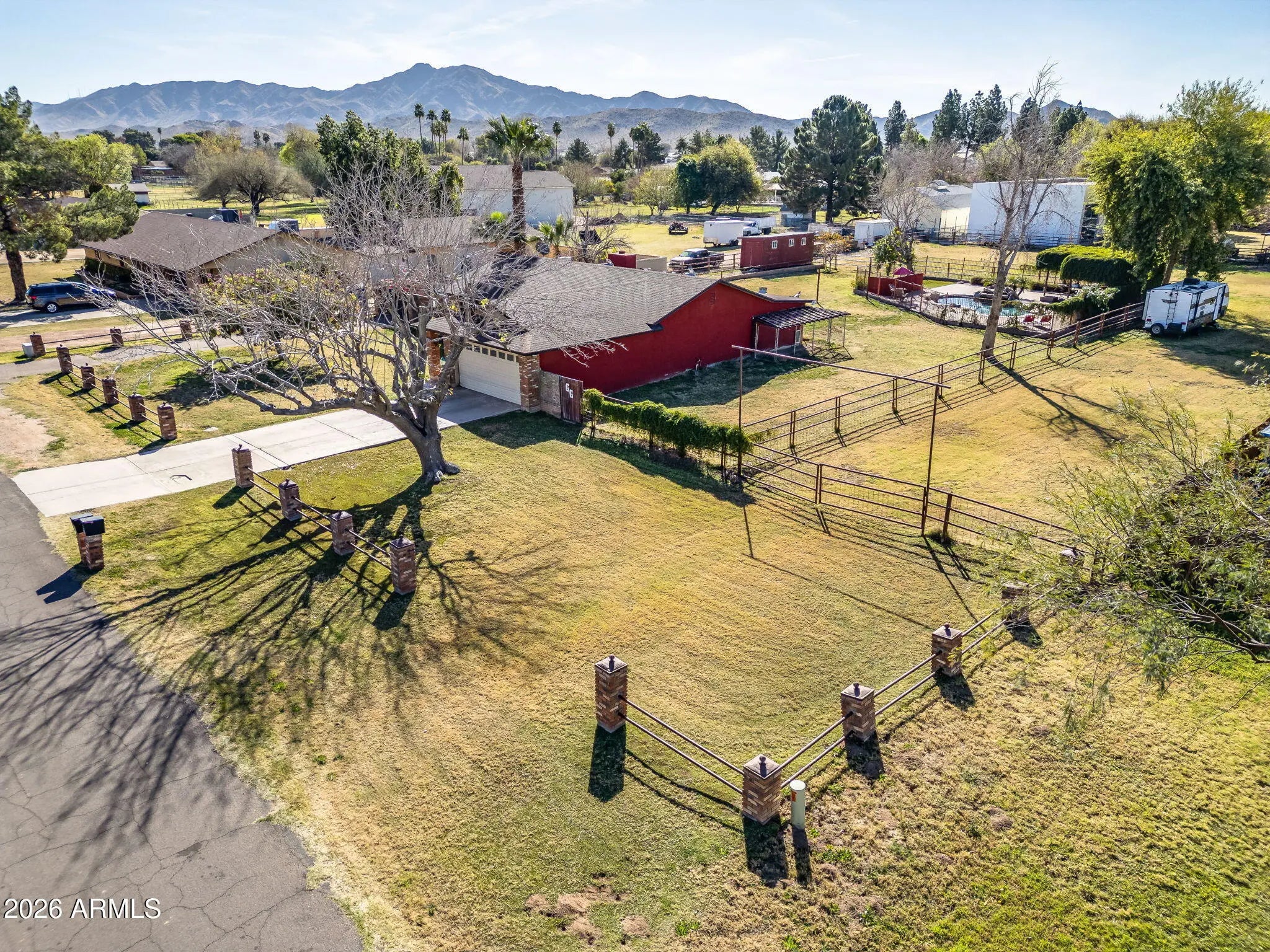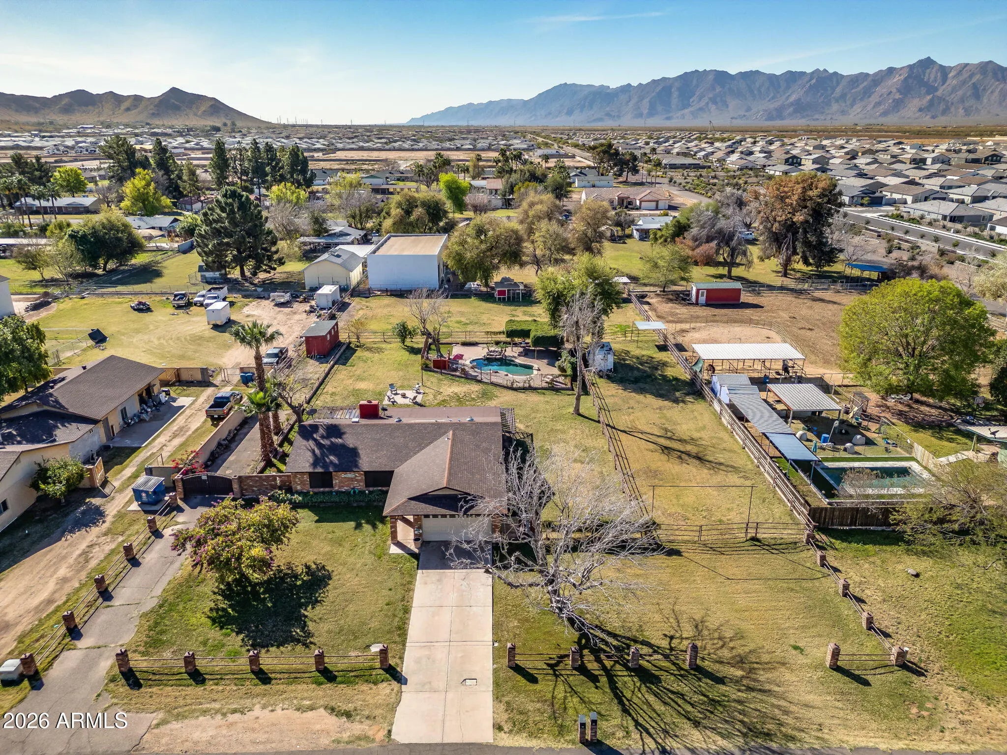 Welcome to country living on an acre-plus irrigated horse property! Enjoy open space, and mountain views, while being close to the city and other parts of the valley! Farm style home featuring brick detail inside and out. Kitchen, remodeled in 2020, features Hickory Cabinets, Granite Counters, and SS Appliances. Screened in Back Patio extends living area. Additional outdoor spaces include Arbor covered Patio area with Built-in Grill and Spa; Open Paver Patio with Firepit; and Large fenced Pool with extensive paver Patio and vine covered Ramada and Patio area. The large lot features two areas accessible and suitable for RV or other parking, Corral area, 4 Horse Stalls (with water), and large shed. Bonus/Exercise Room/Office (not incl in sf) is comfortable with portable AC and features dog door to fenced dog run on the side of the home. Great open floor plan and lot provides lots of flexibility to customize. Minutes from loop 202 Freeway, shopping, and dining. Enjoy the solitude and comfort of rural life with city conveniences close by. Come see this wonderful home!
