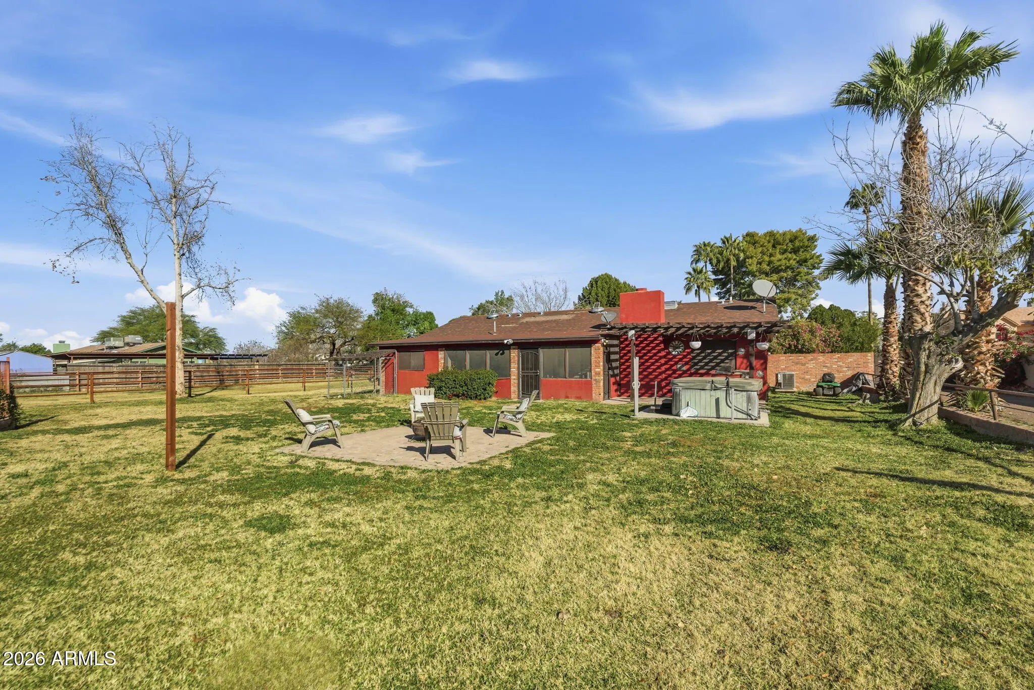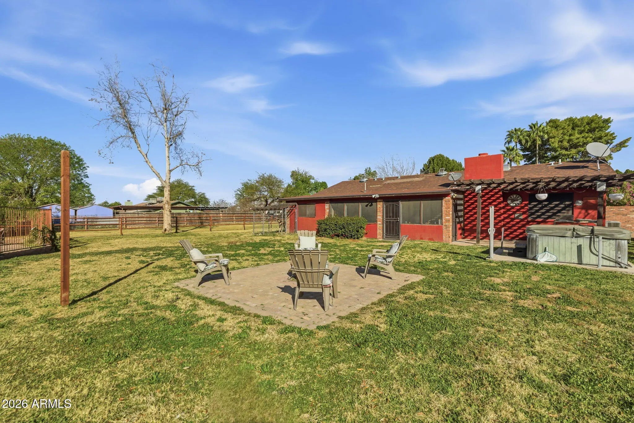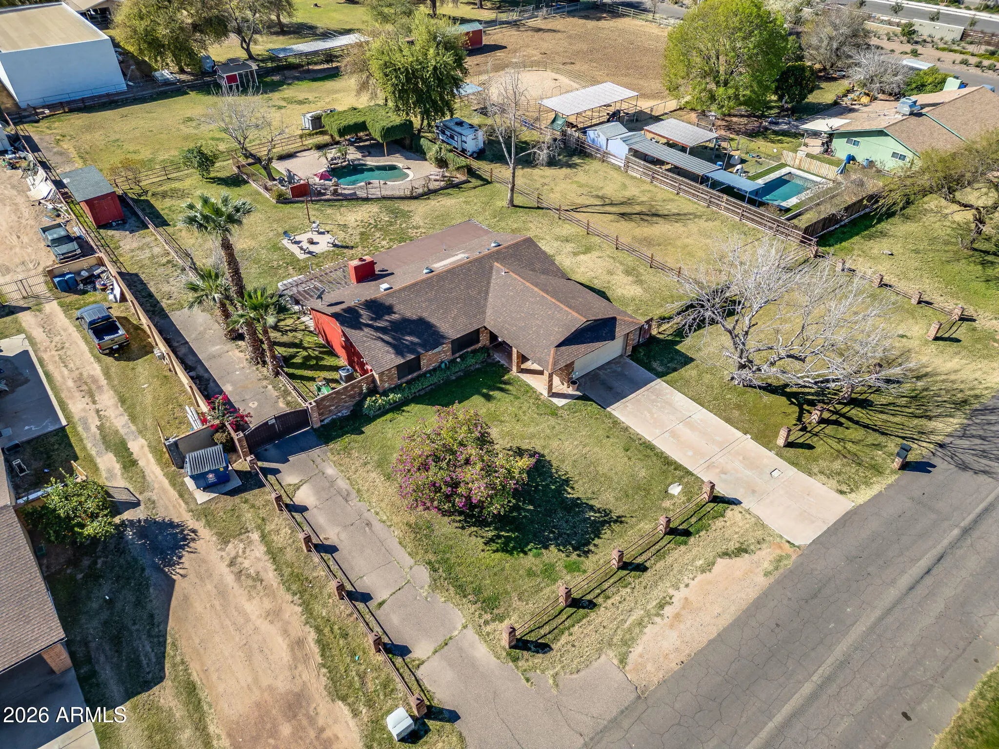 Welcome to country living on an acre-plus irrigated horse property! Enjoy open space, and mountain views, while being close to the city and other parts of the valley! Farm style home featuring brick detail inside and out. Kitchen, remodeled in 2020, features Hickory Cabinets, Granite Counters, and SS Appliances. Screened in Back Patio extends living area. Additional outdoor spaces include Arbor covered Patio area with Built-in Grill and Spa; Open Paver Patio with Firepit; and Large fenced Pool with extensive paver Patio and vine covered Ramada and Patio area. The large lot features two areas accessible and suitable for RV or other parking, Corral area, 4 Horse Stalls (with water), and large shed. Bonus/Exercise Room/Office (not incl in sf) is comfortable with portable AC and features dog door to fenced dog run on the side of the home. Great open floor plan and lot provides lots of flexibility to customize. Minutes from loop 202 Freeway, shopping, and dining. Enjoy the solitude and comfort of rural life with city conveniences close by. Come see this wonderful home!