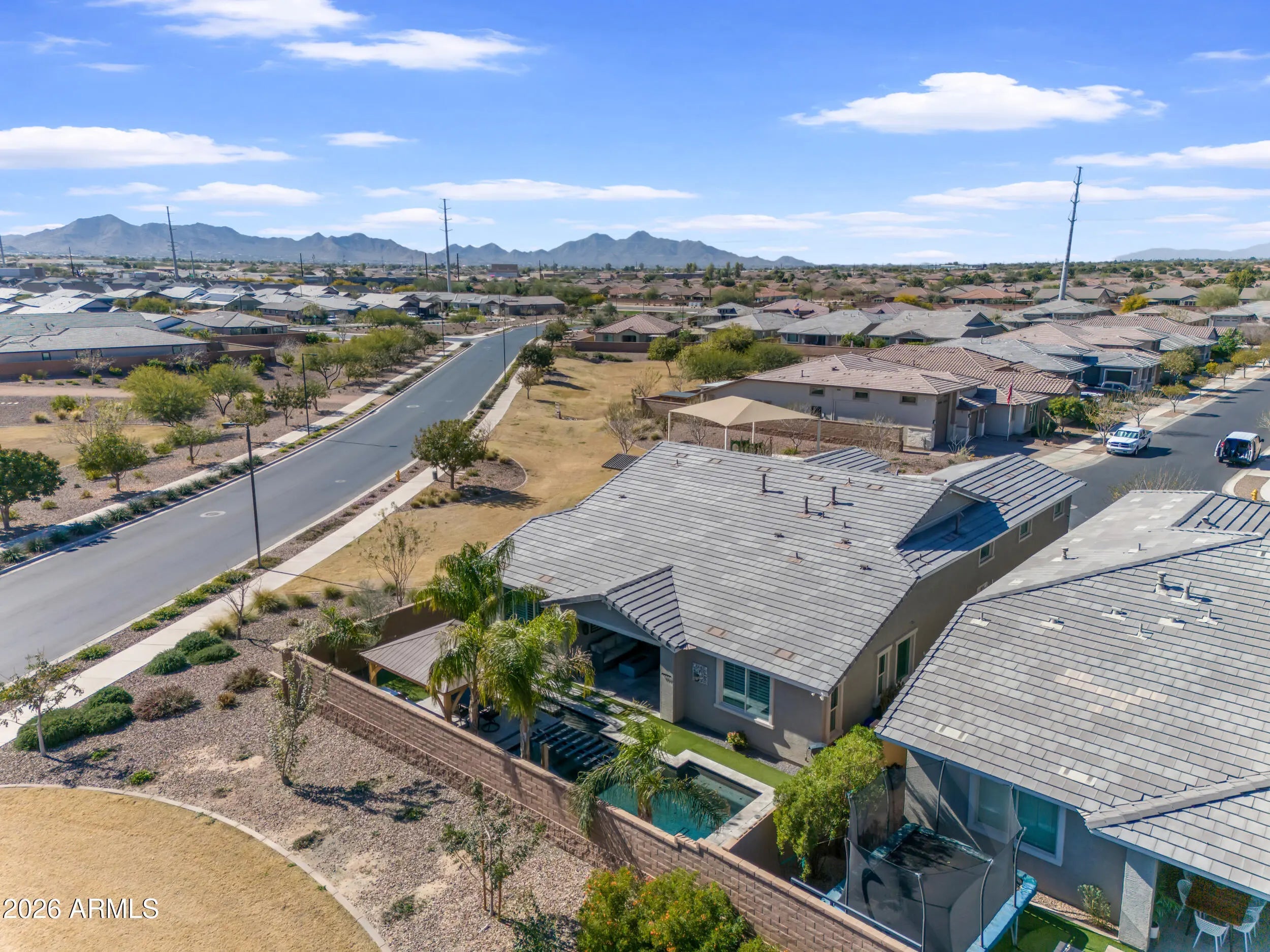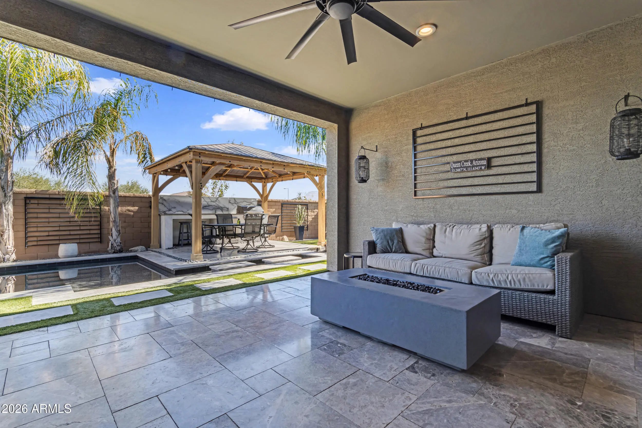 Welcome to Queen Creek living at its finest. Situated on a private corner lot with only one neighbor and no homes behind, this beautifully upgraded 3 bedroom, 2.5 bath home with a den offers 2,423 sq ft of thoughtfully designed space and over $100,000 in upgrades. Inside you'll find custom flooring throughout with no carpet, a designer kitchen featuring quartz countertops, dual ovens, gas cooktop, under cabinet lighting, and a custom walk in pantry with microwave. The split layout places the secondary bedrooms and shared bath with dual sinks at the front of the home, while the spacious primary suite enjoys direct backyard access, a spa style bath with soaking tub and walk in shower, and a custom closet complete with built ins and dressers. The backyard is built for Arizona living with a heated pool, outdoor kitchen, gazebo, misters, and a built in fire pit creating the perfect setting for relaxing or entertaining. Car and toy enthusiasts will appreciate the insulated, air conditioned RV garage with epoxy floors and 220V outlet. Located in the highly sought after Spur Cross community, residents enjoy a community pool, parks, playgrounds, and miles of walking and biking trails, all just minutes from shopping, dining, and convenient access to the State Route 24.