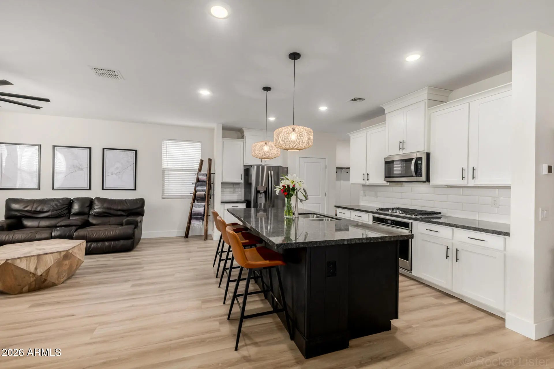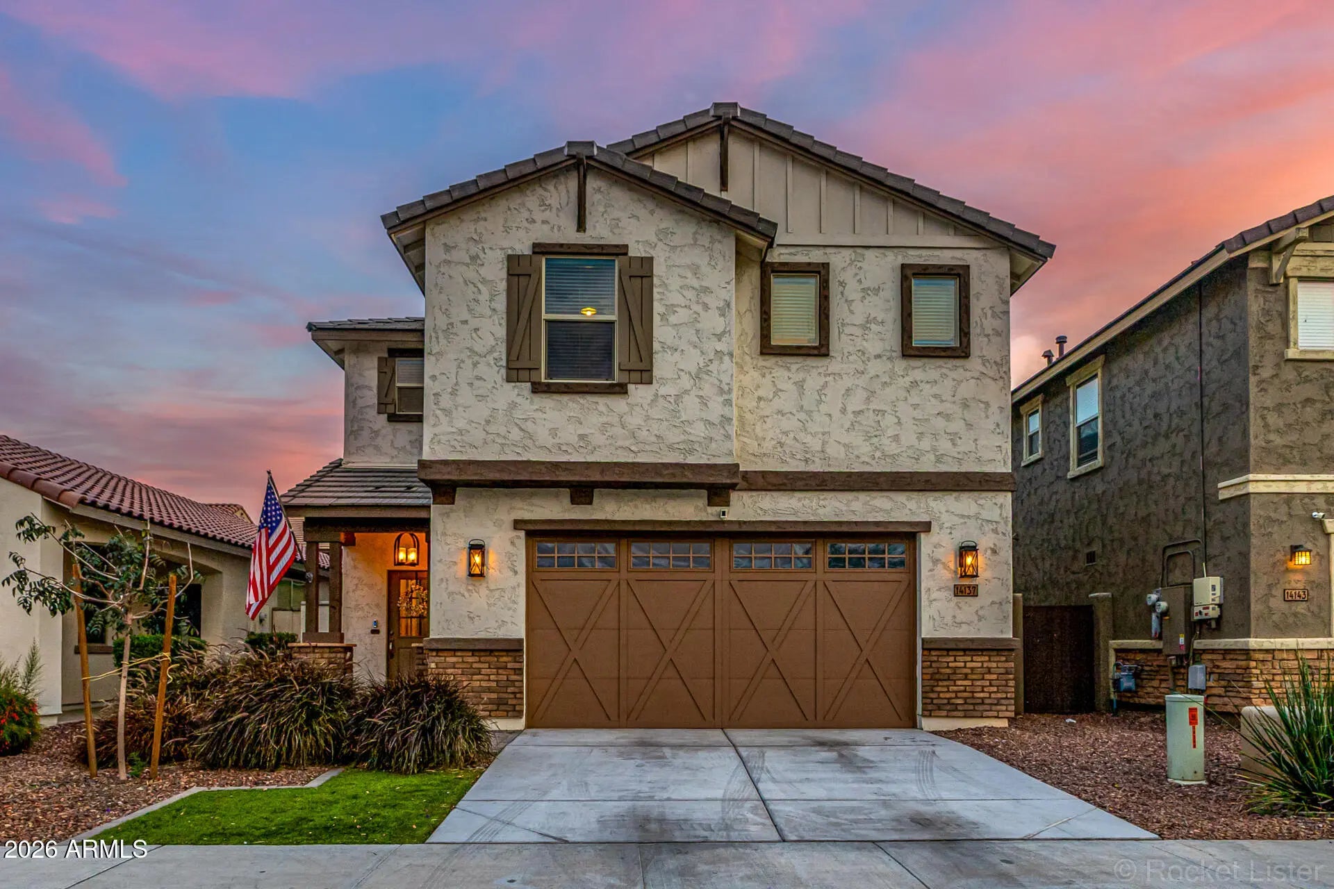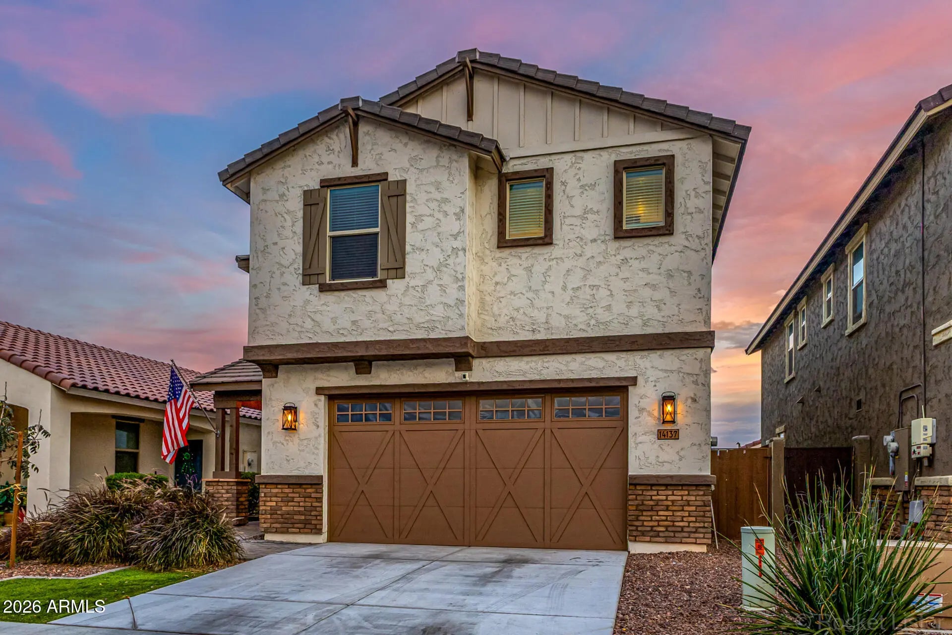 Welcome to this beautifully upgraded two-story Craftsman-inspired home in the highly sought-after Homestead at Marley Park community, built in 2020 and thoughtfully designed for modern living. This spacious four-bedroom home with a large upstairs loft offers a bright, open-concept layout filled with stylish custom touches throughout. The stunning chef's kitchen serves as the heart of the home, featuring a huge center island with custom pendant lighting, white cabinetry, granite countertops, white subway tile backsplash, stainless steel appliances, built-in wall oven, separate gas cooktop, and a generous walk-in pantry. Trendy wide-plank light greige wood-look flooring flows through the main living areas, complemented by upgraded ceiling fans and striking custom accent walls that add warmth, texture, and architectural interest. A standout design feature in the main living space is the modern vertical wood slat accent wall, creating a sophisticated custom feel rarely found at this price point. Secondary bedrooms showcase board and batten accent walls with stylish two-tone paint, adding character and visual interest. Upstairs, the expansive loft provides exceptional flexibility for a media room, home office, playroom, or study space. The private primary suite offers a true retreat with a dual sink vanity, oversized walk-in shower, and an impressive walk-in closet with abundant storage. The upstairs secondary bathroom also features a dual sink vanity and custom framed mirrors, while upgraded ceiling fans are installed throughout all bedrooms. Function meets thoughtful design with an upstairs laundry room and a custom built hall tree near the garage entry featuring bench seating, storage drawers, shelving, and hooks for everyday organization. The downstairs powder room is beautifully upgraded with a custom vanity, sink, faucet, and mirror for an elevated guest experience. Step outside to enjoy a paver patio with a custom outdoor ceiling fan, ideal for relaxing or entertaining. The low-maintenance backyard is finished in decorative rock, offering a clean, versatile space ready for your personal landscaping vision. The home's Craftsman-inspired exterior creates standout curb appeal, featuring charming front gables with decorative trim, board and batten detail, a covered front porch with column accents, mixed stucco and brick finishes, wood-look shutters, and a carriage-style garage door that adds warmth and character. Residents of Homestead at Marley Park enjoy resort-style amenities, including a lap pool with beach entry and interactive water features, multiple playgrounds, gathering areas with outdoor fireplaces and fire pits, picnic and grilling spaces, community garden plots, basketball court, horseshoe pits, cornhole, and a fully equipped fitness center. This move-in ready home blends modern design, thoughtful upgrades, and exceptional community living in one of Surprise's most desirable neighborhoods.