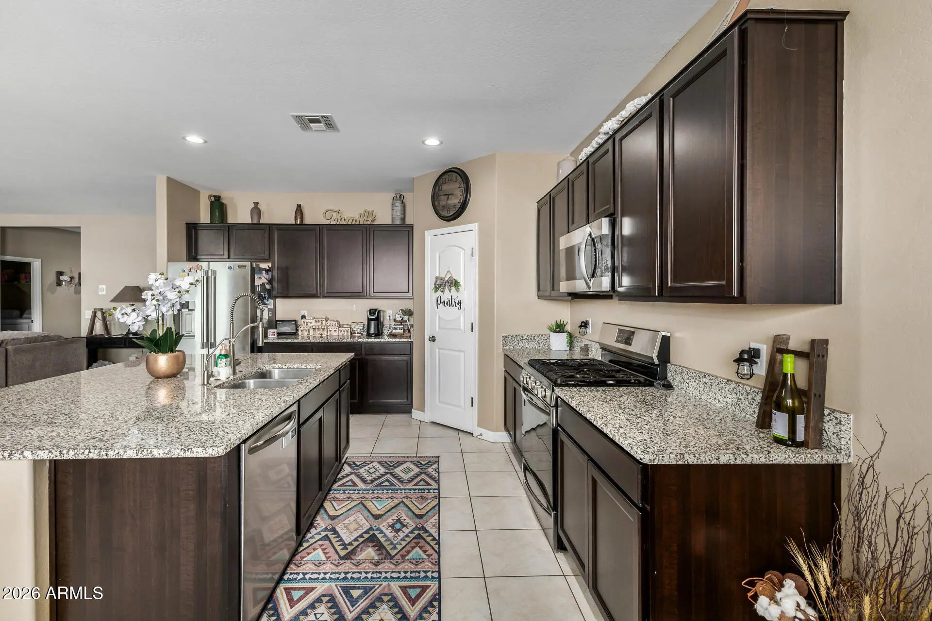 Beautiful 4-bedroom, 2-bath home with a desirable split floor plan and stylish upgrades throughout. The open-concept kitchen features stainless steel appliances, gas cooking, rich espresso cabinets, and an oversized island with breakfast bar--perfect for gathering and entertaining. The kitchen flows seamlessly into the living area for easy everyday living. Enjoy a low-maintenance backyard backing to the desert with stunning mountain views. Located in an amenity-rich neighborhood with parks, splash pads, sport courts, walking paths, in-neighborhood schools, and nightly food trucks just steps away.