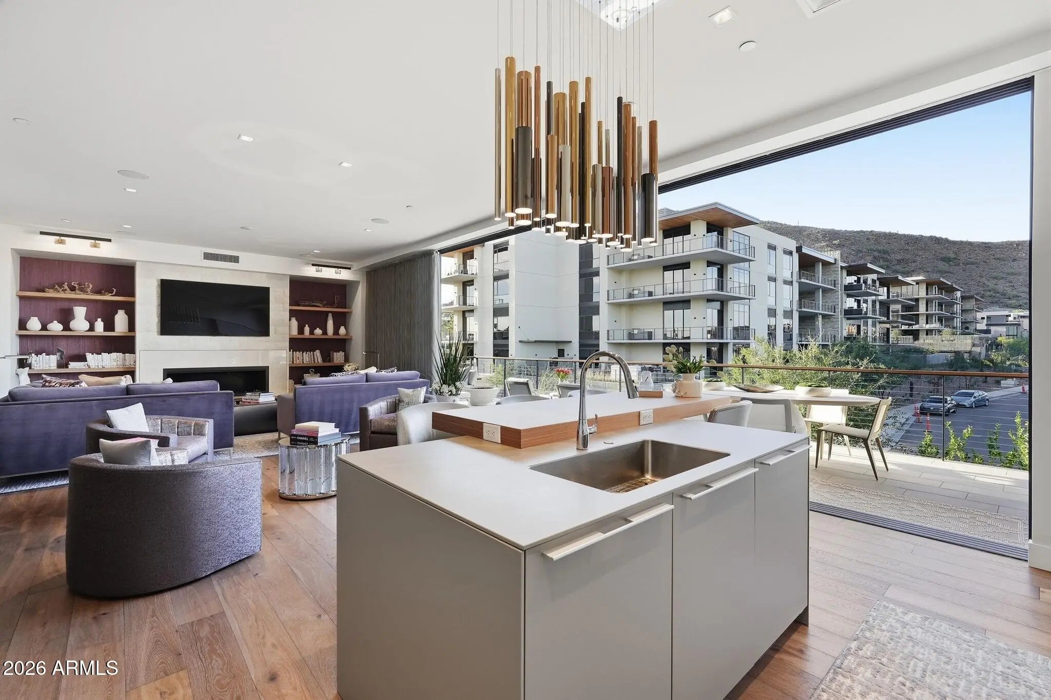 At the base of iconic Camelback Mountain, within the prestigious Ascent at The Phoenician, this private Golf Villa offers a rare blend of refined luxury and serene desert beauty. Adjacent to one of Arizona's most celebrated resort destinations, the community feels both exclusive and deeply connected to the surrounding Sonoran Desert landscape. As you arrive, the experience begins quietly and elegantly. Enter through the front door or directly from the garage into a welcoming entry vestibule, a soft transition space that invites you upward via a private elevator or staircase. Ascending to the main living level, the home immediately opens into light, air, and breathtaking views. To one side, a secluded study offers a peaceful retreat, ideal for focused work or quiet reflection. Just beyond, the dining area unfolds effortlessly into the great room, where your eyes are instantly drawn to Camelback Mountain framed by a fully collapsible wall of sliding glass doors. The great room is anchored by a dramatic floor-to-ceiling fireplace, flanked by floating built-in shelving, creating both warmth and architectural presence. From here, the space flows naturally into the kitchen, a true statement of design and function. Bulthaup cabinetry provides sleek, modern storage solutions, complemented by Sub-Zero and Wolf appliances. The expansive island invites gathering, topped by a stunning light fixture. Step outside onto the covered balcony where sunset light washes over, and Camelback Mountain views stretch across the 9th hole of The Phoenician Golf Course. A built-in BBQ, generous lounge seating, and dining space create an outdoor living room designed for both intimate evenings and lively entertaining. Throughout the home, thoughtful details continue to unfold. The powder bath makes a bold impression with richly textured designer wallpaper. The laundry room is both beautiful and practical, offering abundant storage, expansive counter space, and a convenient utility sink. Each guest suite is its own private respite, complete with an en-suite bath, stylish finishes, warm wood tones, and beautiful natural light. The primary suite feels like a sanctuary above it all, bright, airy, and serene, with mountain views that greet you each morning. A spacious walk-in closet offers exceptional storage, while the spa-inspired primary bath features a freestanding soaking tub, an expansive glass shower, and a floating dual vanity, all wrapped in warm textures and sophisticated finishes. Provenza wood flooring and soaring 10-foot ceilings run throughout the home, enhancing the sense of openness and continuity. A state-of-the-art Crestron system provides effortless control of lighting, climate, security, motorized shades, and integrated sound, including speakers that extend onto the covered balcony. As a resident of Ascent Golf Villas at The Phoenician, you also enjoy access to the newly opened private clubhouse, featuring a sparkling resort-style pool, fitness center, yoga studio, chef's kitchen, billiards lounge, and curated gathering spaces designed for connection and relaxation. Additionally, residents have the opportunity to access The Phoenician Resort amenities at a preferred, discounted membership rate, further elevating the luxury lifestyle experience. This is more than a home, it is elevated desert living, framed by mountain views and defined by thoughtful elegance.