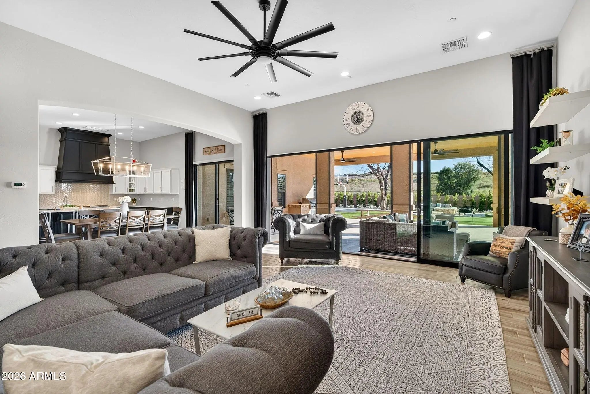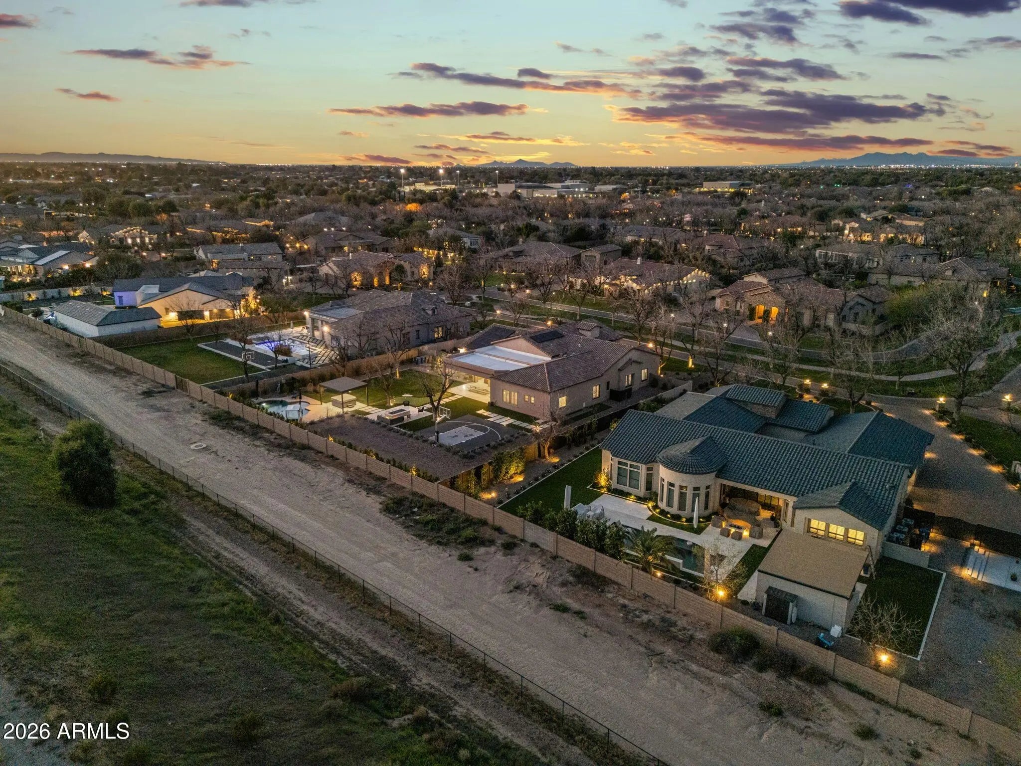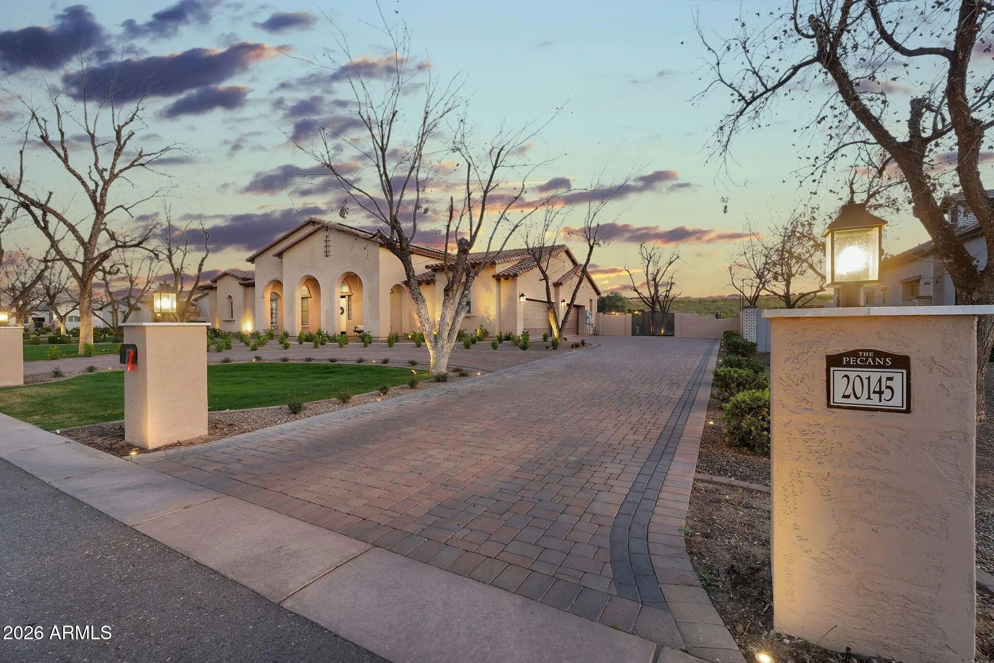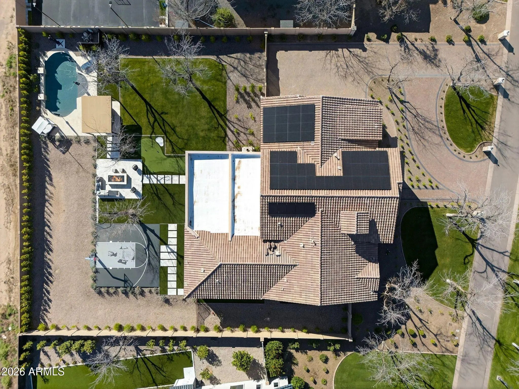 Located within the gated Pecans, one of the East Valley's most exclusive luxury communities, this premium cul-de-sac estate represents refined living at its finest. Surrounded by multimillion-dollar residences and mature tree-lined streets, the setting offers both prestige and privacy while being just moments from Queen Creek's finest dining, boutique shopping, entertainment, golf, and convenient freeway access. This Spanish-inspired residence offers 4 bedrooms, 3.5 baths, and thoughtfully designed flex spaces with seamless indoor-outdoor living. Warm, sophisticated finishes and wood-look tile flooring create a timeless foundation throughout. A private office with French doors, elegant bonus spaces, and an expansive great room anchored by a dramatic wall-to-wall sliding glass door eleva the home's design and functionality. The chef's kitchen is appointed with a six-burner gas cooktop, built-in refrigerator, an oversized island, walk-in pantry, and Butler's pantry, designed for effortless entertaining. The primary suite serves as a private sanctuary featuring a spa-inspired marble bath, soaking tub, and dual-head walk-in shower. Nearly $500,000 was invested into transforming the front and backyard into a private resort setting that rivals luxury retreats. The grounds showcase a sparkling pool with water feature, above-ground spa, full basketball court, manicured turf, built-in barbecue, gas fireplace, and motorized patio shades, creating an extraordinary environment for both intimate evenings and large-scale entertaining. A newer roof underlayment and owned solar enhance long-term value and efficiency, while the four-car garage offers generous space for vehicles and storage. This is a rare opportunity to own in one of Queen Creek's most distinguished gated communities and experience a lifestyle defined by elegance, scale, and convenience.