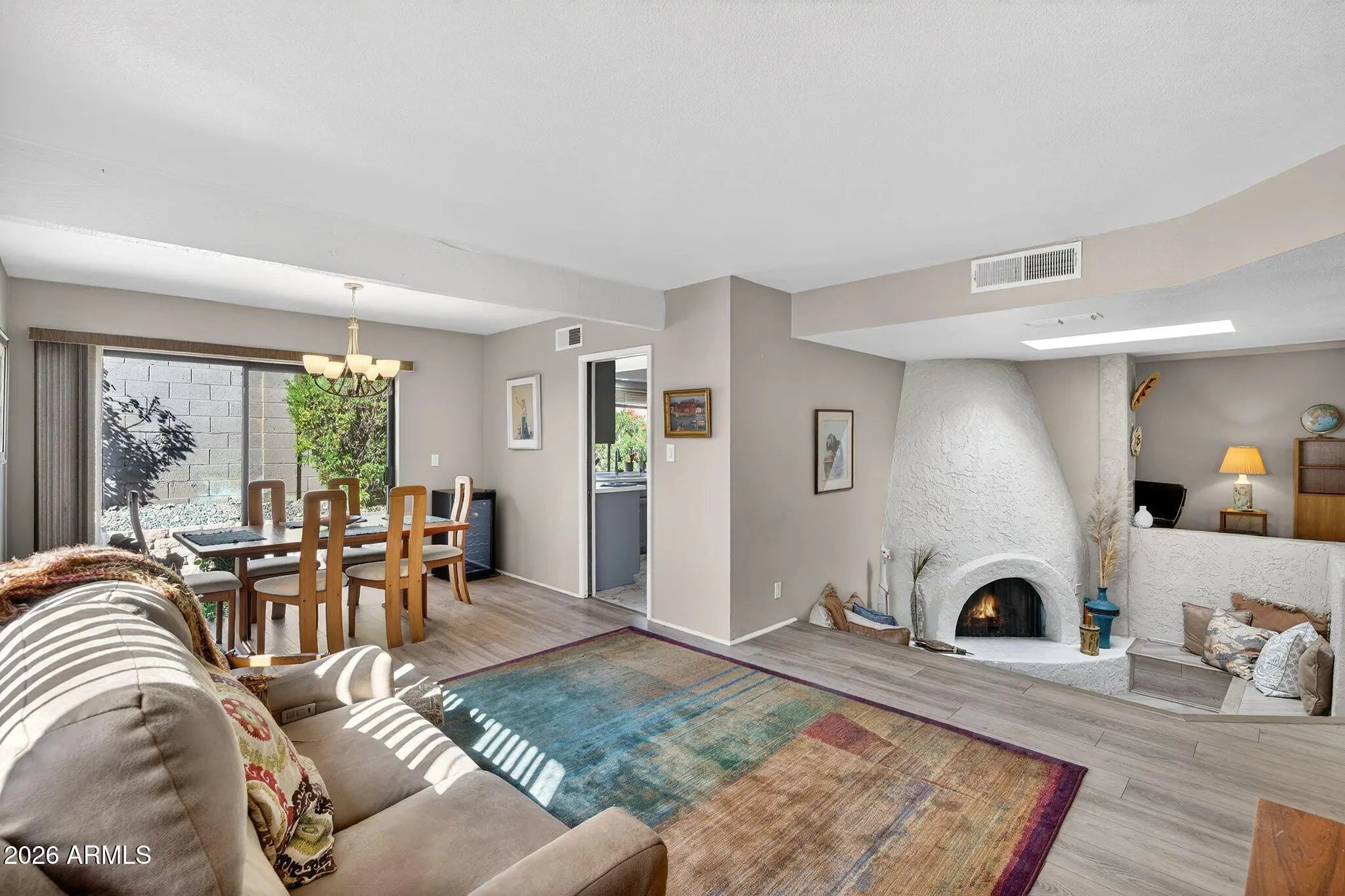 Exceptional value in this beautiful, quiet community with mountain views, community pools, and a private street setting. This 3-bedroom, 2-bath home offers a functional layout with bay windows, consistent wood-look laminate flooring, and quartz countertops in the kitchen. A charming sunken conversation area surrounding the fireplace is accented by a skylight, creating a warm architectural focal point filled with natural light. Recent updates include a new HVAC system (2024) and new water heater (2024). A wonderful opportunity in a highly desirable Pointe Tapatio community.