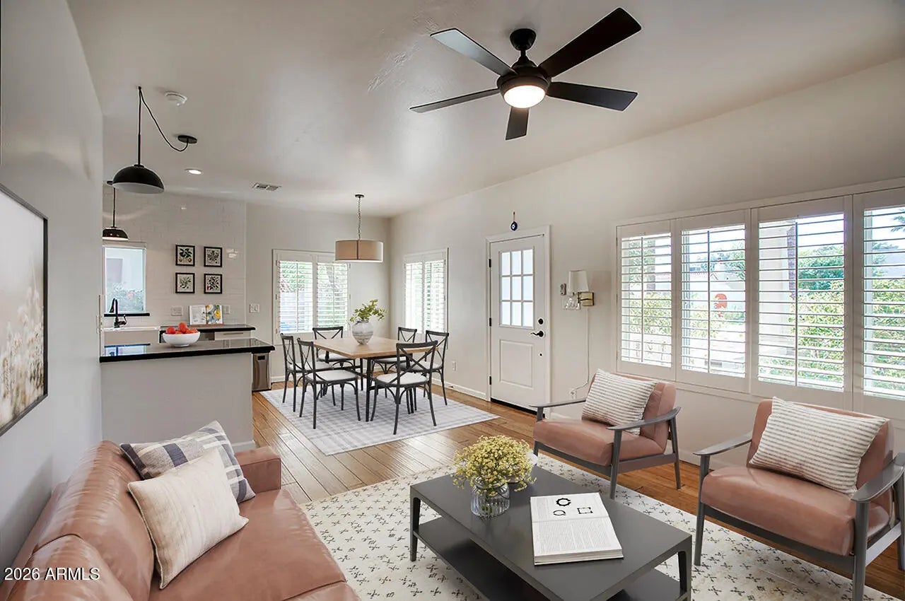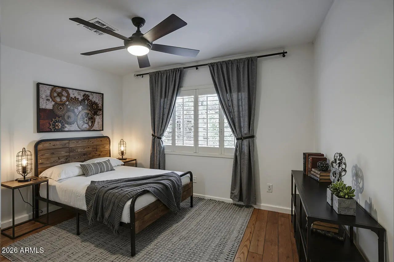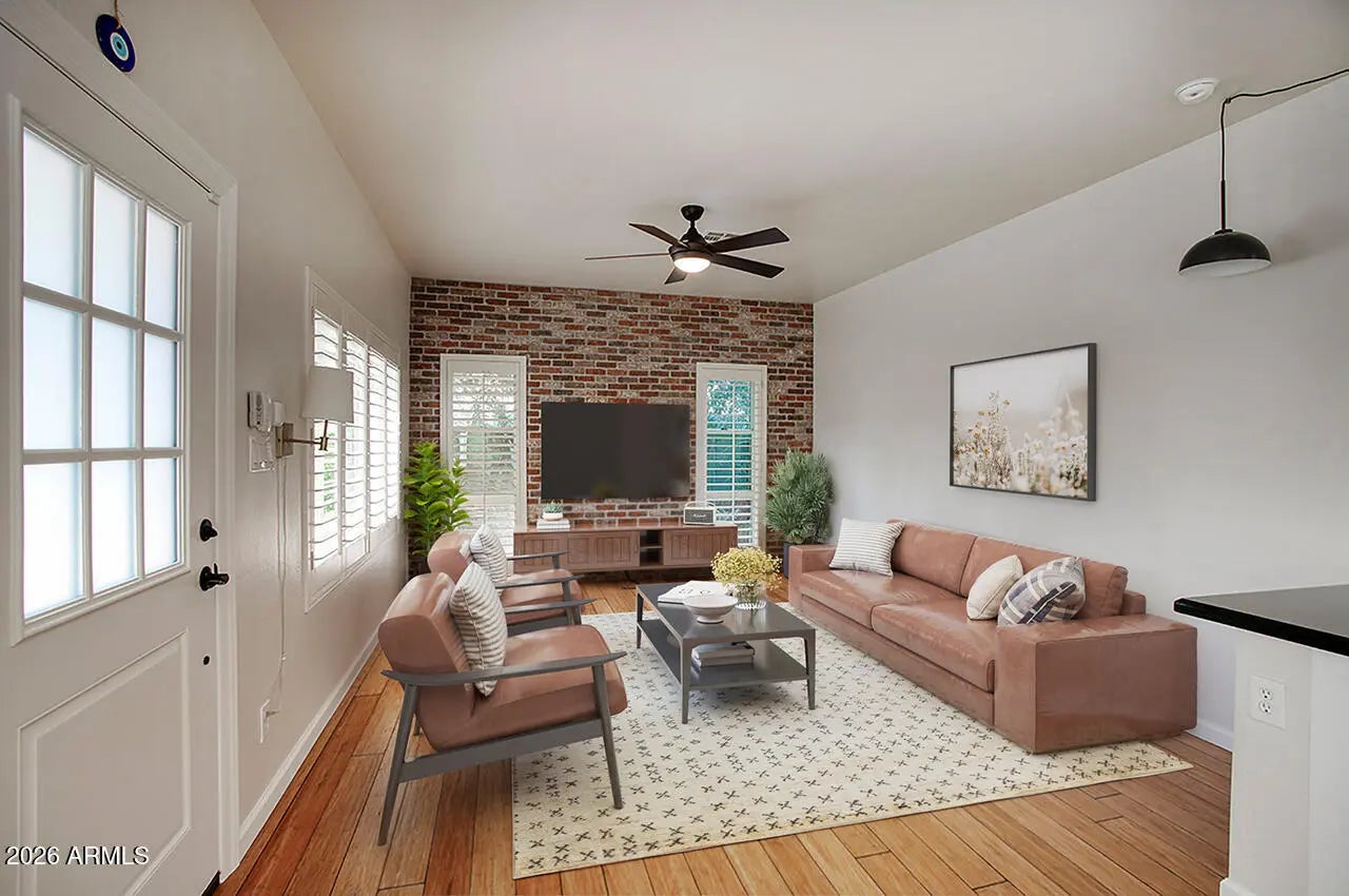 UNICORN ALERT! Tucked on the adorable and quiet street of Cheery Lynn, you will fall in love driving this neighborhood! Quintessential central Phoenix vibes just ooze from this community, perfection! This one is super charming too with brick wall accents, dual pane windows, classic black/white penny tile kitchen flooring large living space with high ceilings, wood shutters t/o, 3 bedrooms, 2 full baths, inside laundry room, this hose just flows beautifully. The primary bedroom has a slider door leading to a great patio, or the side of the house has a great covered patio area. Irrigated lot with mature landscaping, big trees and lots of grass. Detached storage unit too! Fresh paint and squeaky clean! This one is a charmer, run and see why we called this a unicorn!