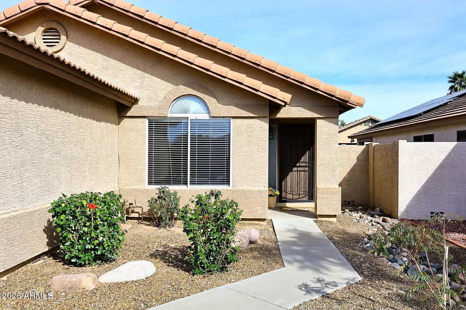 Beautifully maintained home in Peoria's desirable Fletcher Heights. Offering 3 bed/2 baths, plus a versatile office/den. This home is equipped for savings during hot summers with NEW AC 2024 an leased solar panels. Features include open, functional layout, vaulted ceilings, ceiling fans, wood-plank tile flooring, neutral paint, NEW 2025water heater. The upgraded kitchen showcases granite countertops, stainless steel appliances, subway tile backsplash, and white cabinetry. Step outside to a private backyard oasis with a Pebble Tec baja-shelf pool recently emptied, washed, and includes a NEW 2025 pump and filter. Backyard is perfect for year-round Arizona living. Conveniently located minutes from Loop 101 with easy access to Scottsdale, N Phoenix. Close to shopping, dining, and entertain- -ment at Arrowhead Towne Center and the P83 district - all less than 10 min away! Move-in ready and a must-see!