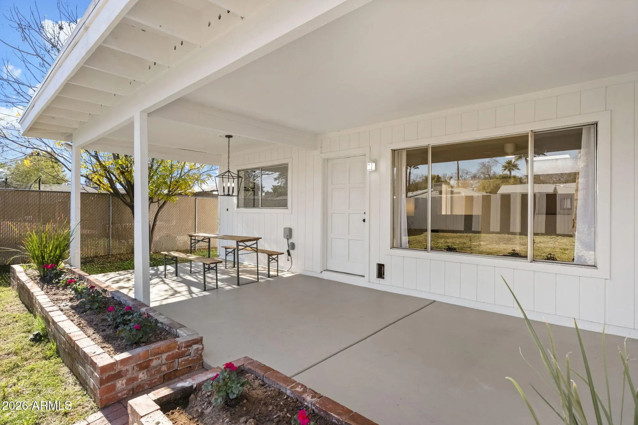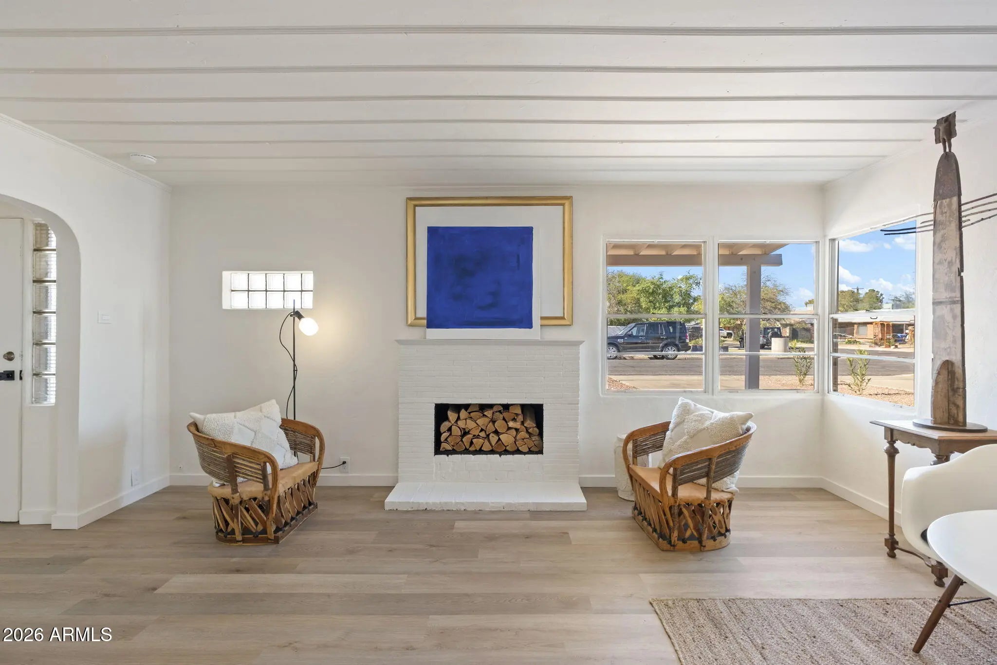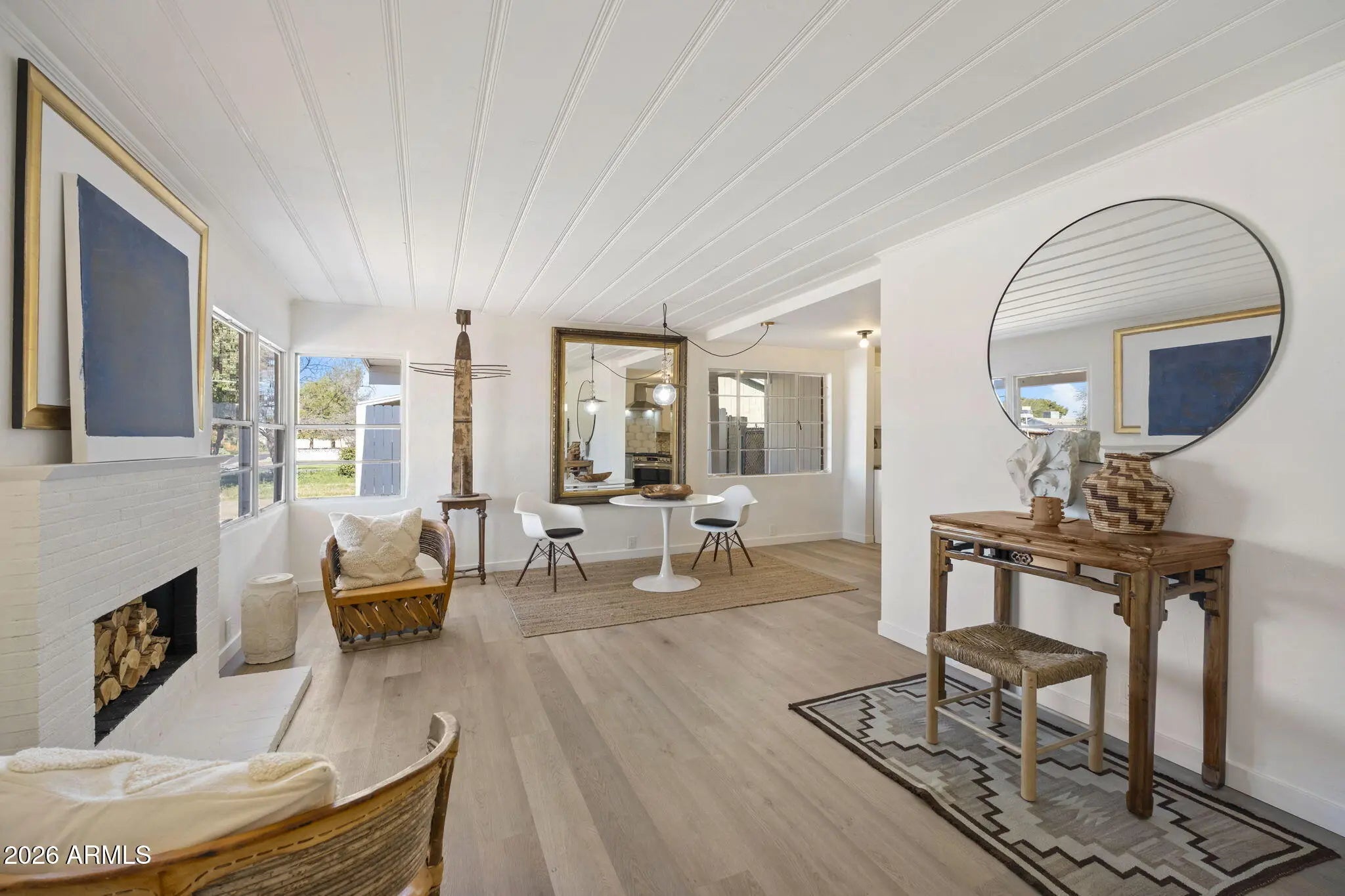 Stunning mid-century red brick home in the Homestead Historic District offering 4 bedrooms and 2,303 sq ft of thoughtfully updated living space. This property blends original architectural charm with a complete designer remodel. Features include corner windows, painted pine ceilings, and a wood-burning fireplace with optional gas connection. The bright and open floor plan provides flexibility for families or multigenerational living. The oversized primary suite includes an ensuite bath and walk-in closet. There is a living room plus a larger family room that offers a wet bar, sky light and direct access to the backyard, creating an ideal setup for entertaining. Two of the bedrooms have walk in closets offering ample storage. The covered patio overlooks a generous yard with ample space for outdoor living, play, or future pool. Major improvements include new HVAC systems in 2022, new roof in 2025 new flooring and interior paint throughout, high-end Kohler sinks, faucets and toilets, and brand-new appliances that convey. Located on a quiet street with convenient access to Biltmore, Arcadia, Scottsdale, Central Phoenix and Sky Harbor Airport. A rare opportunity to own a fully updated home with authentic mid-century character in a prime central location.