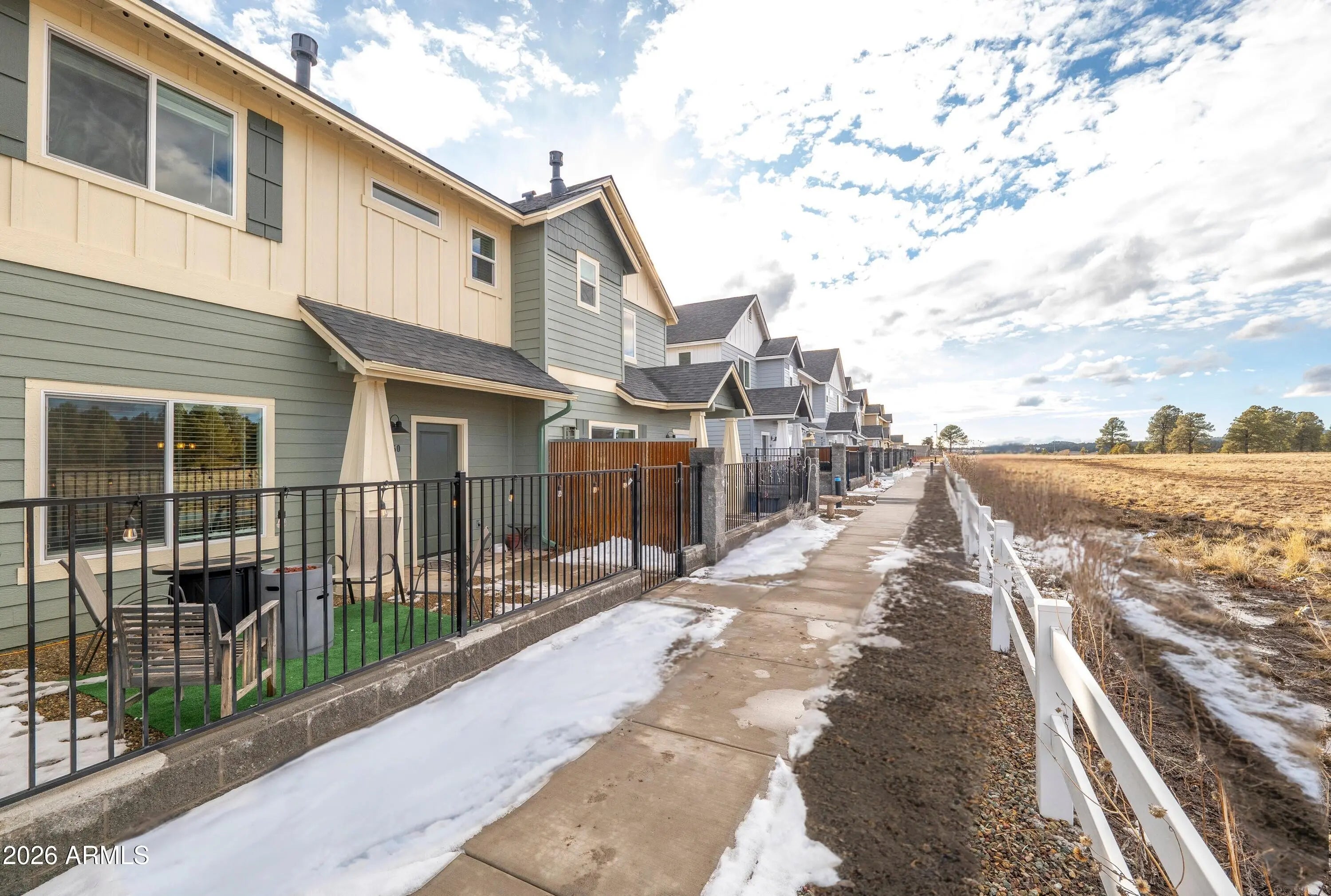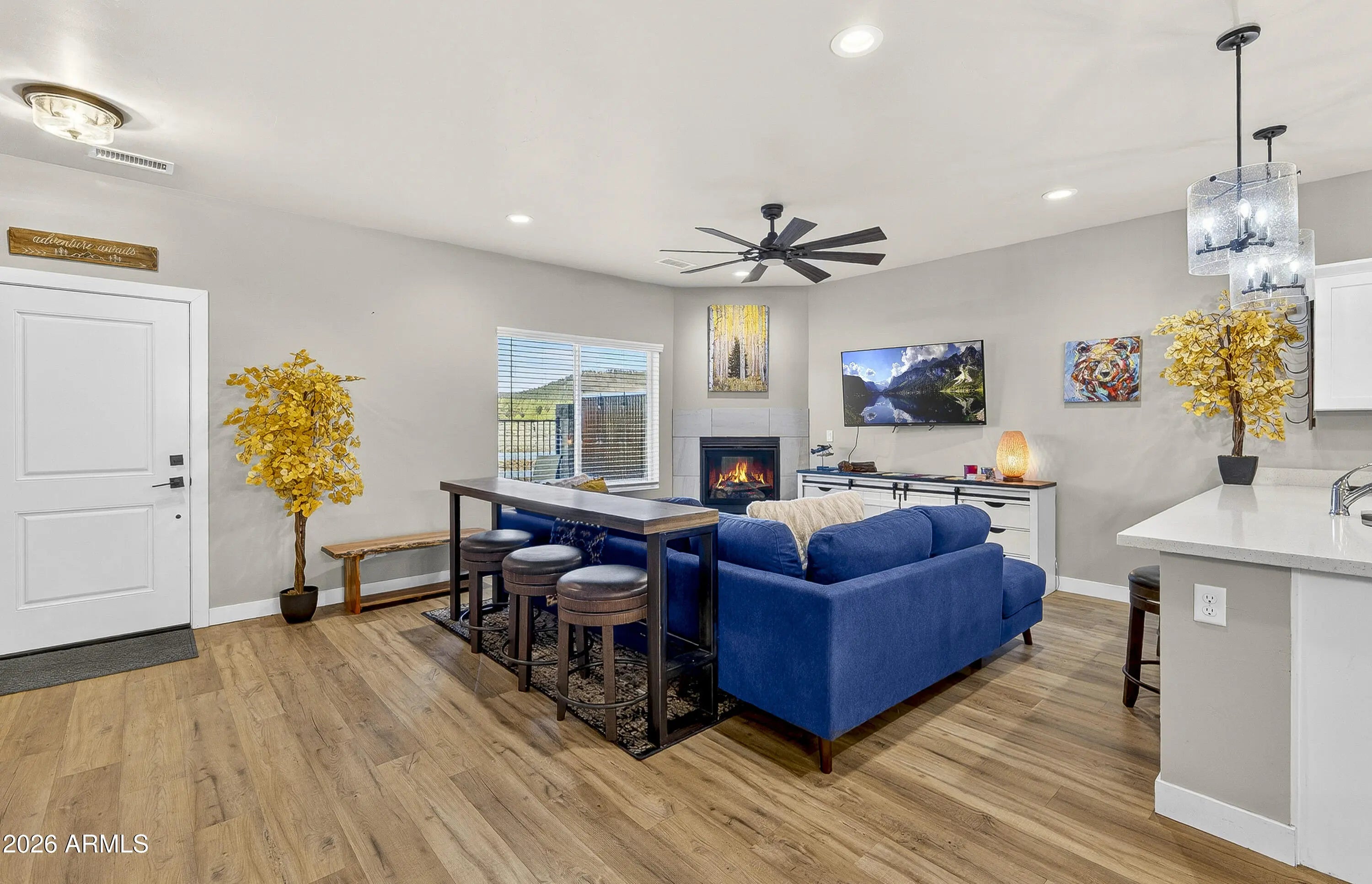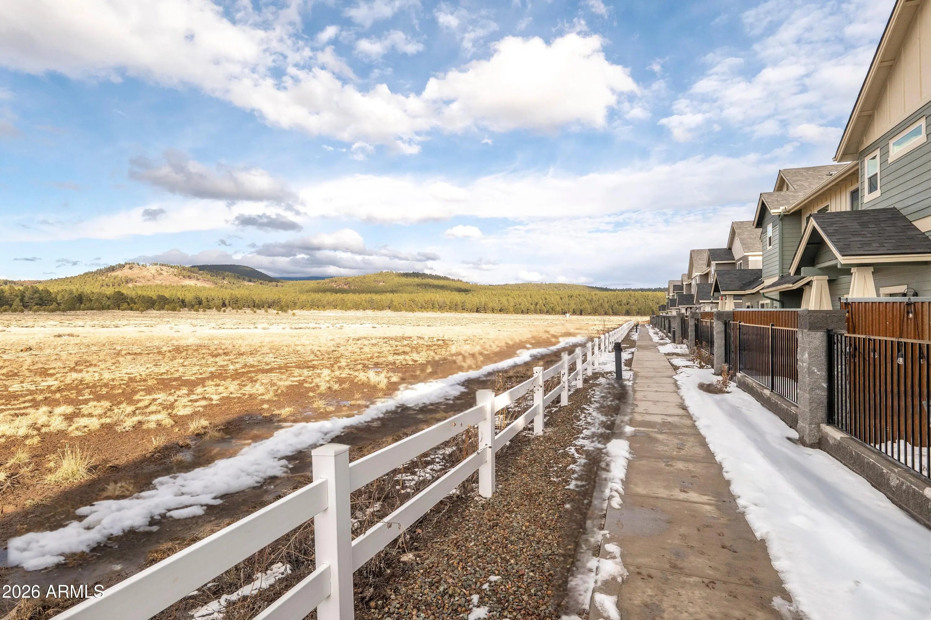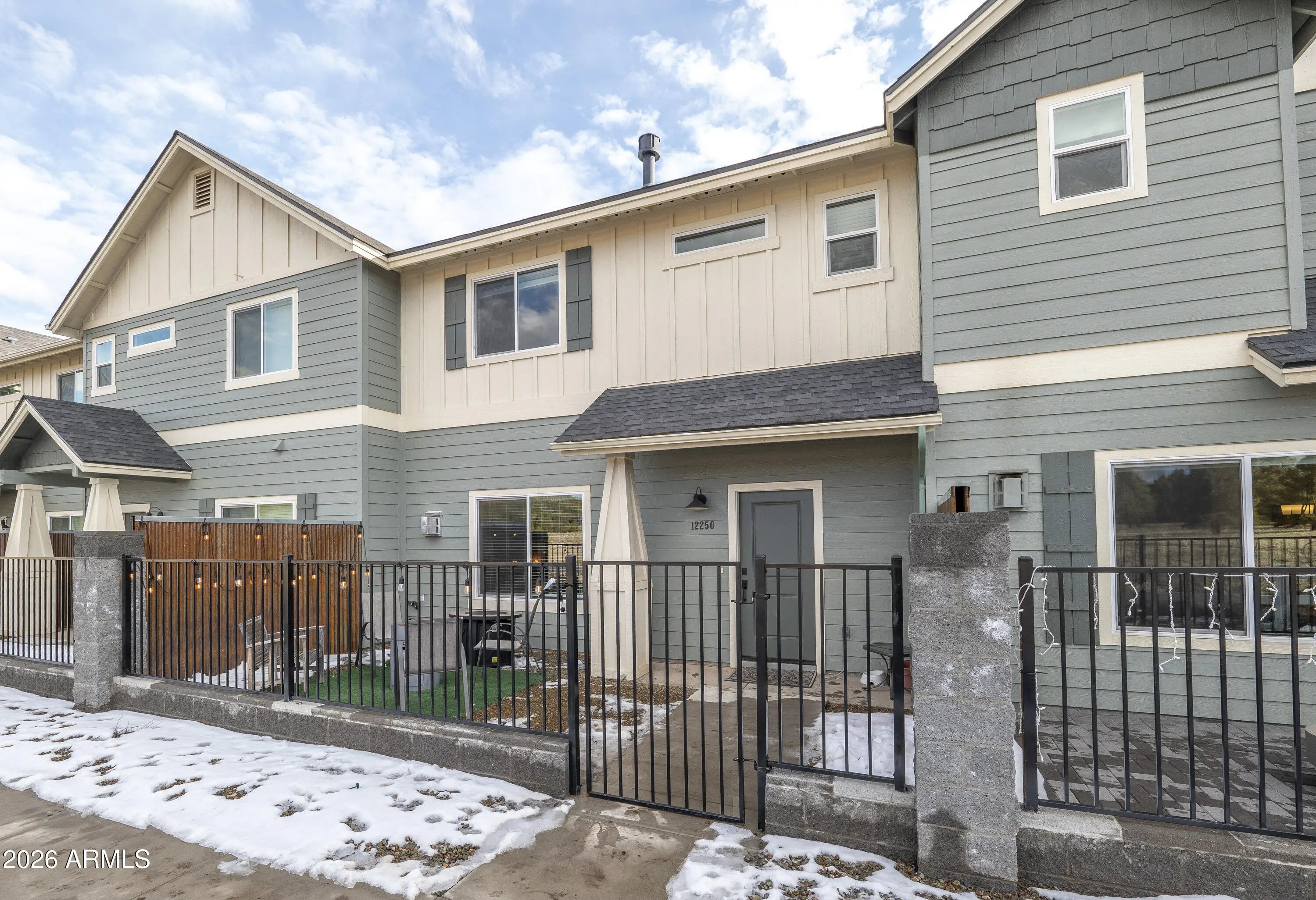 Backing directly to the Coconino National Forest with views of the San Francisco Peaks, this townhome built in 2021 offers privacy, scenery, and everyday comfort. Inside, you'll find thoughtful upgrades throughout, including two fireplaces (living room and primary suite), quartz countertops in the kitchen and bathrooms, stainless steel appliances, shaker-style cabinetry with soft-close drawers and doors, tile surround shower and barn door in primary bathroom. 2x6 construction & spray foam insulation for enhanced energy efficiency and year-round comfort. An oversized two-car garage with epoxy floors, and the gated, fenced front yard adds both function and charm. Community playground, picnic gazebos, pickleball court, and dog park! Move-in-ready forest-backed living with Peak views!