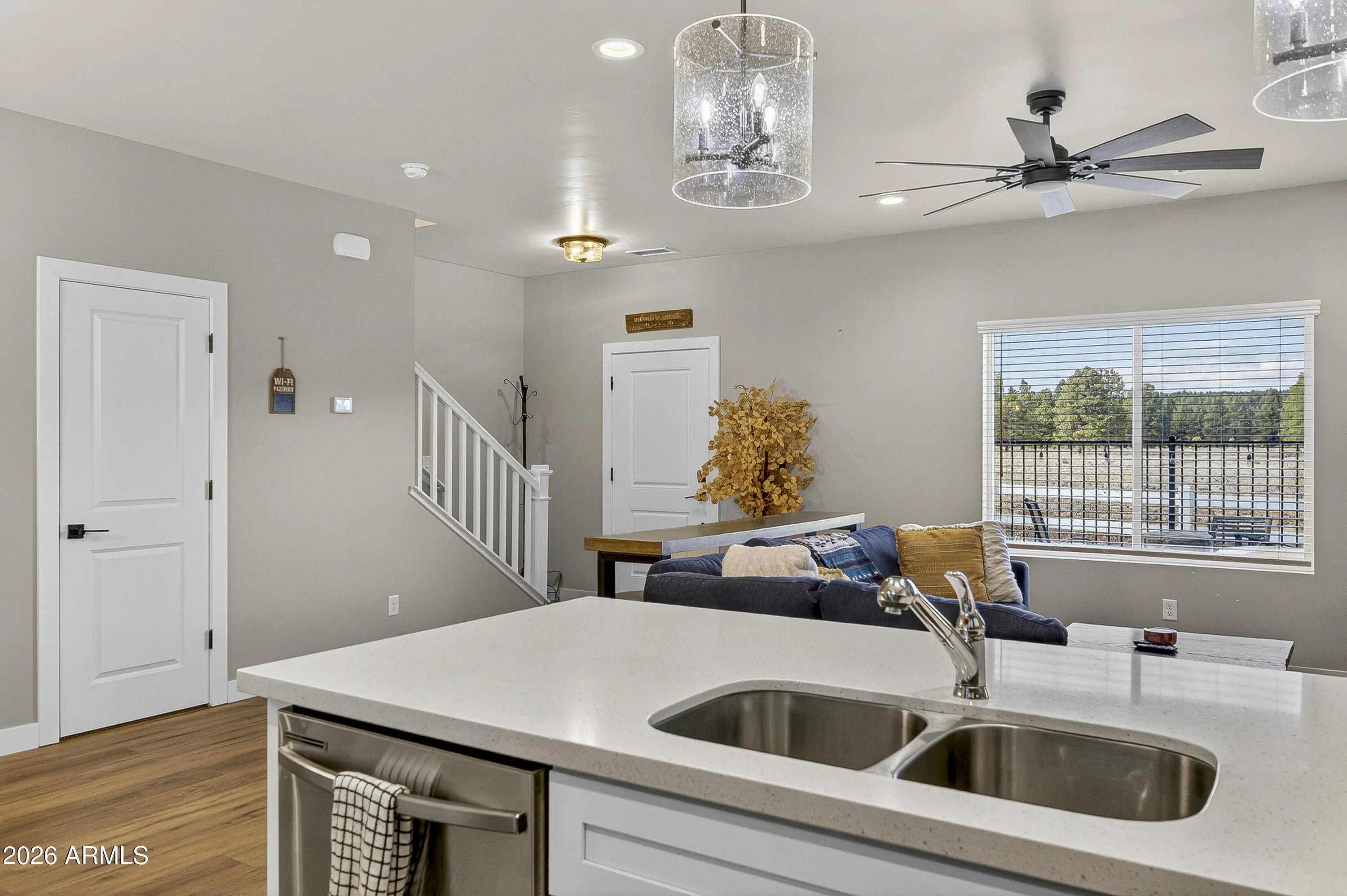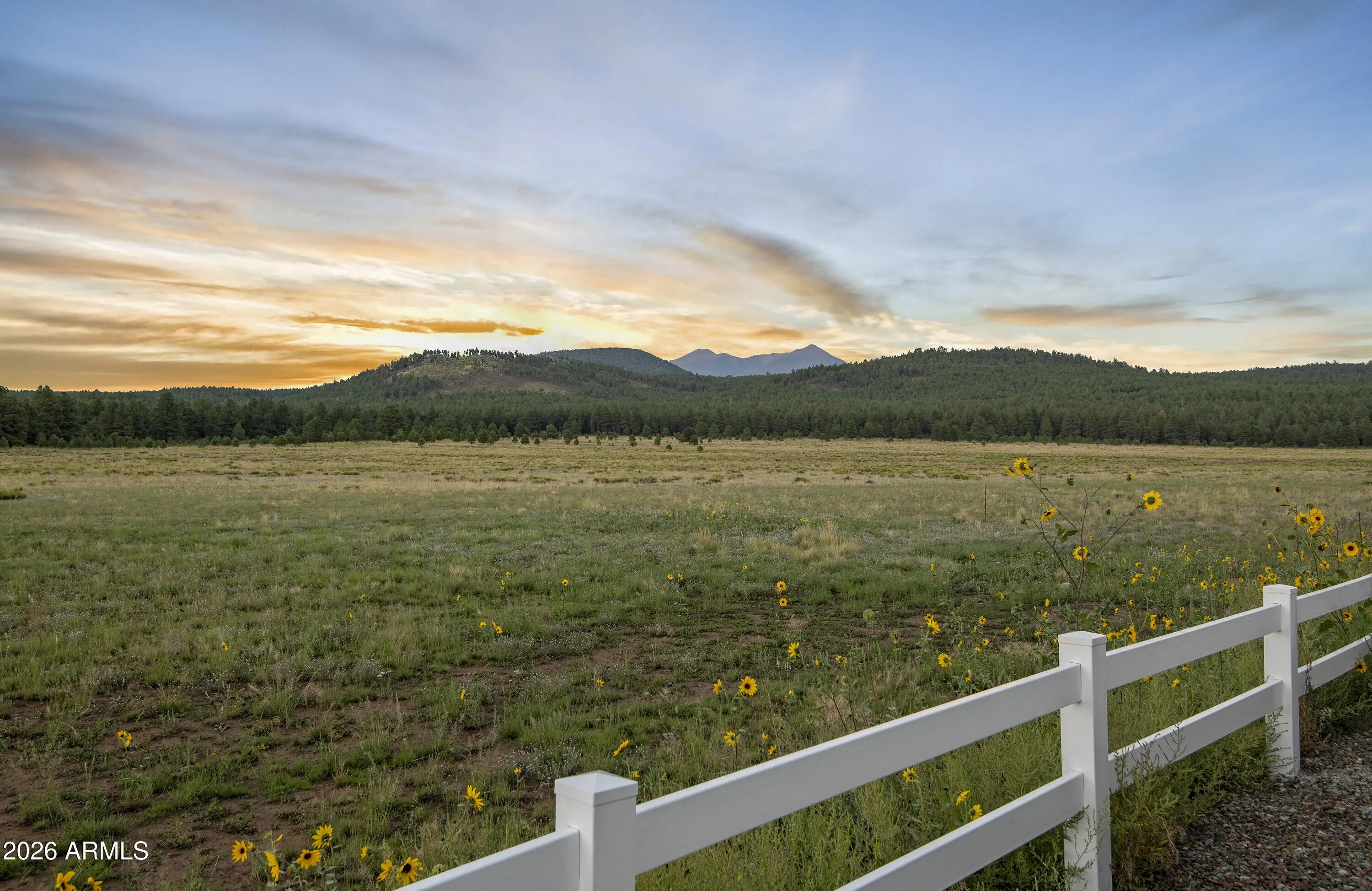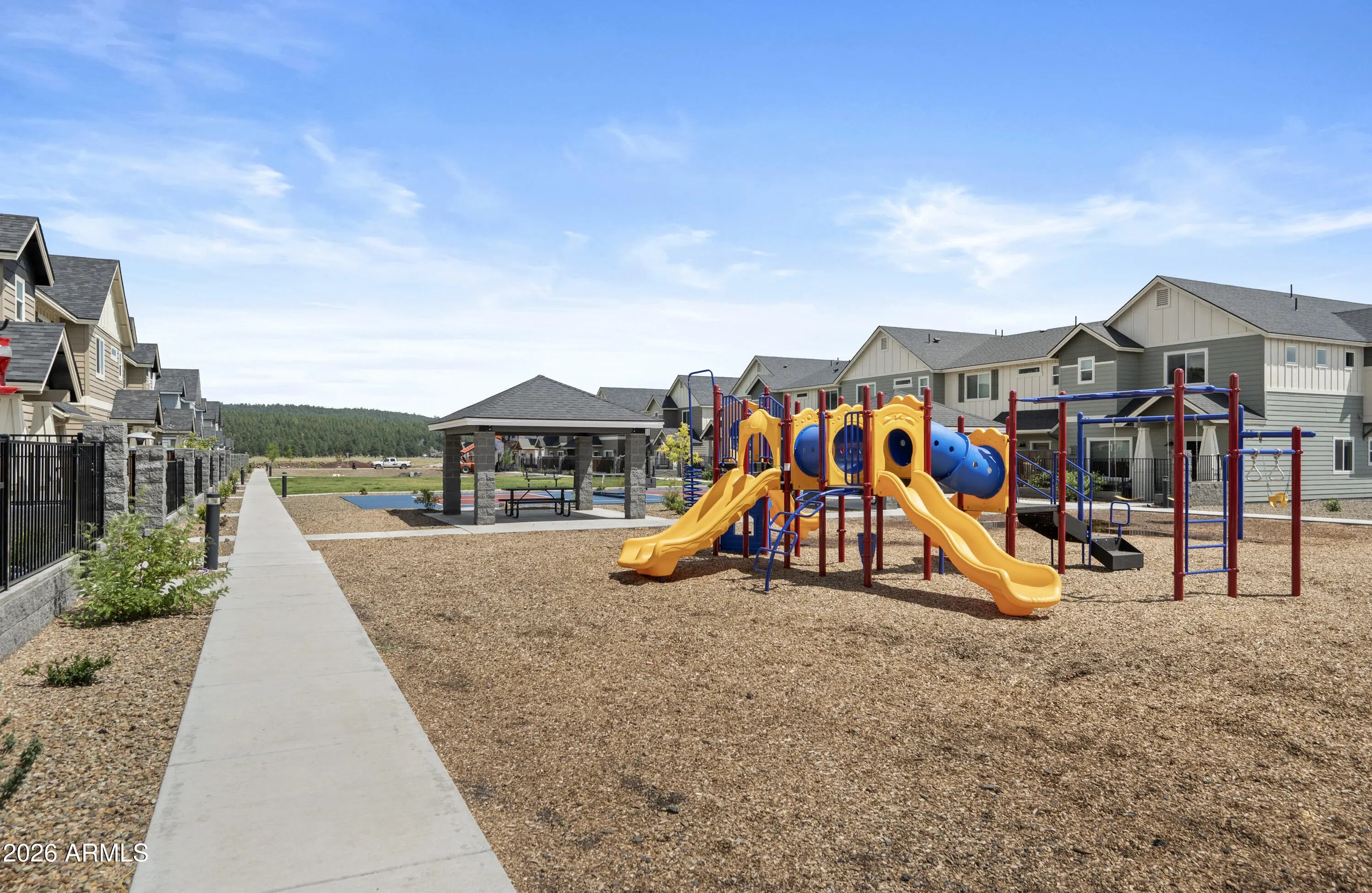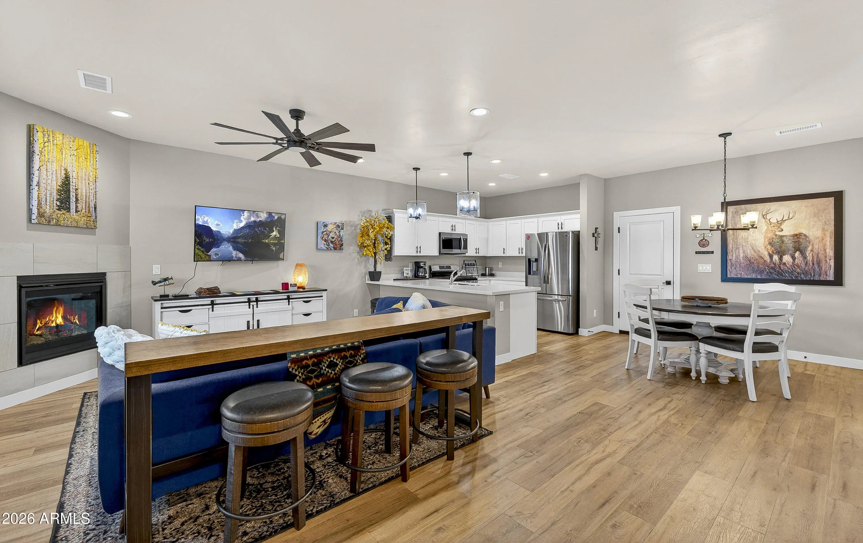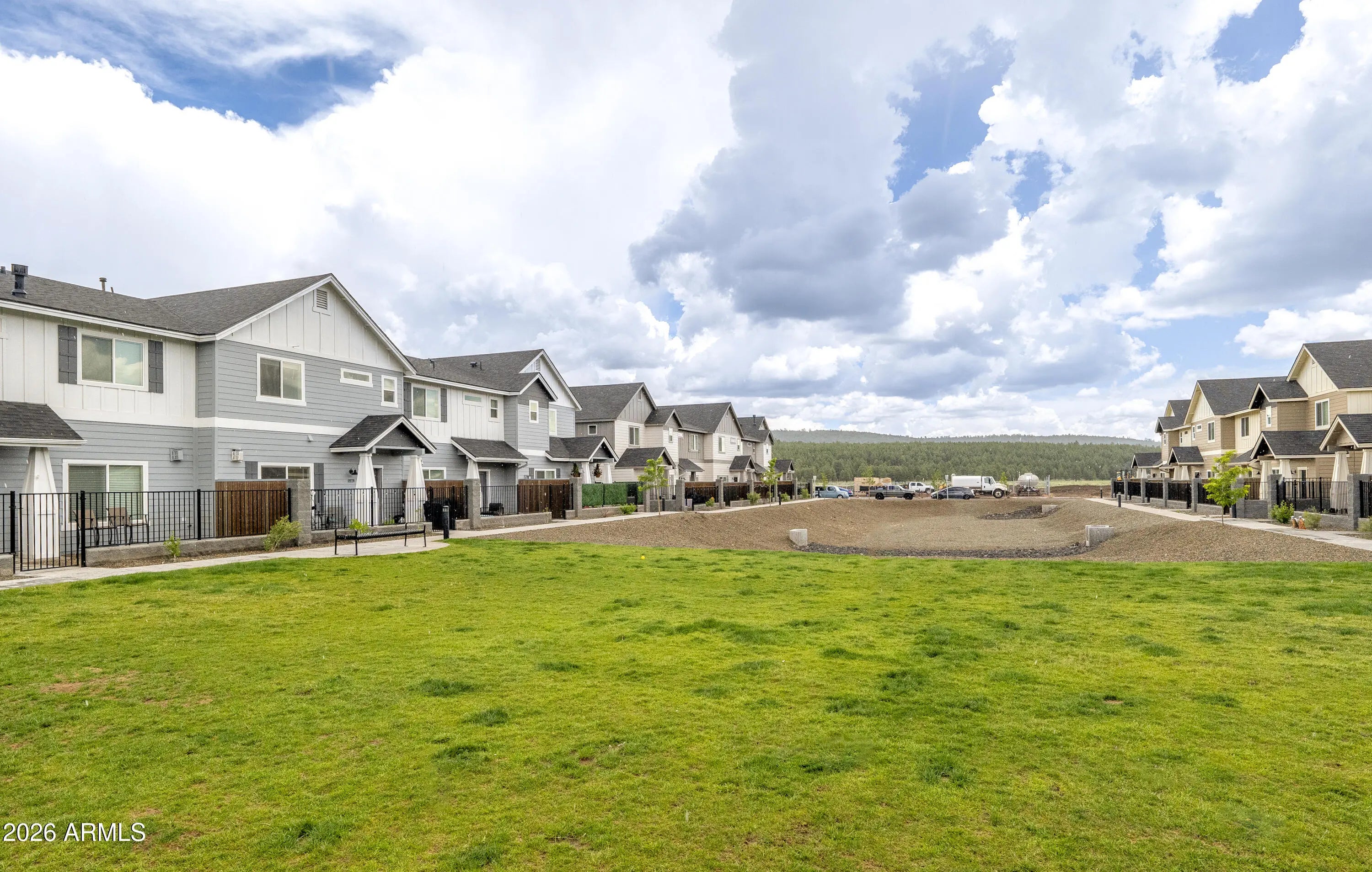Backing directly to the Coconino National Forest with views of the San Francisco Peaks, this townhome built in 2021 offers privacy, scenery, and everyday comfort. Inside, you'll find thoughtful upgrades throughout, including two fireplaces (living room and primary suite), quartz countertops in the kitchen and bathrooms, stainless steel appliances, shaker-style cabinetry with soft-close drawers and doors, tile surround shower and barn door in primary bathroom. 2x6 construction & spray foam insulation for enhanced energy efficiency and year-round comfort. An oversized two-car garage with epoxy floors, and the gated, fenced front yard adds both function and charm. Community playground, picnic gazebos, pickleball court, and dog park! Move-in-ready forest-backed living with Peak views!