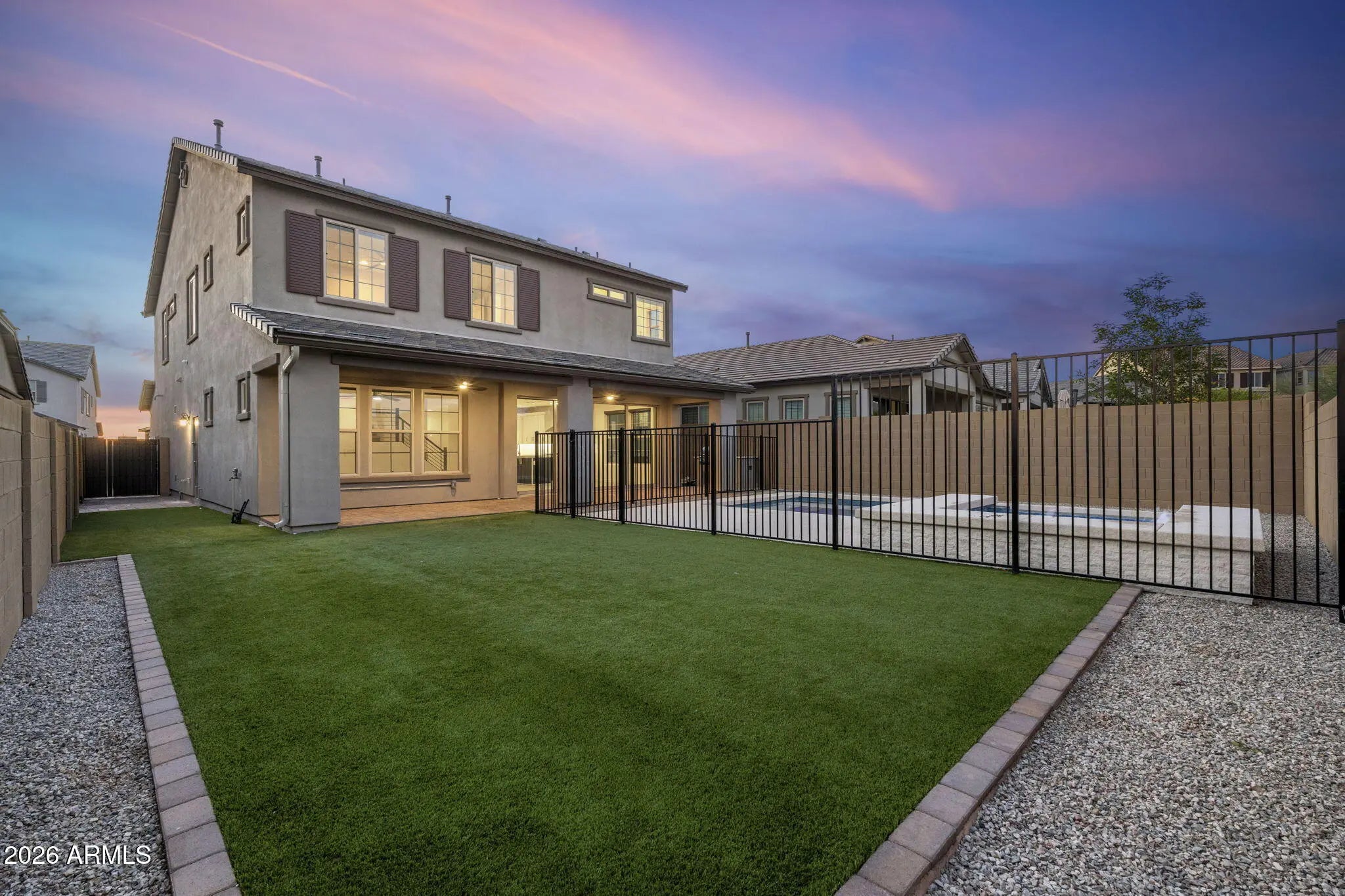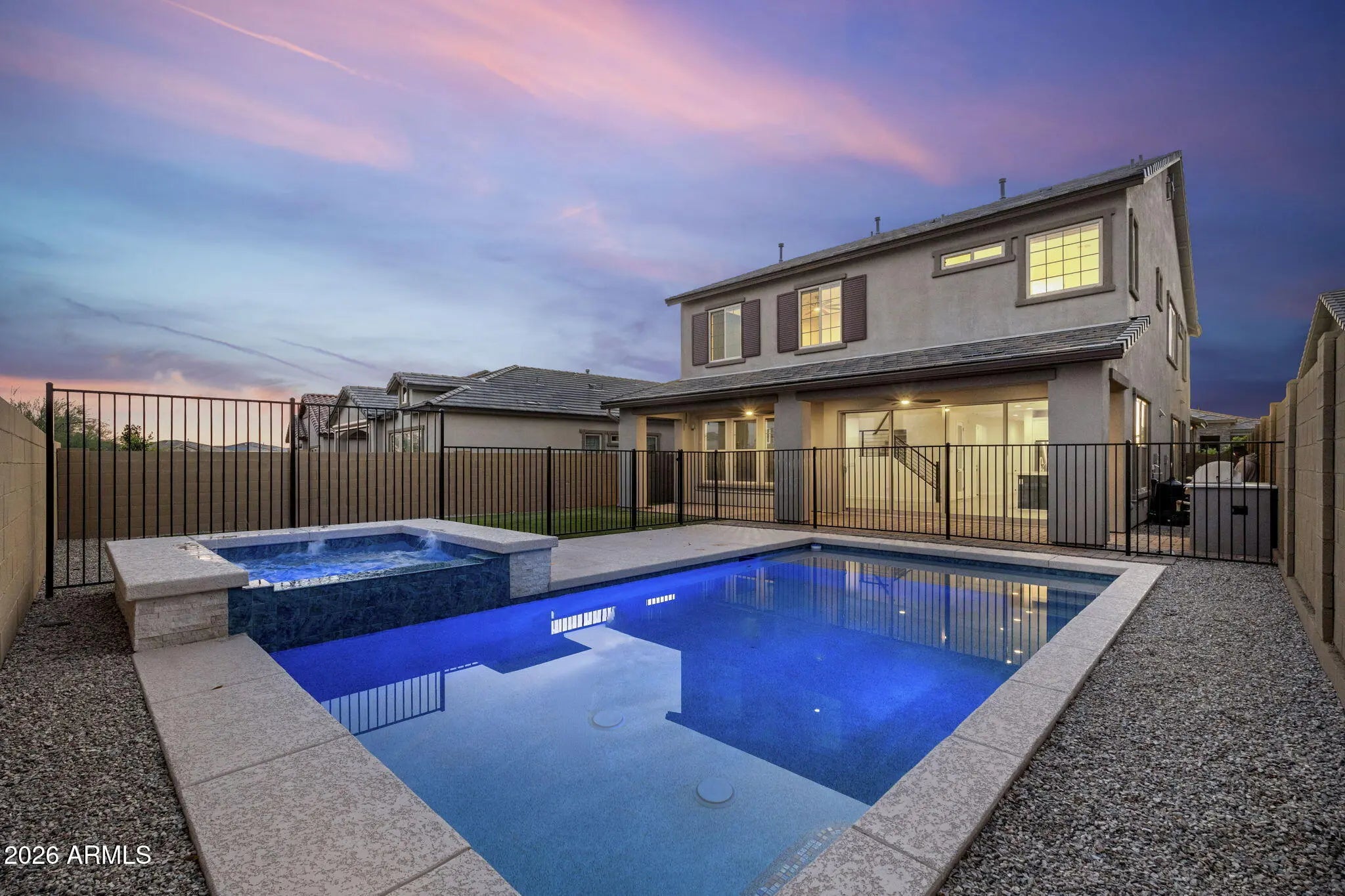 Welcome to this stunning two-story residence nestled in the highly sought-after Desert Ridge community of North Phoenix. Thoughtfully designed and impeccably built, this 5 bed, 4.5 bath home seamlessly blends sophisticated indoor living with the effortless beauty of the Arizona outdoors. Step inside to discover a spacious great room featuring pocket doors that open completely, creating a breathtaking indoor/outdoor living experience perfect for entertaining or quiet desert evenings. The main level offers a dedicated bedroom and full bathroom--ideal for guests or multigenerational living--along with elegant formal dining area that set the stage for memorable gatherings. Large, spacious kitchen with all stainless-steel appliances. Big center island with eat-up bar seating. Plenty of storage space to utilize. Upstairs, the expansive primary suite serves as your private retreat, complete with a generous walk-in closet and a luxurious full bathroom with a walk-in shower and soaking tub. Additional guest bedrooms, a versatile loft area, and a convenient upstairs laundry room round out the upper level with thoughtful functionality. The backyard is nothing short of spectacular. A fenced-in pool and spa sit alongside a lush grassy area, all backed by unobstructed views with no neighbors behind you--offering rare privacy and tranquility. Location elevates this home even further. Desert Ridge Marketplace, the world-renowned Musical Instrument Museum, and Mayo Clinic Hospital are all just minutes away, while Arizona Horse Lovers Park provides nearby outdoor recreation. This is North Phoenix living at its finest. Experience the lifestyle this exceptional property delivers!