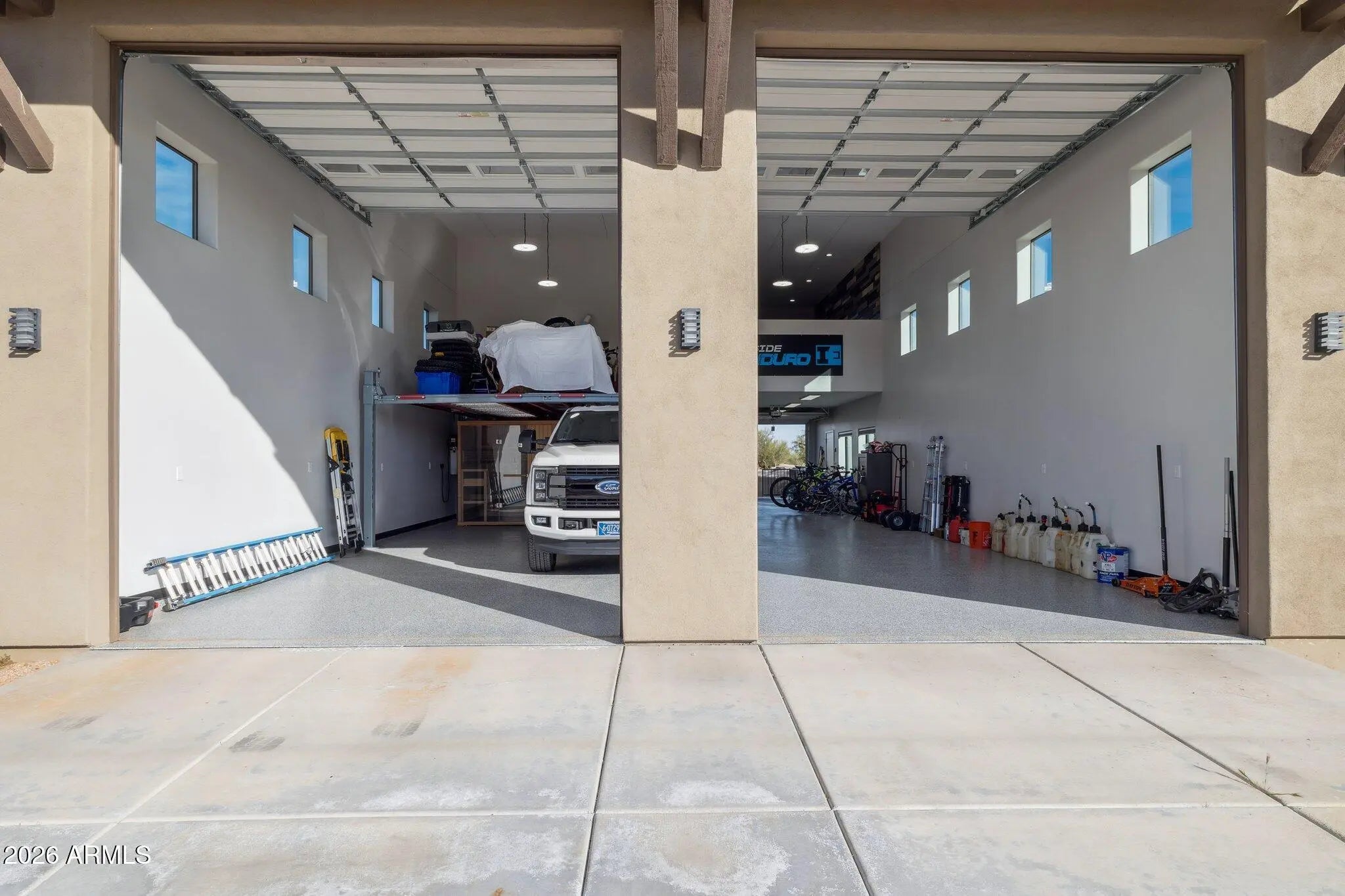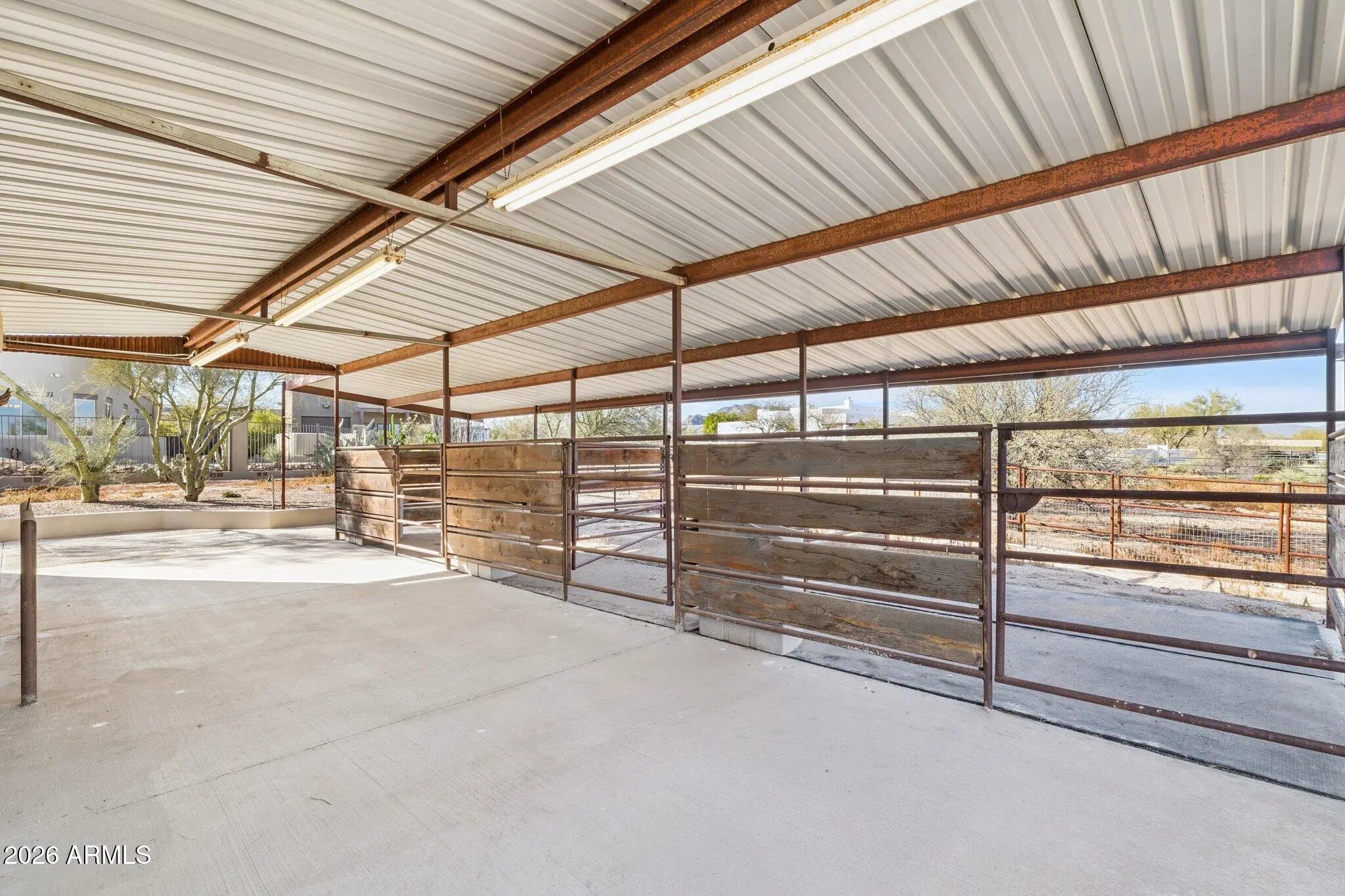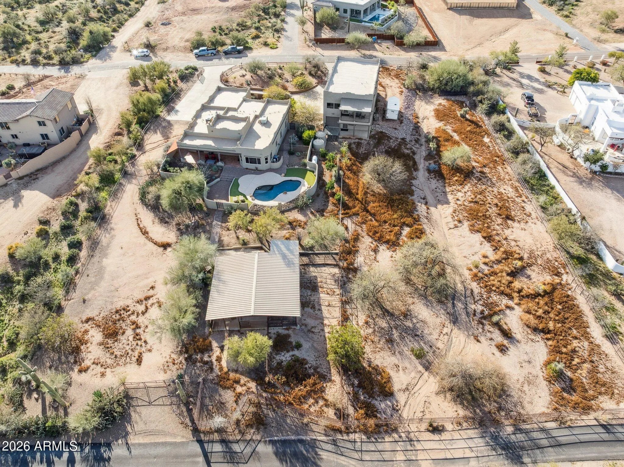 Live where your adventures begin - no trailering required. Located in North Scottsdale's rural community of Rio Verde Foothills, this rare 2-acre property offers the convenience of paved streets while still providing ride-out access to dedicated mountain bike and equestrian trails leading toward Granite Mountain and the McDowell Sonoran Preserve, plus easy OHV access into the Tonto National Forest. Designed for both recreation and relaxation, the home welcomes you through a charming courtyard entry and showcases authentic Arizona character with Santa Fe-style wood beam accents and inviting indoor-outdoor living spaces. Built for the off-road and horse enthusiast, the impressive 30' x 60' shop features dual 14' doors, a 16' x 16' vehicle lift, 1.5 baths, laundry room, and approx. 560 SF of finished living quarters opening to a covered patio deck with sweeping 360° desert and mountain views. The main home offers 4 bedrooms and 2 bathrooms, including a bedroom with private exterior entrance ideal for guests, office, or multigenerational living. The spacious primary suite features a large walk-in closet and a soaking tub - the perfect place to unwind after a day on the trails. Outside, enjoy a heated pool, mature saguaros, and citrus trees set against wide open desert skies. Equestrian facilities include a 36' x 36' 5-stall mare motel with runs, wash rack, tack room, lighting, electricity, and water. The property is serviced by a strong producing shared well with two 1,500-gallon storage tanks and is thoughtfully designed for full drive-through trailer access from 140th Street to 140th Place and ample parking. After the ride, rinse off at the elevated bike wash station and relax under the Arizona sunset. This is more than a home - it's a private desert basecamp for the Arizona lifestyle.
