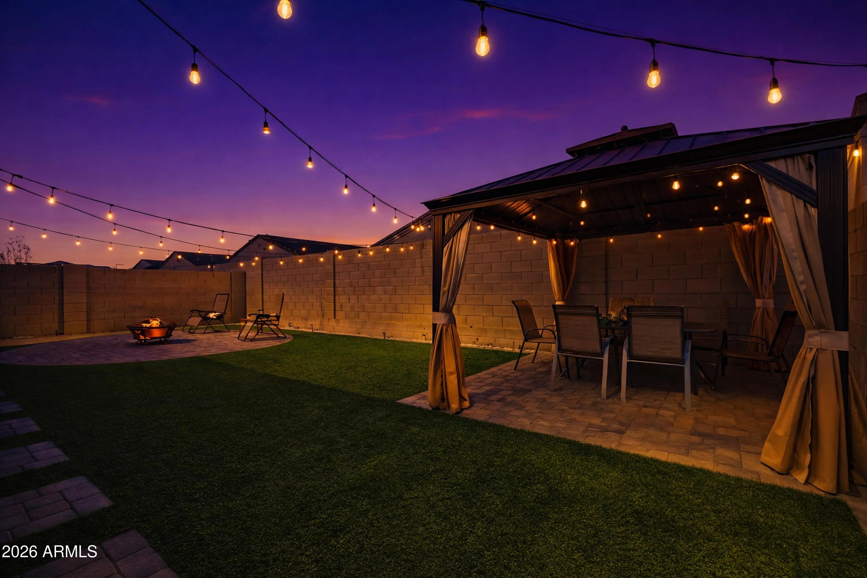 Beautiful 4 bed, 2 bath home built in 2022 with a resort-style backyard that truly sets it apart. The outdoor space features overhead string lighting, artificial turf with custom paver design, a large circular paver pad ideal for a fire pit, above ground pool, or hot tub, & a spacious gazebo perfect for entertaining. Enjoy evening ambiance under the string lights & stay cool with a mister system on the covered patio. Gutters have been installed around the entire home for added protection. Inside, the home offers an open floor plan with granite countertops, stainless steel appliances, tile flooring in main living areas, & carpeted bedrooms. Smart home features include a video doorbell, smart thermostat, & smart lock. Low-maintenance, move-in ready, & thoughtfully upgraded inside and out.