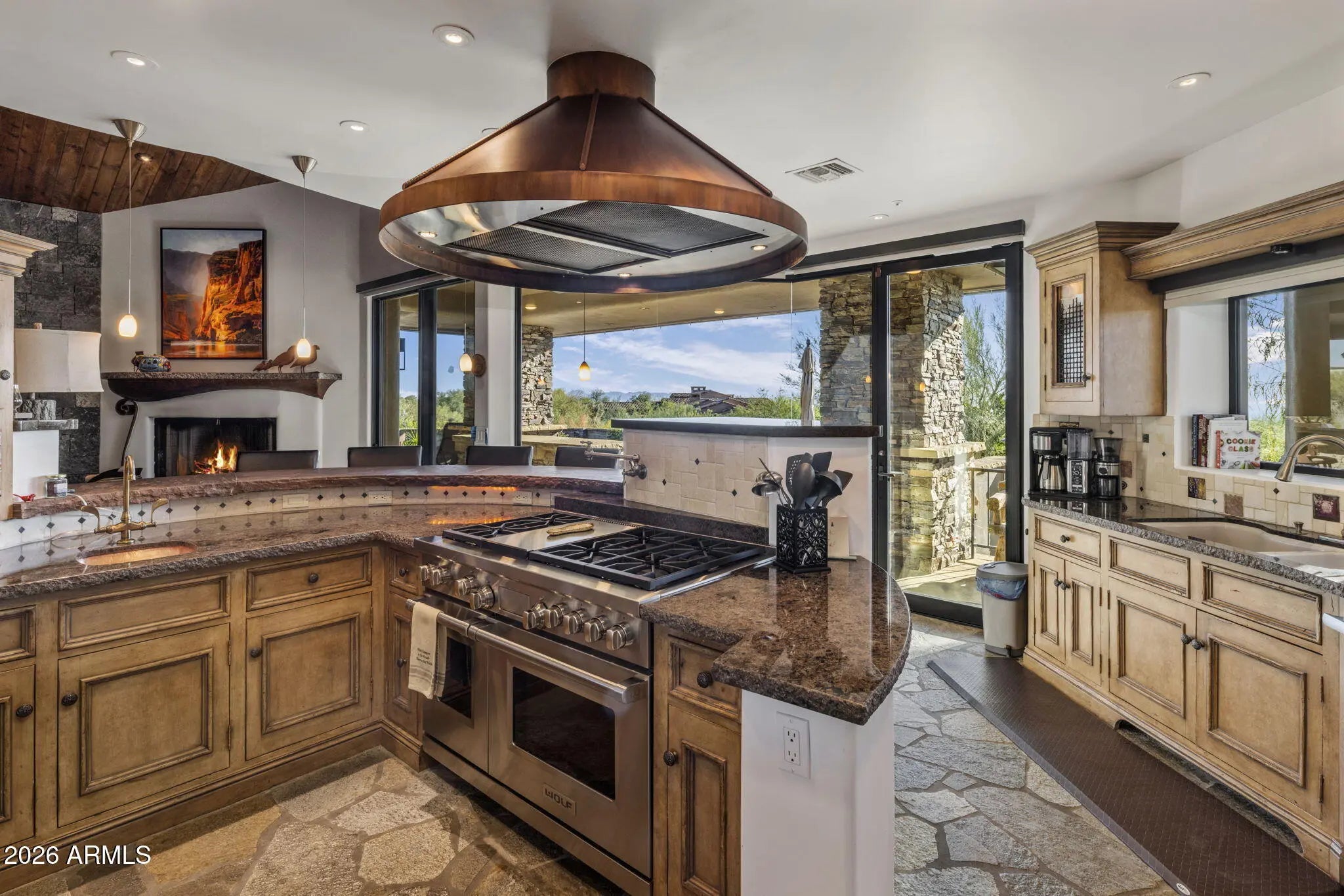 GOLF OR SOCIAL MEMBERSHIP AVAILABLE. This luxurious custom home blends Old World charm with modern finishes, featuring granite and marble countertops. The elegant primary suite pairs beautifully with an expansive chef's kitchen. A main-floor office and a convenient fifth bedroom add flexibility. 4 gas fireplaces: Master, living, family, and lower level TV room. The lower level offers a pool table, bar, three additional bedrooms with generous seating, plus outdoor amenities including a built-in barbecue, solar-heated pool and spa, fire pit, and cabana--ideal for entertaining or hosting guests. Enjoy stunning city-light and sunset views, nearby trails to the Sonora Fitness Center, and full access to Desert Mountain's seven + dining options, restaurants, championship golf, tennis and pickleball courts, bocce, private hiking trails, and fitness center.