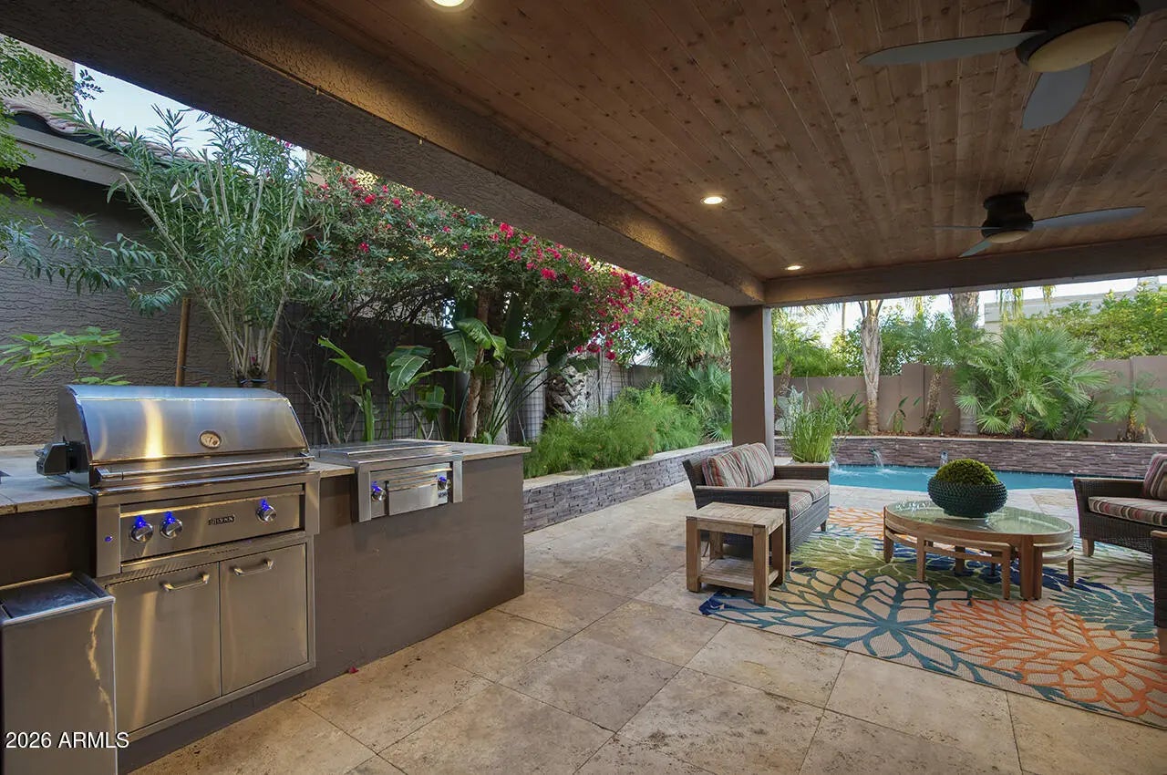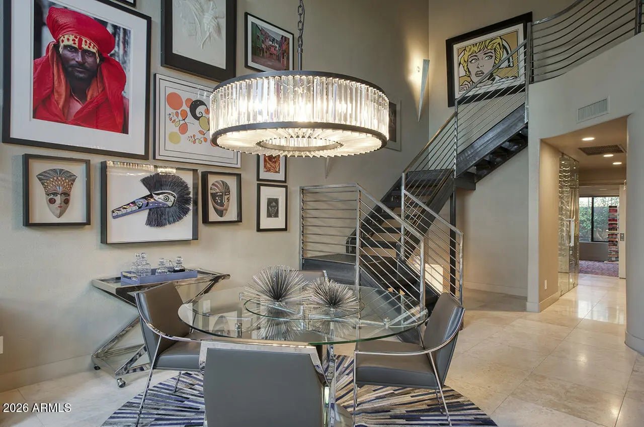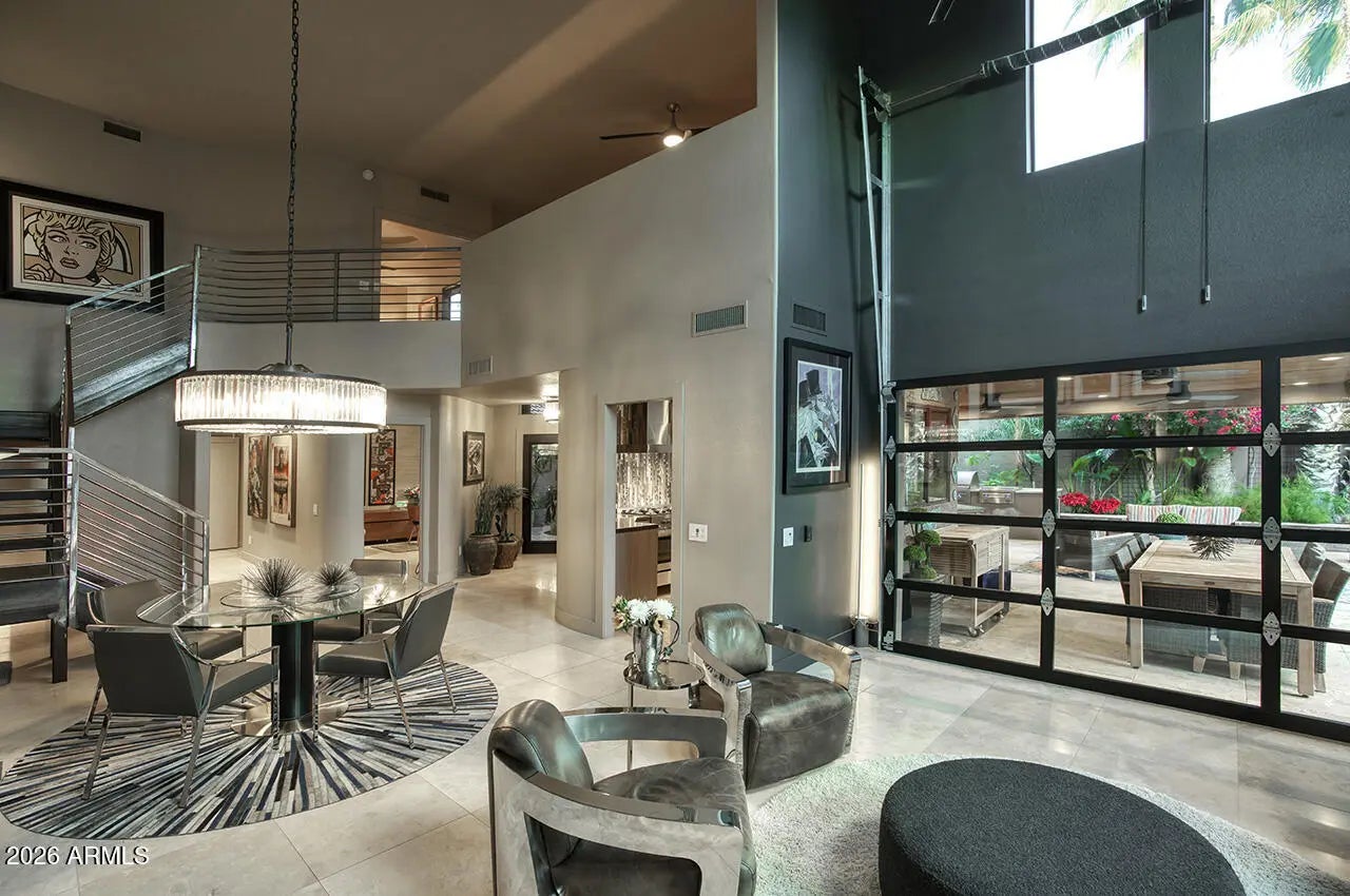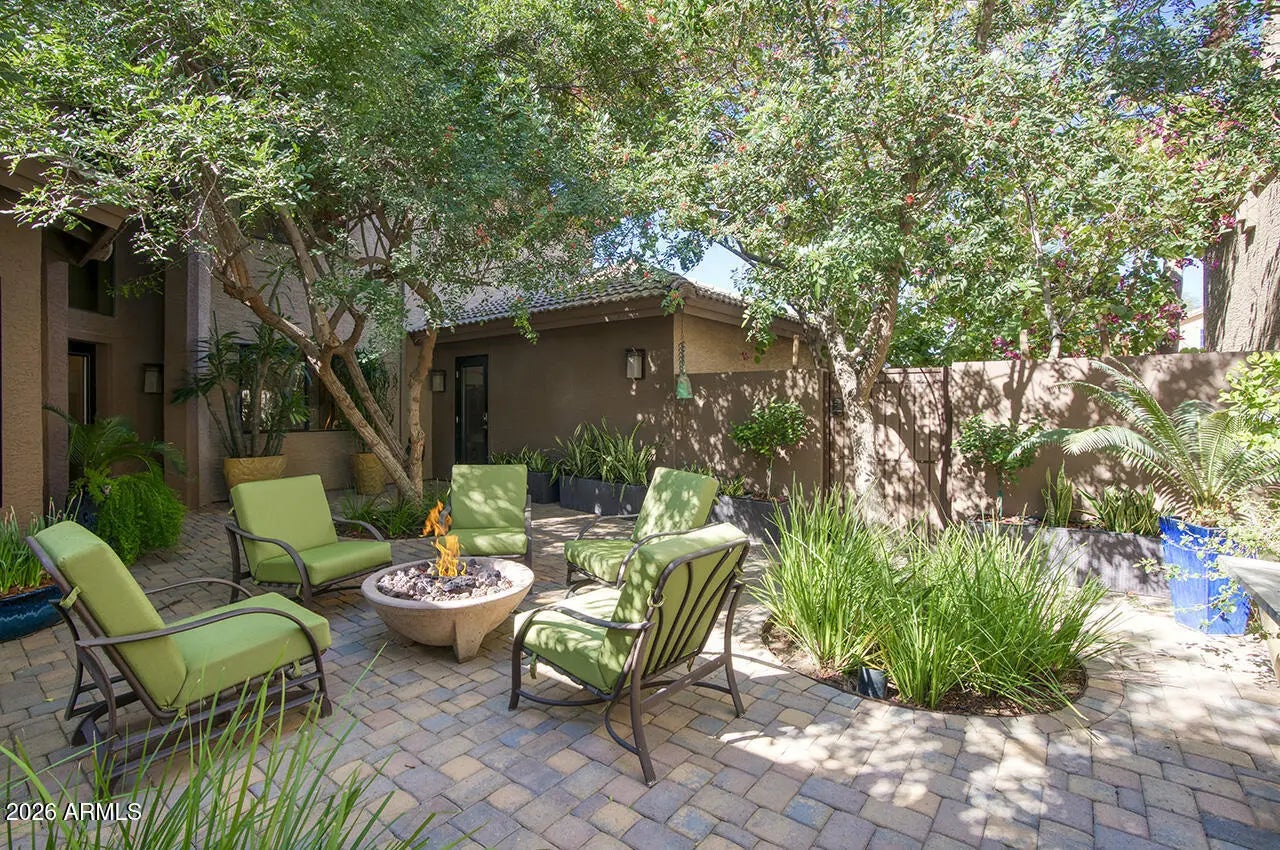 An exceptional designer-owned opportunity in a prime North Scottsdale location, this fully renovated courtyard-entry residence is set within a highly desirable community offering both tranquility and convenience. Thoughtfully reimagined the home delivers refined modern living in a coveted setting. A lush, serene courtyard welcomes you into an interior defined by curated finishes and intentional design throughout. The light-filled family room features a sleek linear gas fireplace, distinctive lighting, and seamless indoor-outdoor connection. An industrial-style garage door opens the living space to the expansive covered patio, creating an effortless Arizona indoor-outdoor lifestyle ideal for both everyday living and entertaining. The kitchen is a striking design centerpiece, showcasing sleek flat-panel cabinetry, glass display cabinets, and full-height vertical tile walls that add architectural interest. A Verona Italian dual-fuel range with double ovens and a five-burner gas cooktop anchors the space, delivering both performance and visual appeal. Designed with entertaining in mind, the home also features a dramatic 300-bottle refrigerated wine wall, offering a refined statement element that complements the home's modern aesthetic and elevated lifestyle. Upstairs, the private primary suite serves as a serene retreat, complete with a sitting area and spa-inspired bath featuring an oversized glass-enclosed shower, dual vanities, and an extensive wardrobe closet designed for both style and organization. Outdoors, the private backyard sanctuary has been designed for year-round enjoyment. An expansive covered patio with tongue-and-groove ceiling, misters, and a custom outdoor kitchen overlooks a tranquil setting complete with a saltwater pool, fire pit, and covered above-ground spa. Thoughtful orientation allows for enjoyment of morning sun and relaxing afternoons, while mature landscaping enhances privacy and creates a true resort-style atmosphere. Beautifully remodeled, designer-owned, and ideally located, this North Scottsdale residence presents a rare opportunity to enjoy modern luxury, seamless indoor-outdoor living, and a lifestyle that is both elevated and effortless.